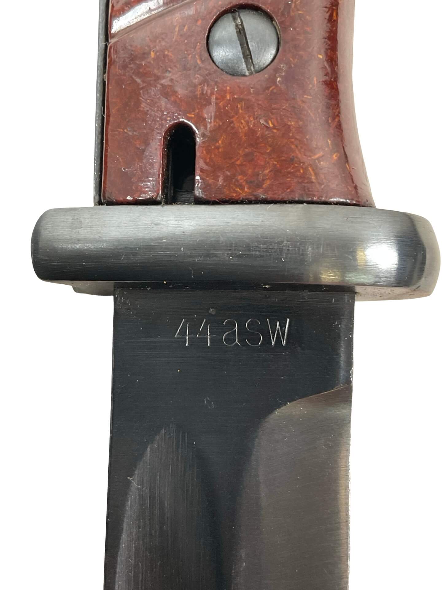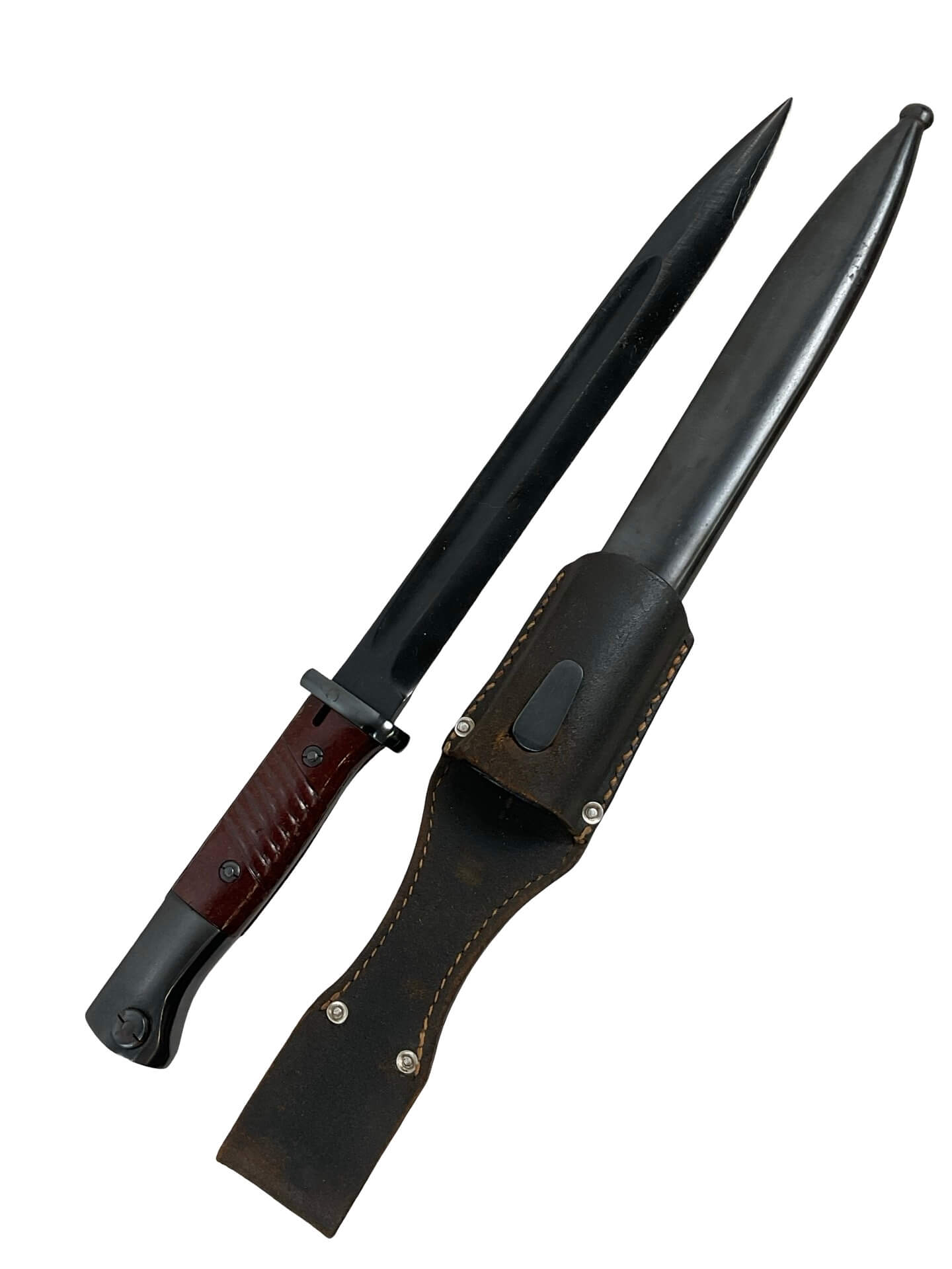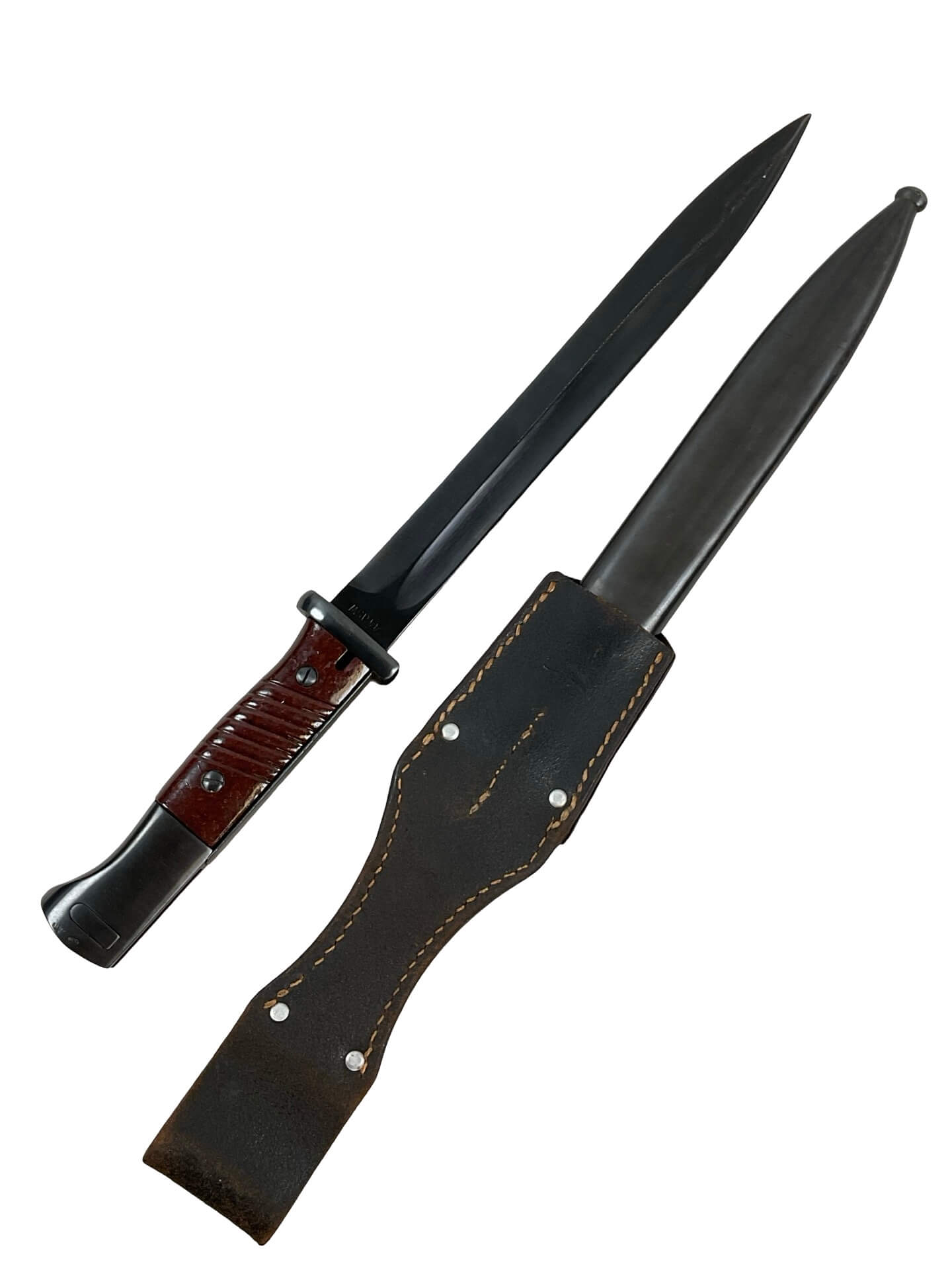 This listing features a World War II German K98 bayonet, complete with its original leather frog. The bayonet and scabbard display matching serial numbers, indicating they have remained together since original issue. Both items are dated 1944, and the blade is marked with the manufacturer’s code “ASW,” identifying it as production from E. & F. Hörster, Solingen, a recognized supplier of edged weapons to the German military during the period. The bayonet was designed specifically for use with the Karabiner 98k rifle, the standard-issue service rifle of the German armed forces in the Second World War. The blade exhibits the typical fuller on both sides, while the grips are made from ribbed Bakelite or hardwood, as issued in late-war production. This set is typical of late-war German military equipment, reflecting wartime material and manufacturing adaptations. The included frog is the appropriate style for this era and model, supporting secure carry on a standard German field belt.
