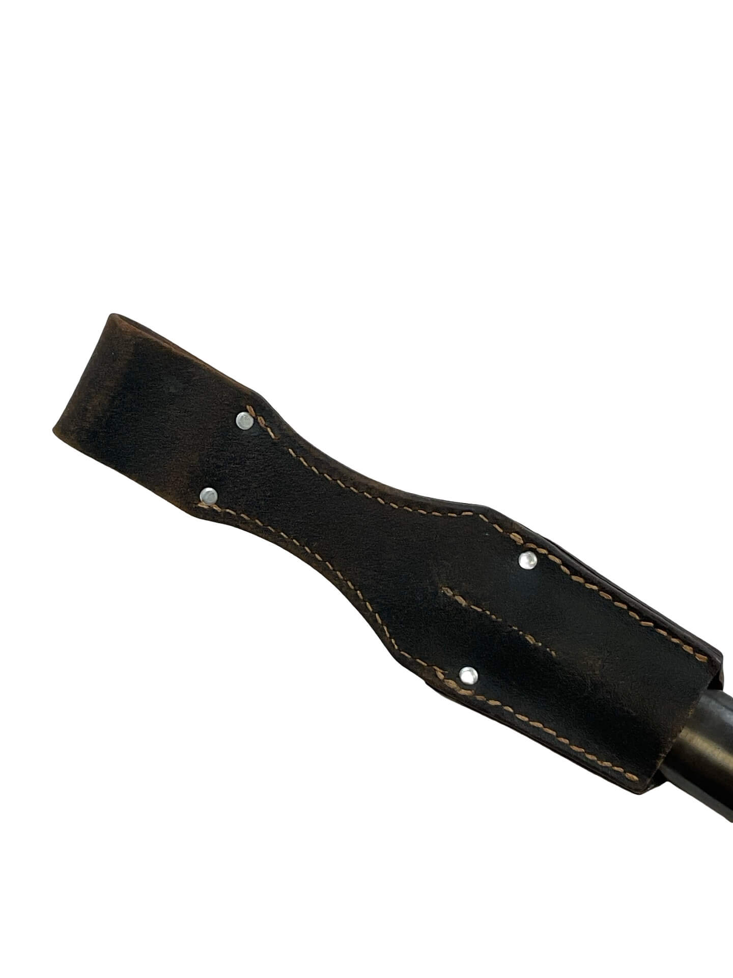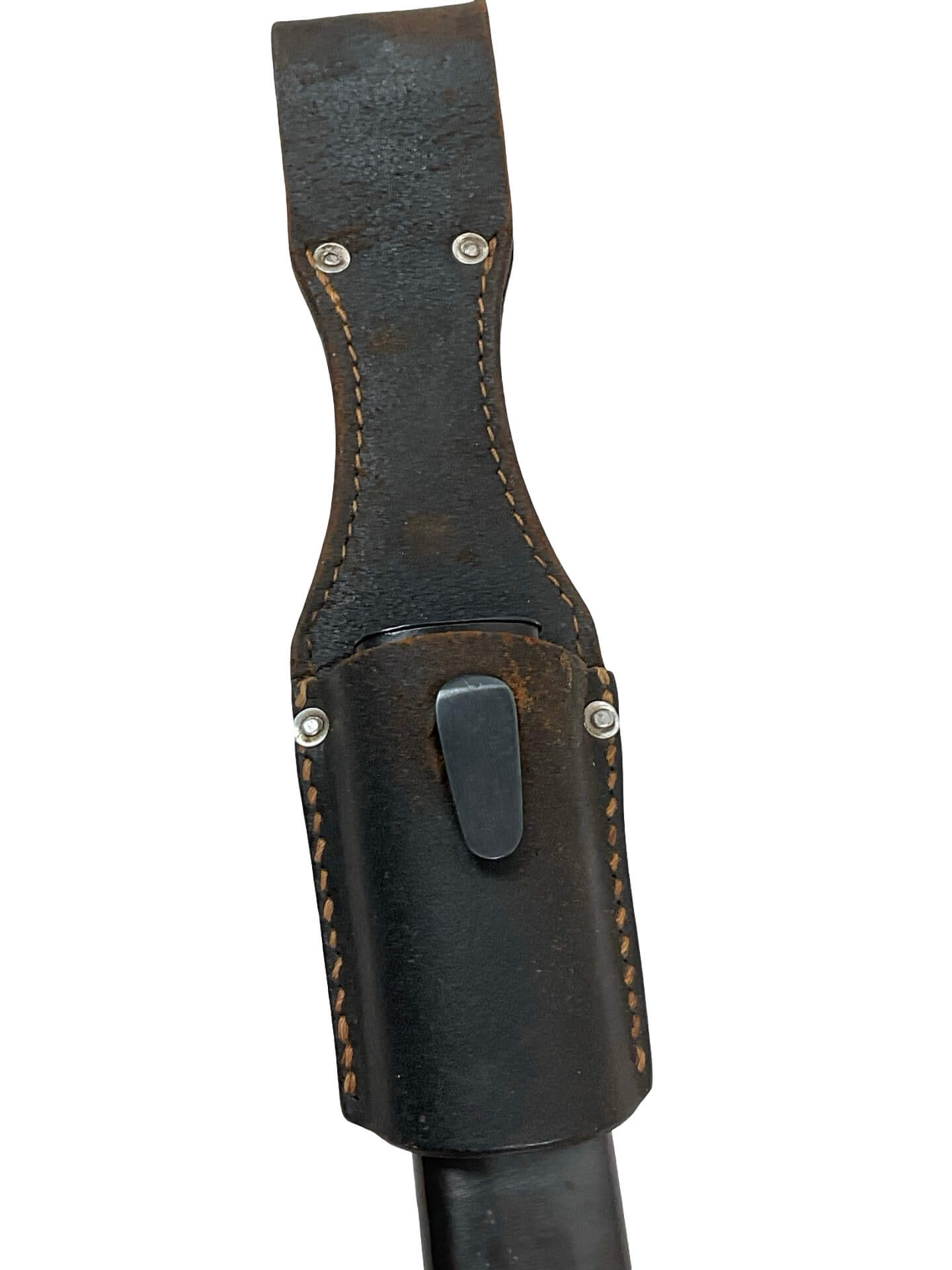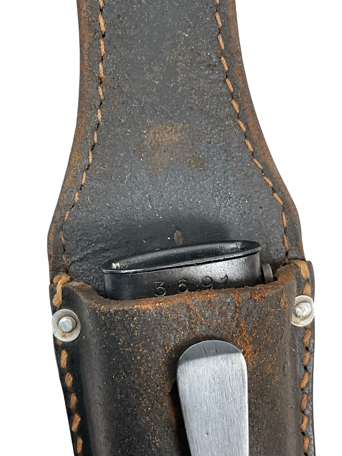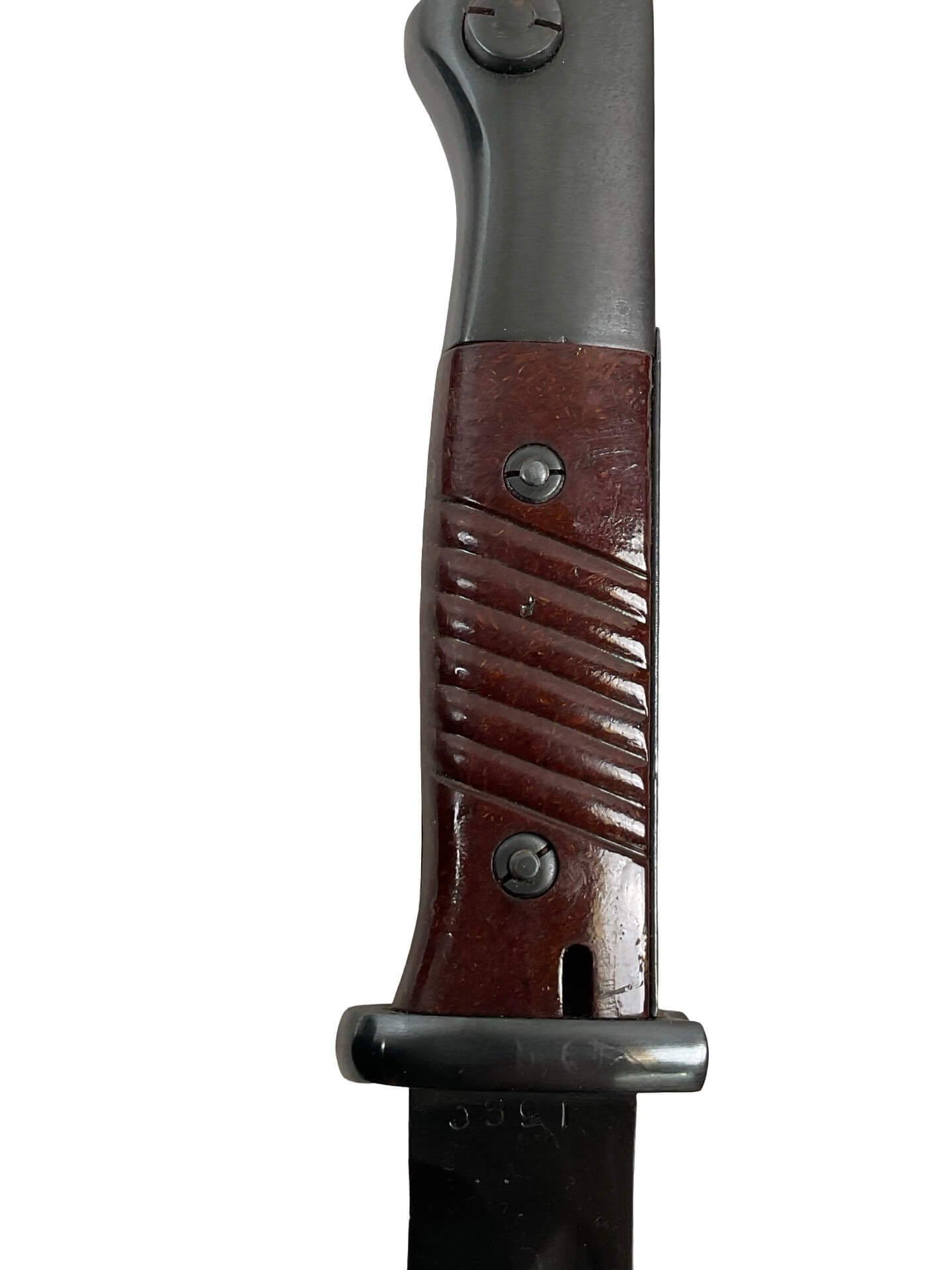 This listing features a World War II German K98 bayonet, complete with its original leather frog. The bayonet and scabbard display matching serial numbers, indicating they have remained together since original issue. Both items are dated 1944, and the blade is marked with the manufacturer’s code “ASW,” identifying it as production from E. & F. Hörster, Solingen, a recognized supplier of edged weapons to the German military during the period. The bayonet was designed specifically for use with the Karabiner 98k rifle, the standard-issue service rifle of the German armed forces in the Second World War. The blade exhibits the typical fuller on both sides, while the grips are made from ribbed Bakelite or hardwood, as issued in late-war production. This set is typical of late-war German military equipment, reflecting wartime material and manufacturing adaptations. The included frog is the appropriate style for this era and model, supporting secure carry on a standard German field belt.