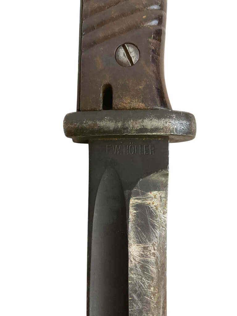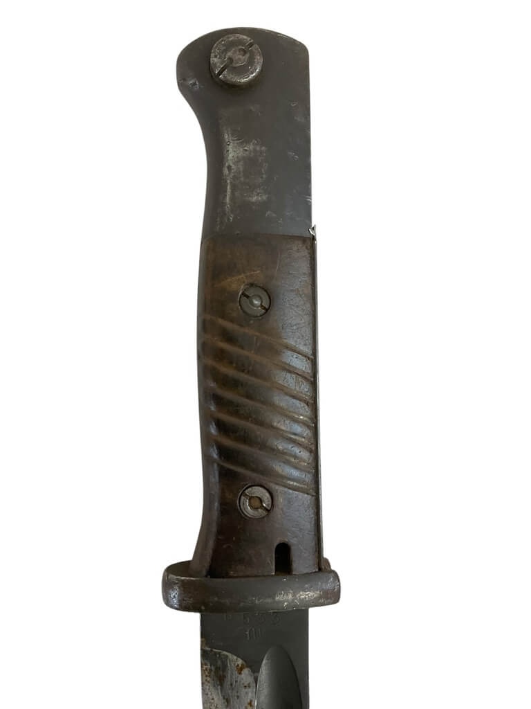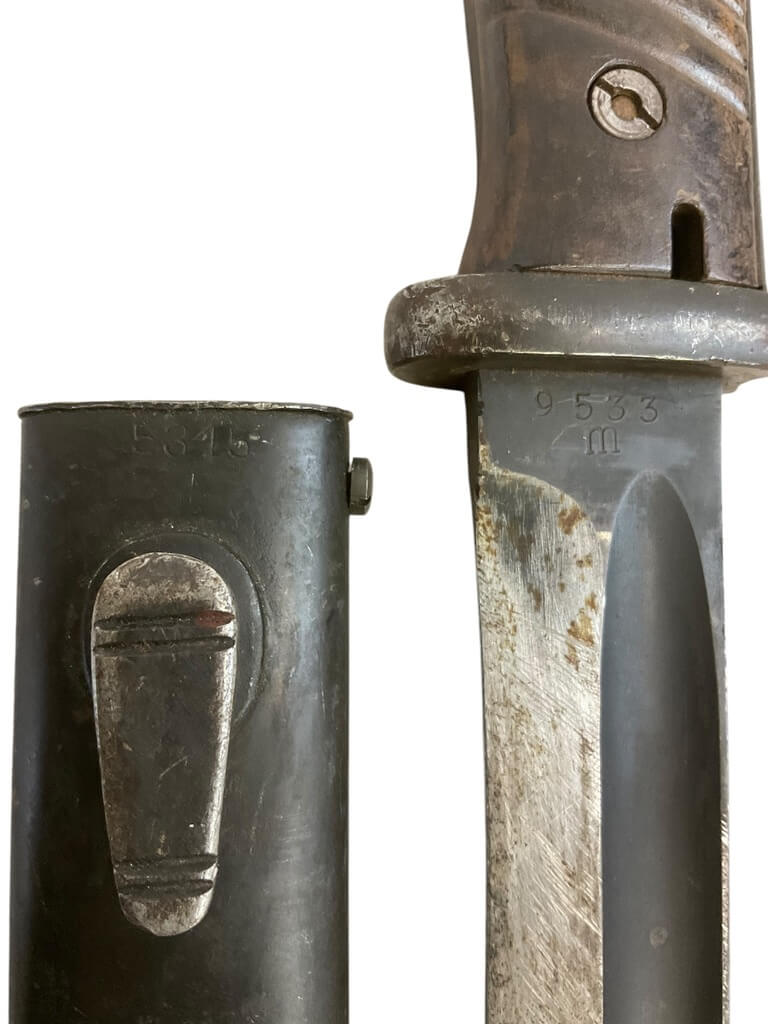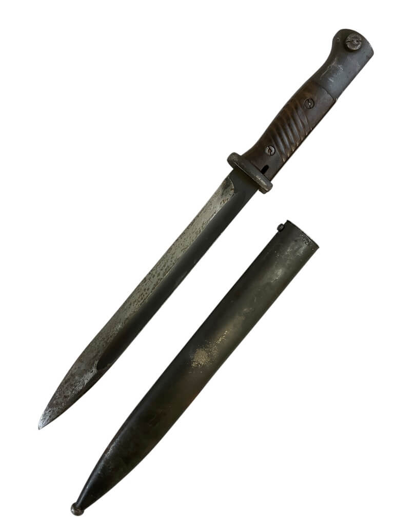 This item is a WW2 German K98 Bayonet with Scabbard, dated 1938. It’s a significant piece of military history, having been used during one of the most pivotal periods in modern history. The bayonet and scabbard are not matching, indicating that they may have been paired at some point during the war or subsequent years. This could add to the intrigue for collectors. The K98 bayonet is an iconic piece of German military equipment, known for its robust design and functionality. The scabbard provided protection for the blade and allowed the bayonet to be carried safely when not in use. Despite the mismatch, both pieces are authentic and represent an intriguing snapshot of WW2 history. This set would make an excellent addition to any military memorabilia collection or for a history enthusiast.