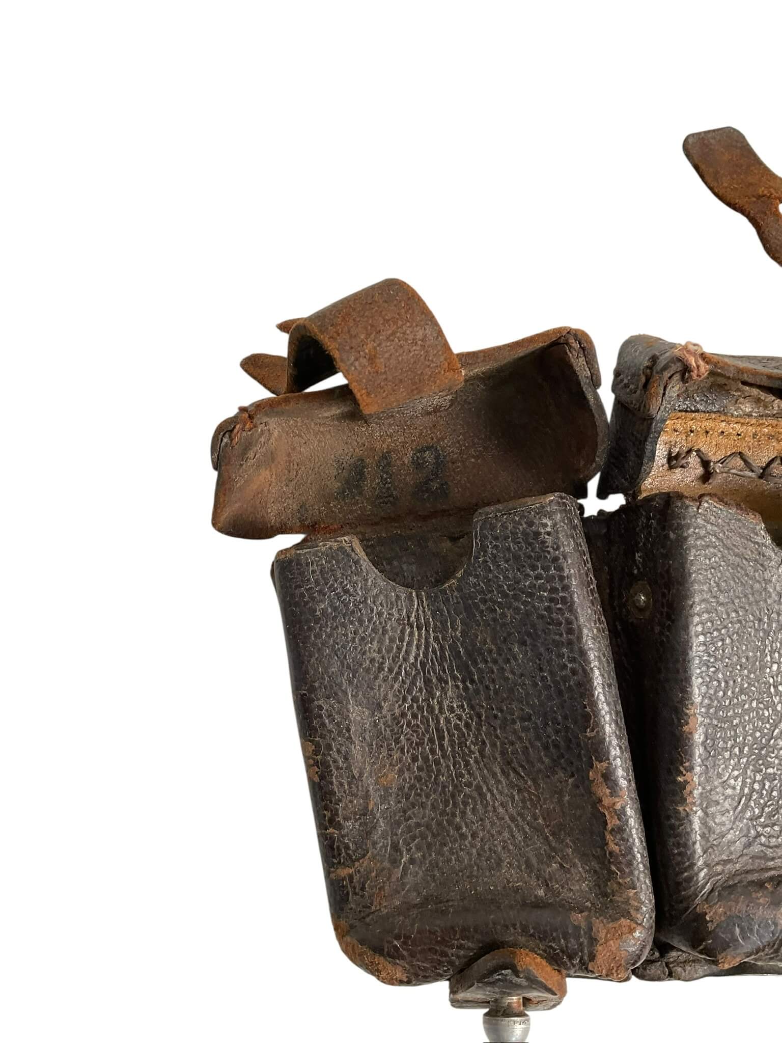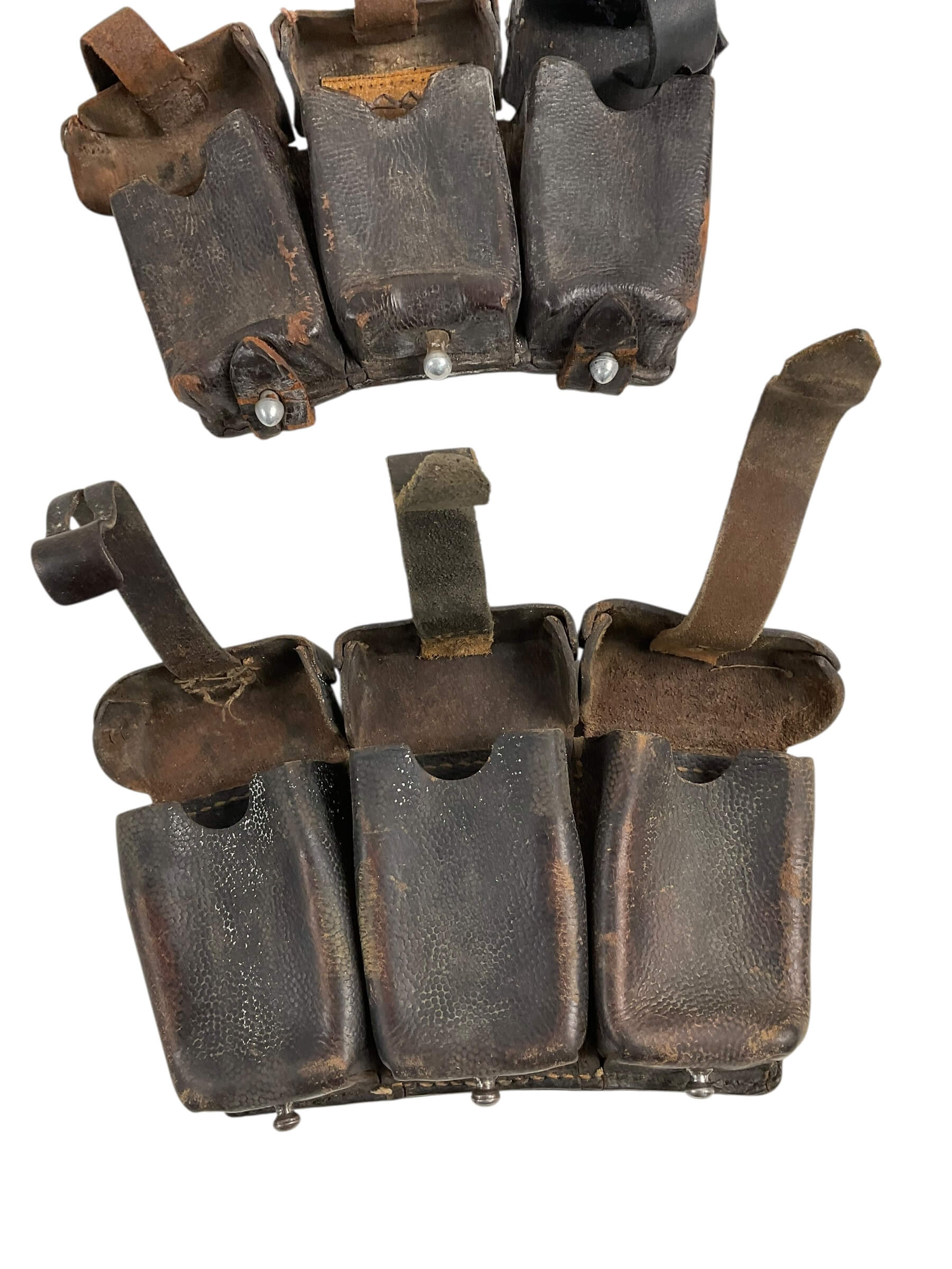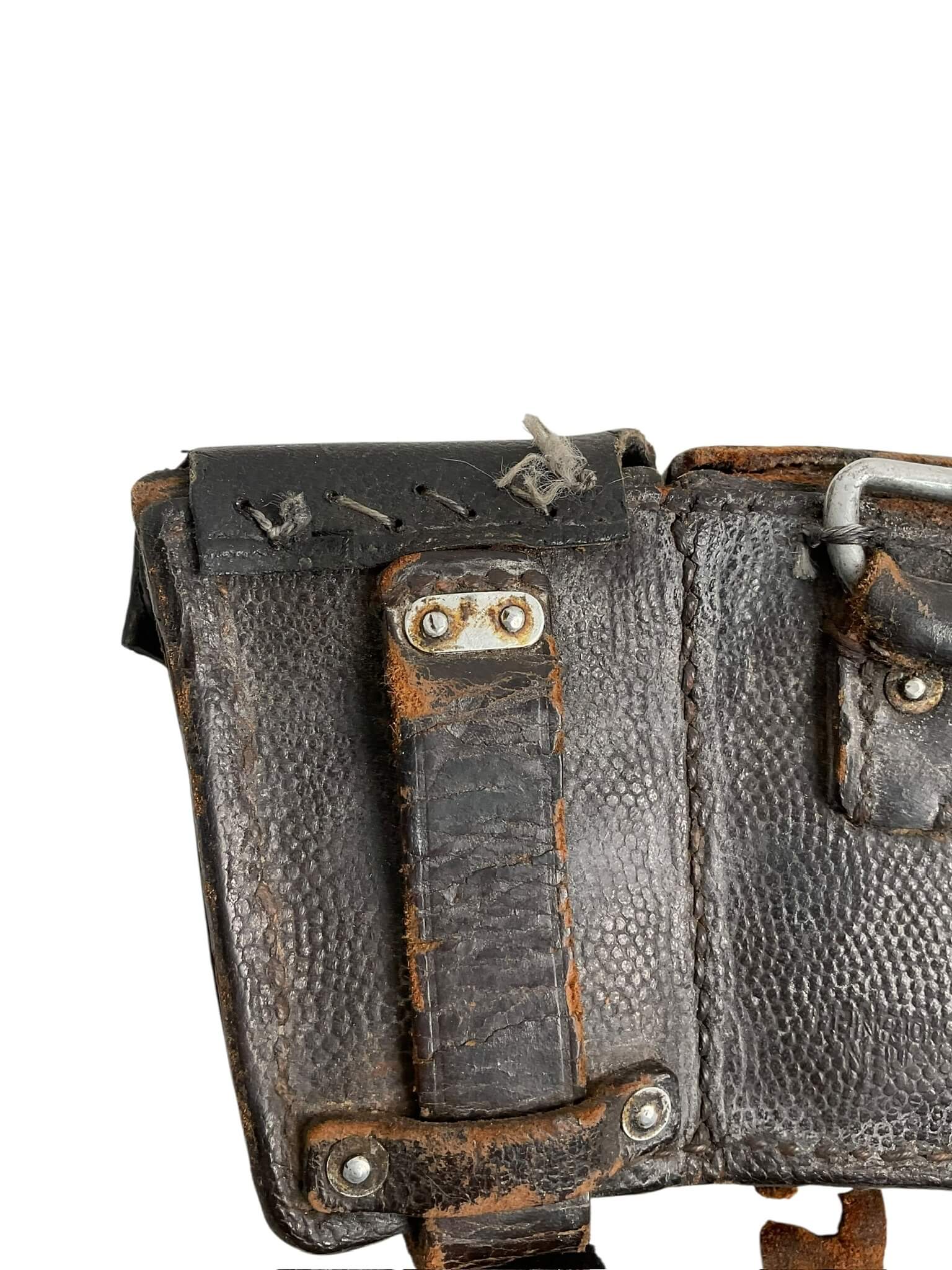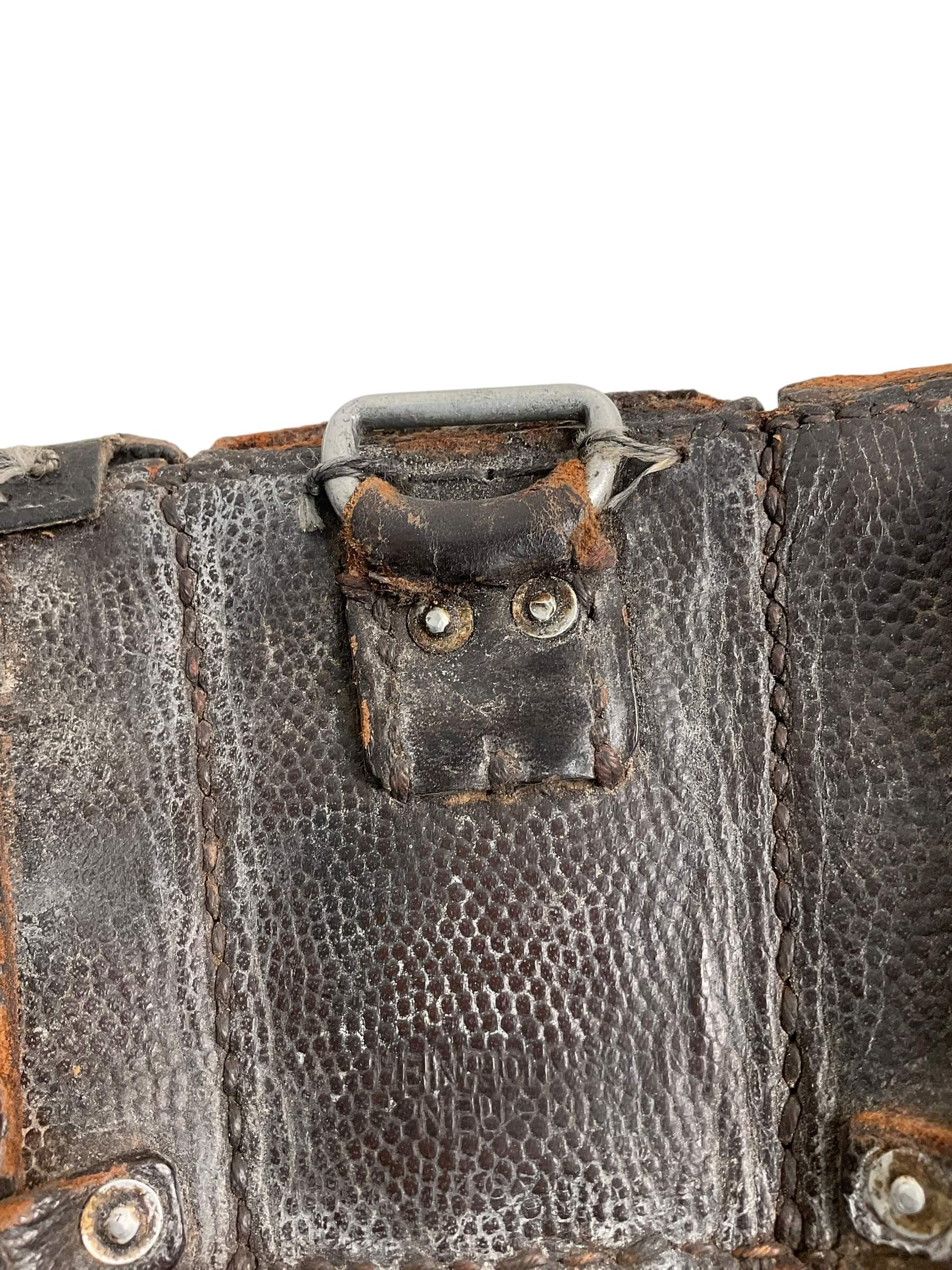 The WW2 German K98 Leather Ammo Pouches dated 1943 are standard-issue military accessories used by German infantry during the Second World War. Each pouch is typically constructed from black or brown leather and consists of three separate compartments, designed to hold 15 rounds of 7.92×57mm Mauser ammunition for the Karabiner 98k rifle. The pouches feature reinforced stitching, metal fittings, and flaps secured by leather straps and metal buttons. On the reverse, there are belt loops for attachment to the standard German military belt. The year “1943” is stamped on the rear side or under the lid, often accompanied by the manufacturer’s code or name. These pouches were widely issued to Wehrmacht and Waffen-SS soldiers throughout the war. Their robust construction and utilitarian design reflect the requirements of frontline service. Surviving examples provide insight into the material culture and logistical practices of the German armed forces during World War II.