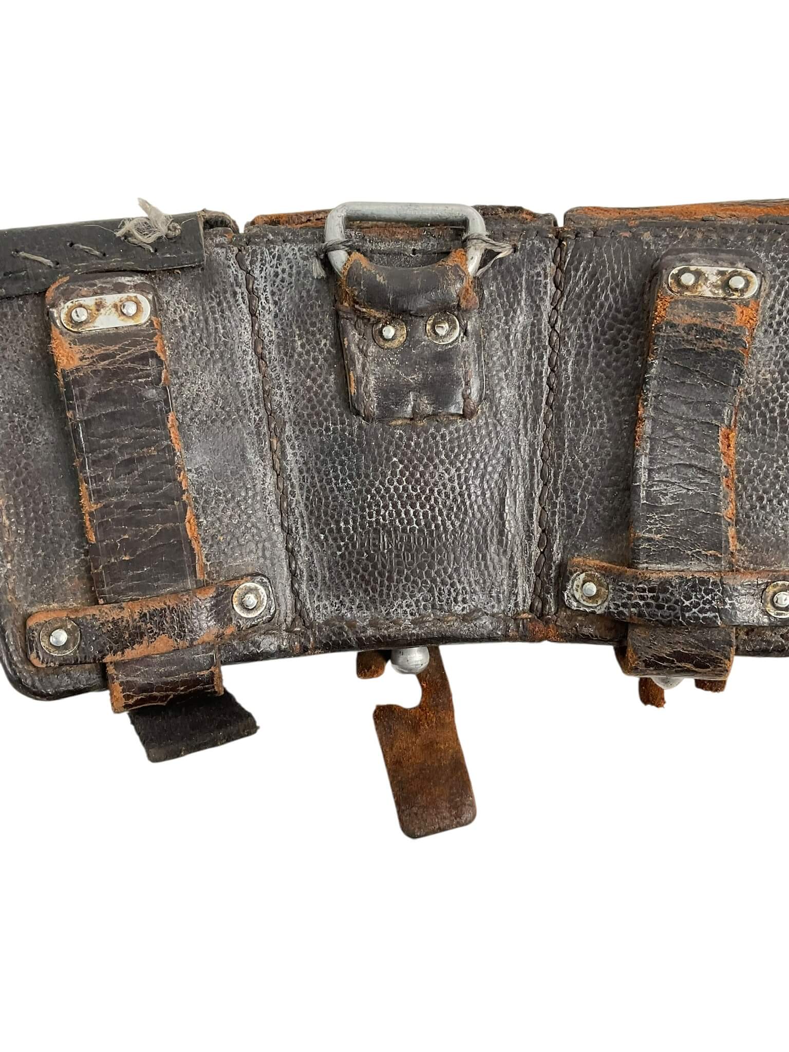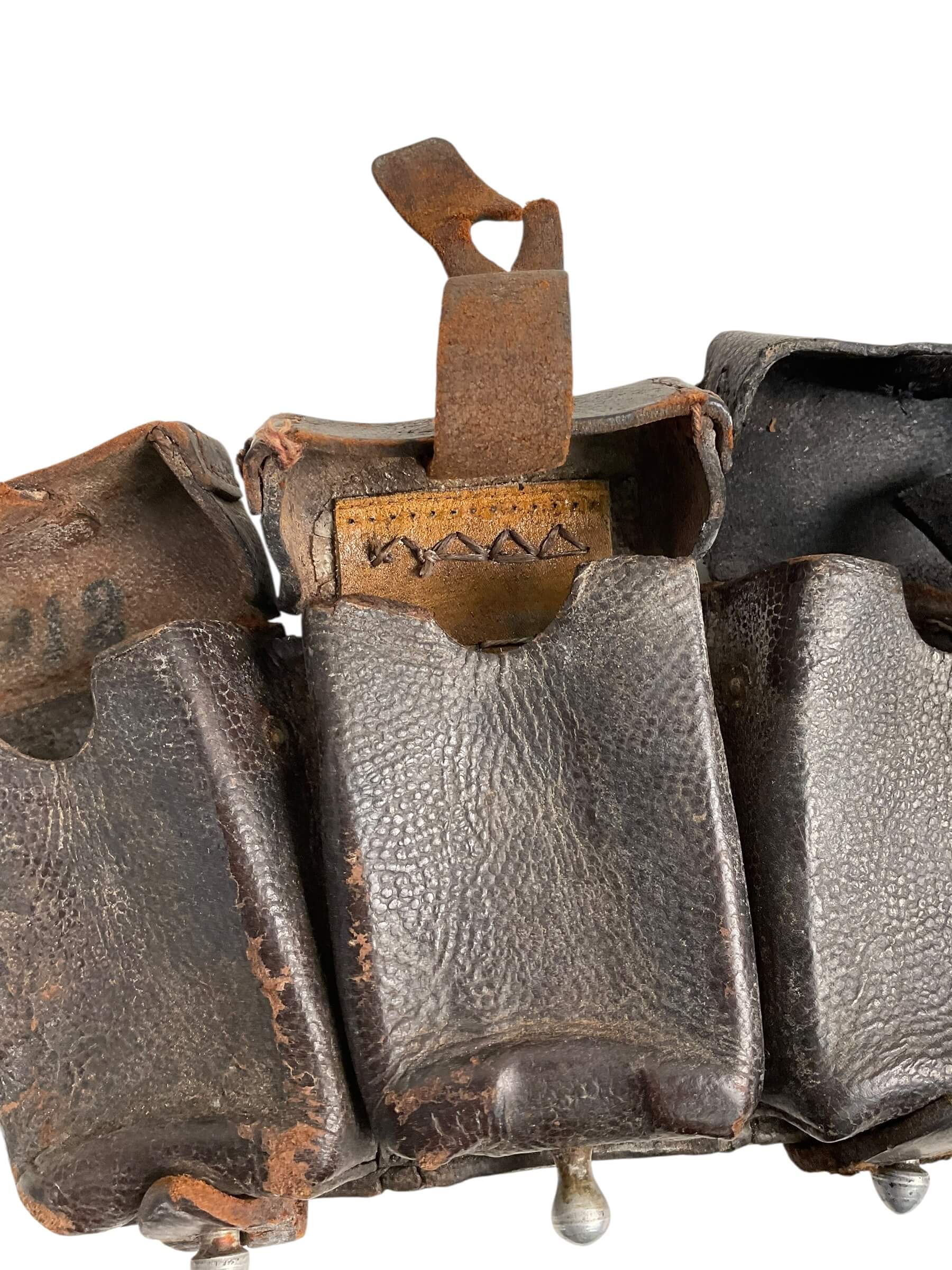 The WW2 German K98 Leather Ammo Pouches, dated 1943, are original field gear issued to German soldiers during the Second World War. Designed specifically for the Mauser Karabiner 98k rifle, each pouch is crafted from durable black or brown leather and typically features three separate compartments. Each compartment is secured with a flap and closure strap, allowing for the organized storage of 15