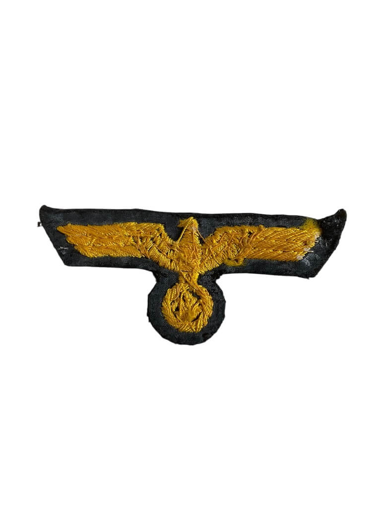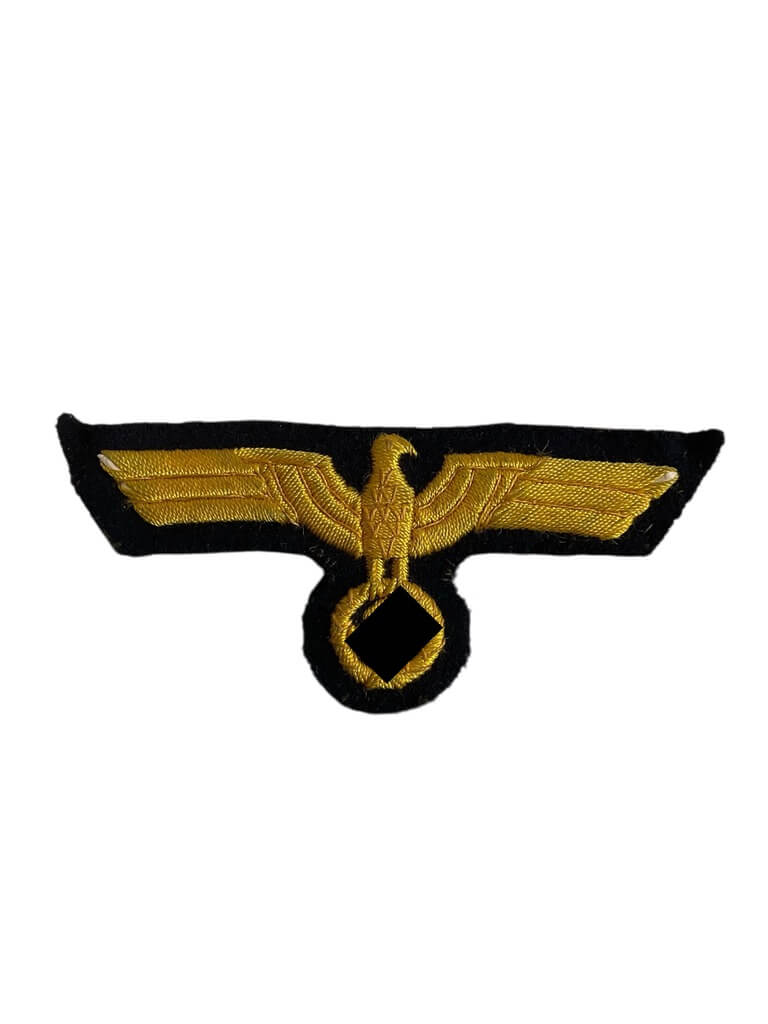 The WW2 German Kriegsmarine Breast Eagle is an original military insignia issued to personnel of the German Navy during the Second World War. This embroidered badge was typically worn on the right breast of navy uniforms, serving as a distinctive emblem of the Kriegsmarine, the maritime branch of the German armed forces. The design features a stylized eagle with outstretched wings, clutching a swastika within a wreath. Constructed from golden-yellow or silver-gray thread, the eagle was usually sewn onto dark blue wool, conforming to standard naval uniform specifications. The insignia played a prominent role in identifying rank and service branch among German military personnel. Dimensions and materials may vary slightly based on manufacturing periods and specific uniform regulations. As with other armed forces of the era, such badges were integral to uniform identification and are of historical interest to collectors and researchers studying the organizational insignia of the Second World War.