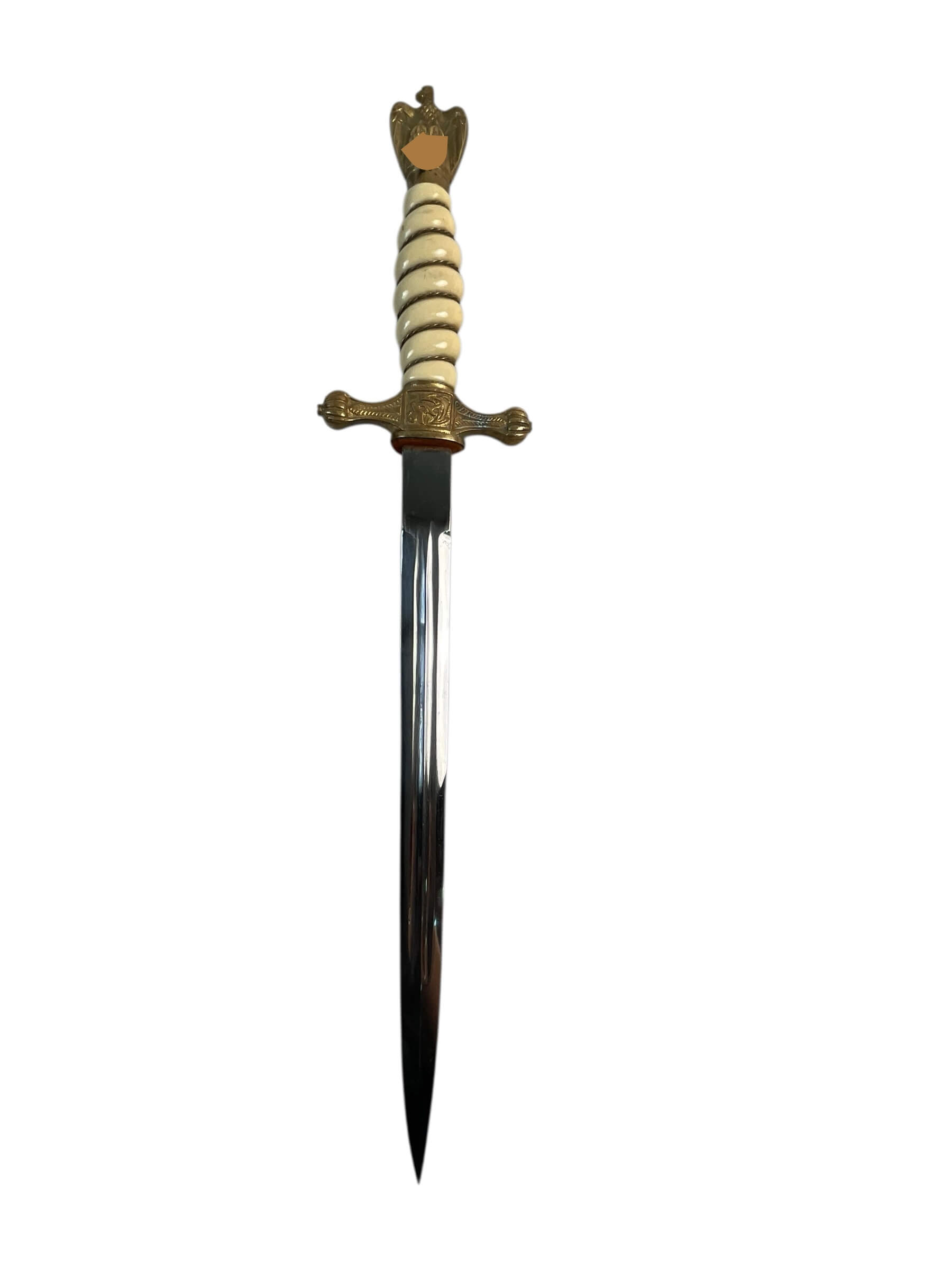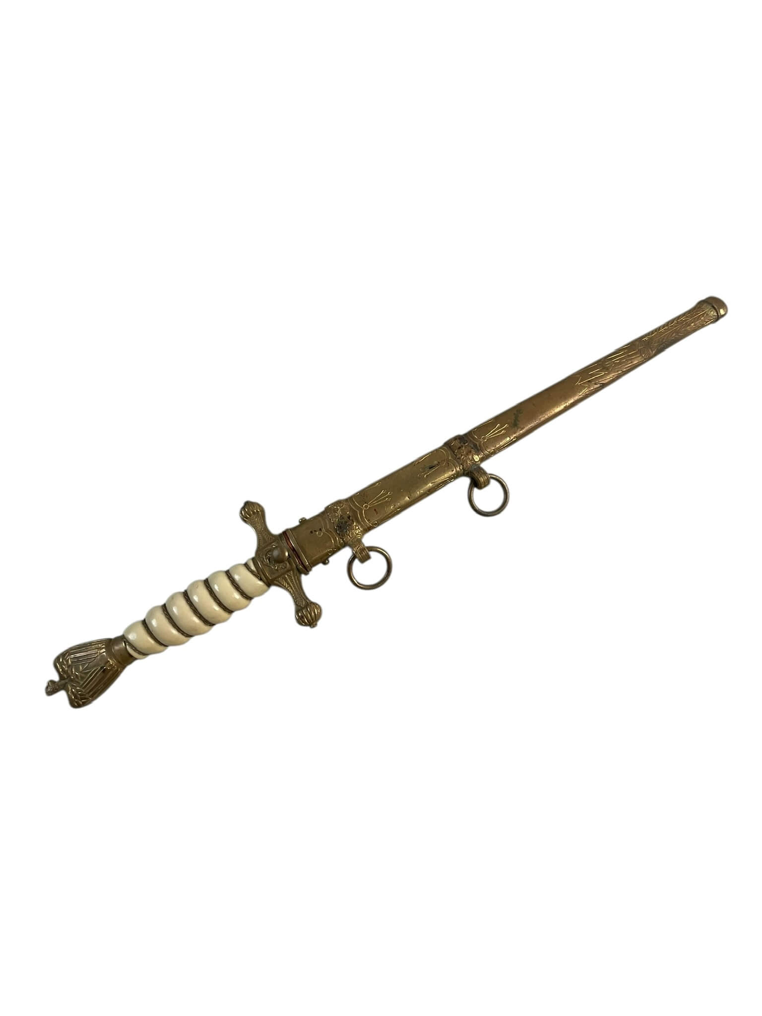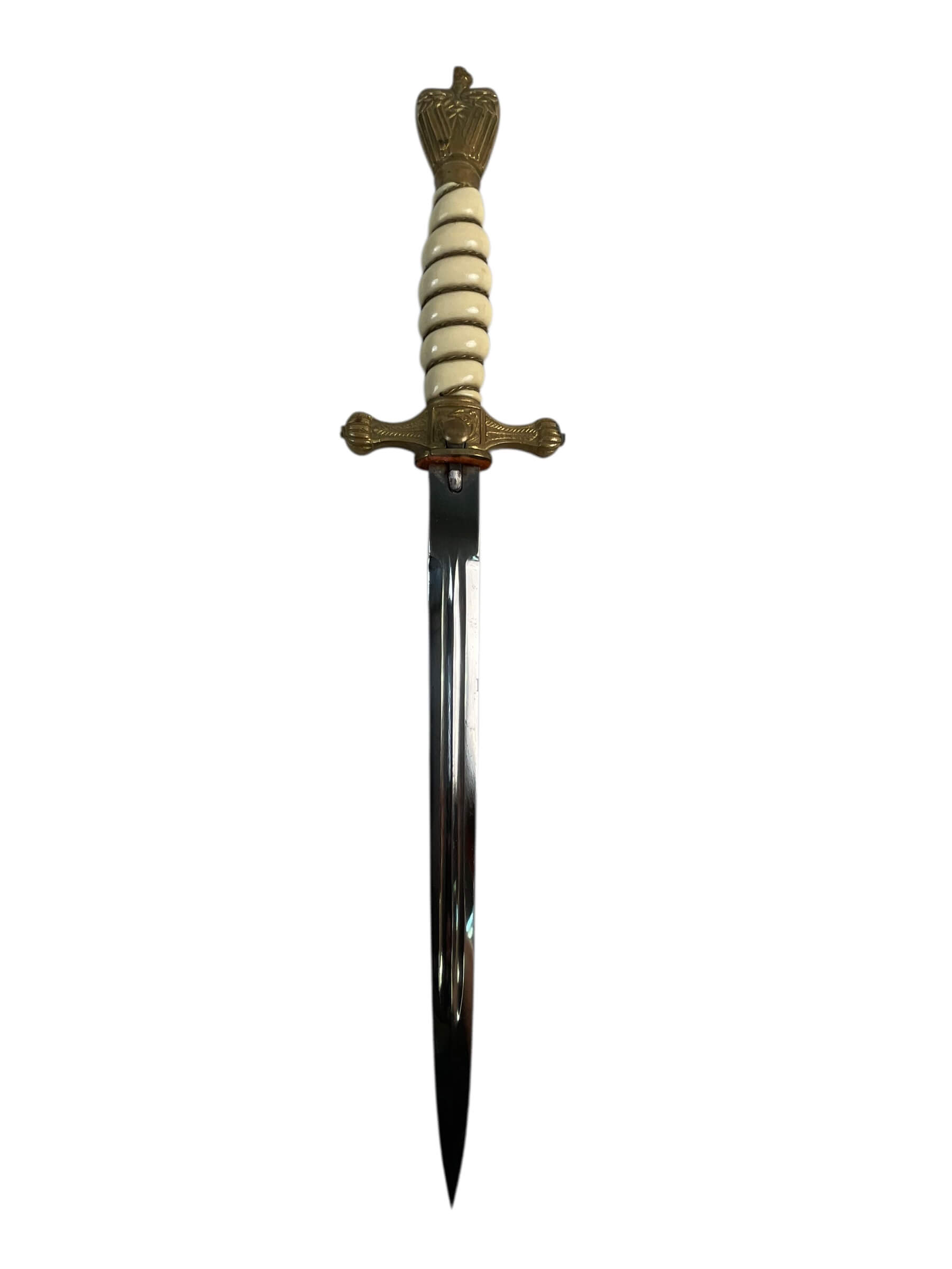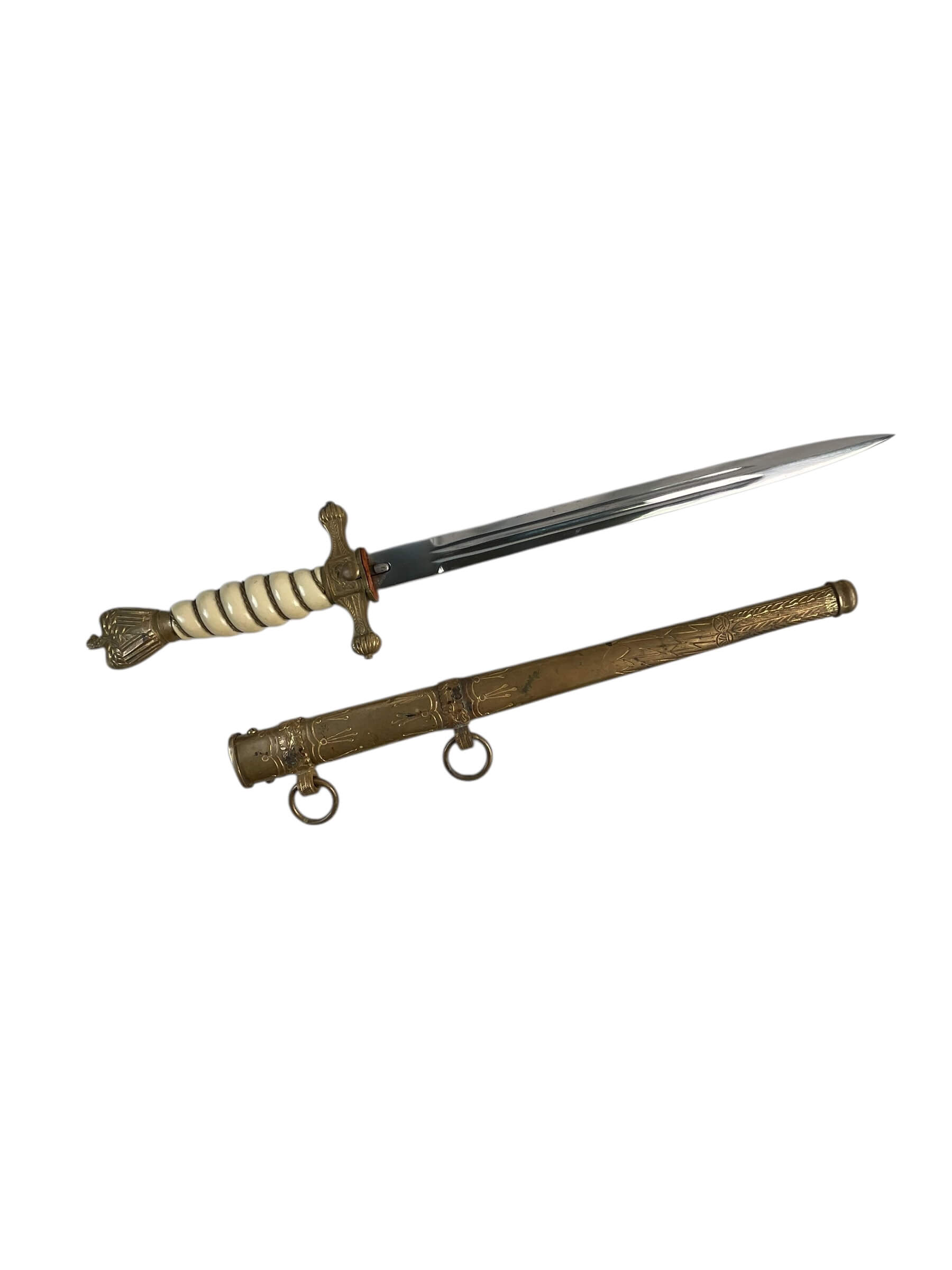 The WW2 German Kriegsmarine Dagger with Scabbard is a ceremonial edged weapon originally issued to naval officers of the German Kriegsmarine during the Second World War. The dagger typically features a slender, single-edged blade, often etched with maritime motifs such as anchors and waves. The hilt includes a brass crossguard and pommel—usually formed in the shape of an ornate eagle and swastika—alongside a wire-wrapped, white or cream-colored grip. The accompanying scabbard is constructed of brass, often decorated with engraved or embossed designs, and includes suspension rings for attaching to a uniform belt. These daggers served as a symbol of rank and authority rather than as a practical combat weapon. Standard issue for officer ranks, the Kriegsmarine dagger is notable for its distinctive naval-themed aesthetic, reflecting the traditions of the German navy during the years 1935–1945.