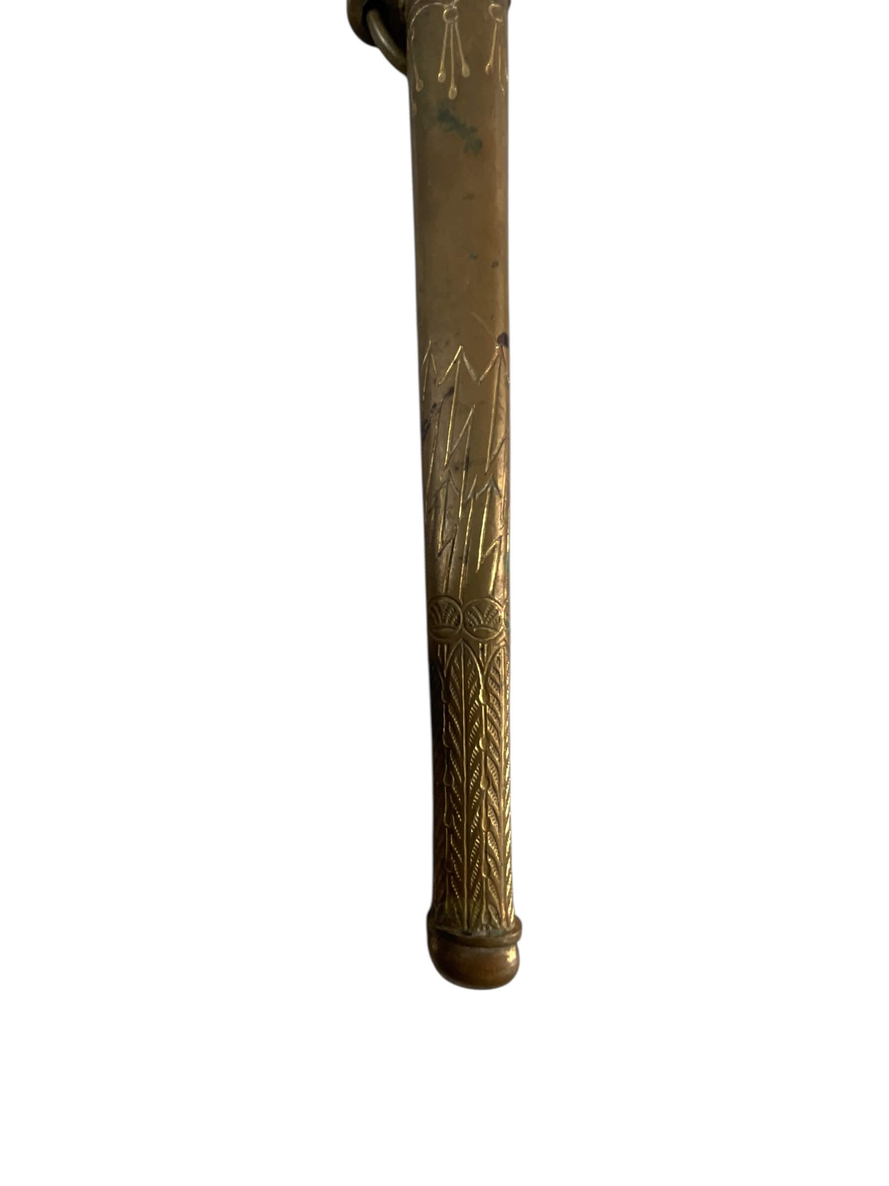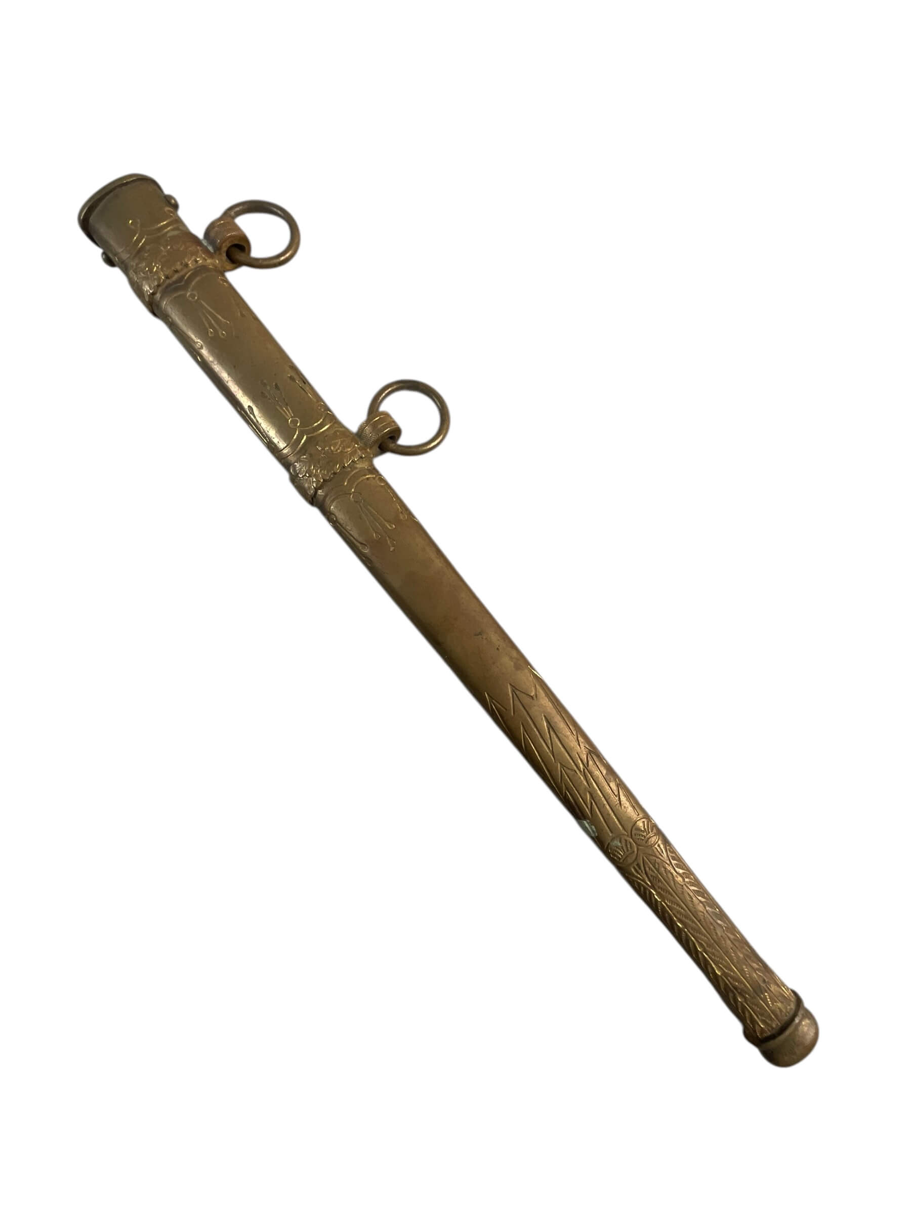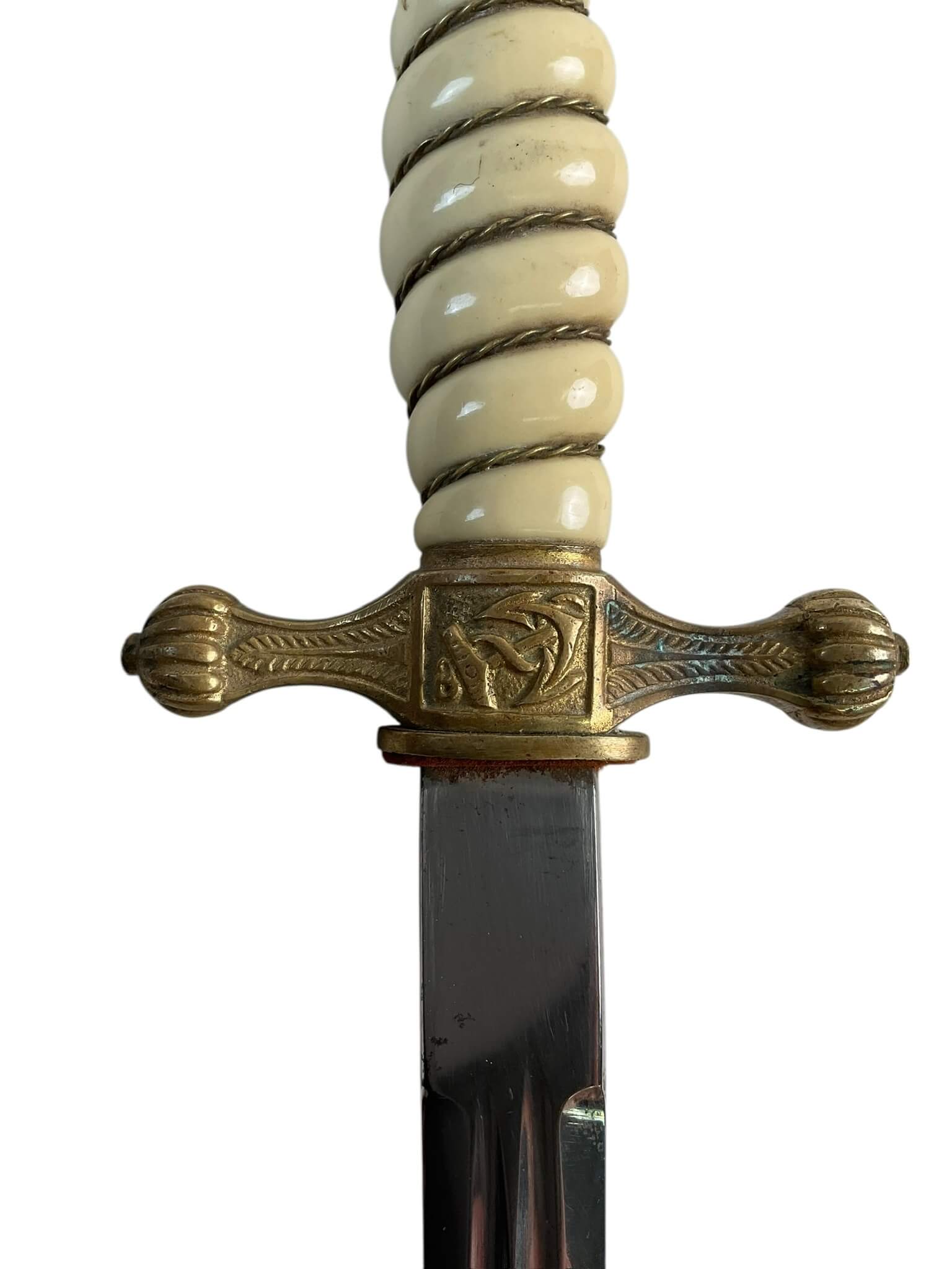 The WW2 German Kriegsmarine Dagger with Scabbard is a ceremonial edged weapon originally issued to naval officers of the German Kriegsmarine during the Second World War. The dagger typically features a slender, single-edged blade, often etched with maritime motifs such as anchors and waves. The hilt includes a brass crossguard and pommel—usually formed in the shape of an ornate eagle and swastika—alongside a wire-wrapped, white or cream-colored grip. The accompanying scabbard is constructed of brass, often decorated with engraved or embossed designs, and includes suspension rings for attaching to a uniform belt. These daggers served as a symbol of rank and authority rather than as a practical combat weapon. Standard issue for officer ranks, the Kriegsmarine dagger is notable for its distinctive naval-themed aesthetic, reflecting the traditions of the German navy during the years 1935–1945.