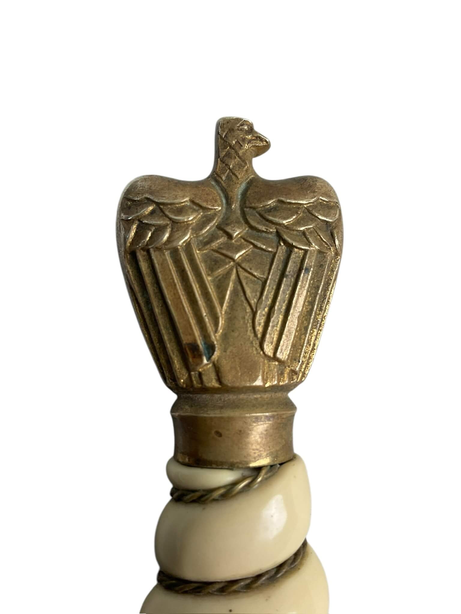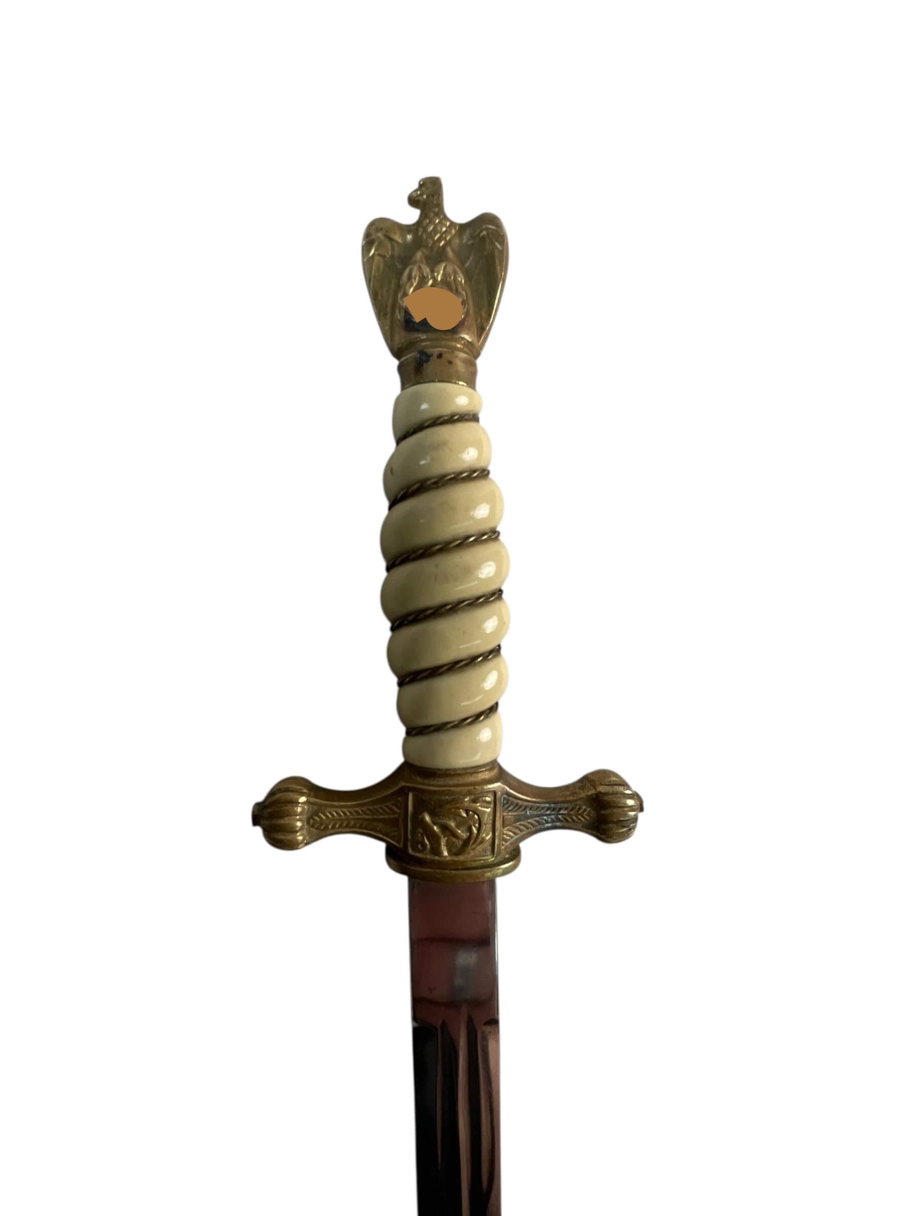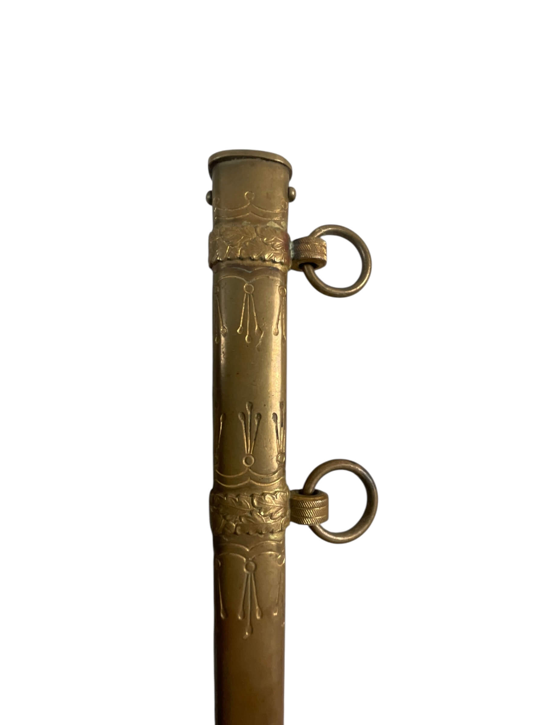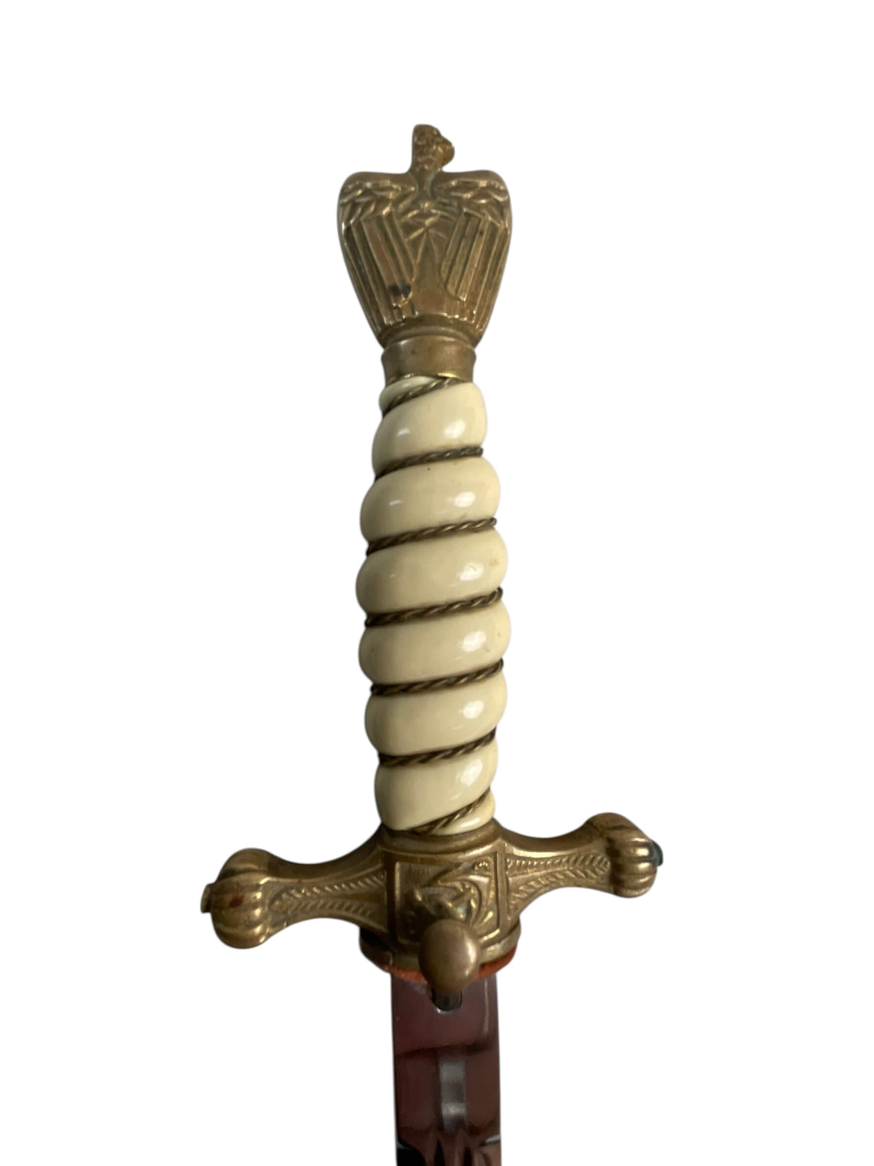 The WW2 German Kriegsmarine Dagger with Scabbard is a ceremonial edged weapon originally issued to naval officers of the German Kriegsmarine during the Second World War. The dagger typically features a slender, single-edged blade, often etched with maritime motifs such as anchors and waves. The hilt includes a brass crossguard and pommel—usually formed in the shape of an ornate eagle and swastika—alongside a wire-wrapped, white or cream-colored grip. The accompanying scabbard is constructed of brass, often decorated with engraved or embossed designs, and includes suspension rings for attaching to a uniform belt. These daggers served as a symbol of rank and authority rather than as a practical combat weapon. Standard issue for officer ranks, the Kriegsmarine dagger is notable for its distinctive naval-themed aesthetic, reflecting the traditions of the German navy during the years 1935–1945.