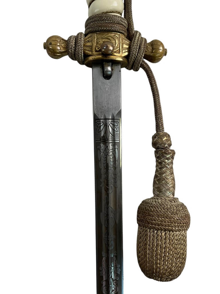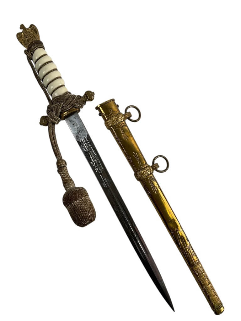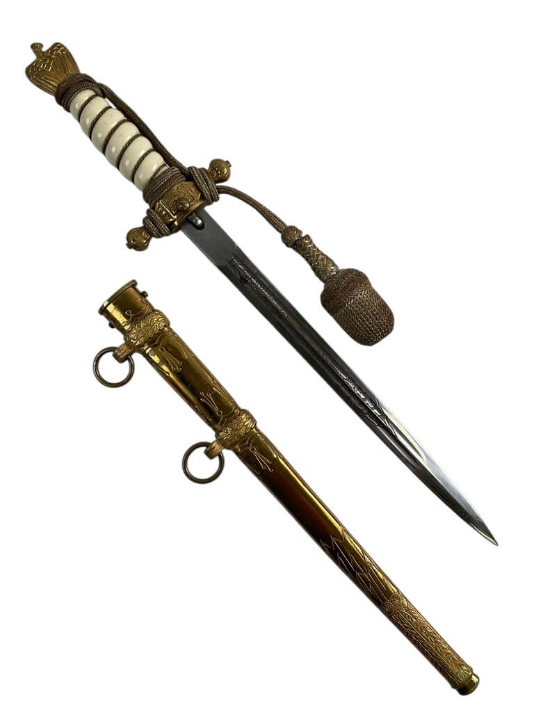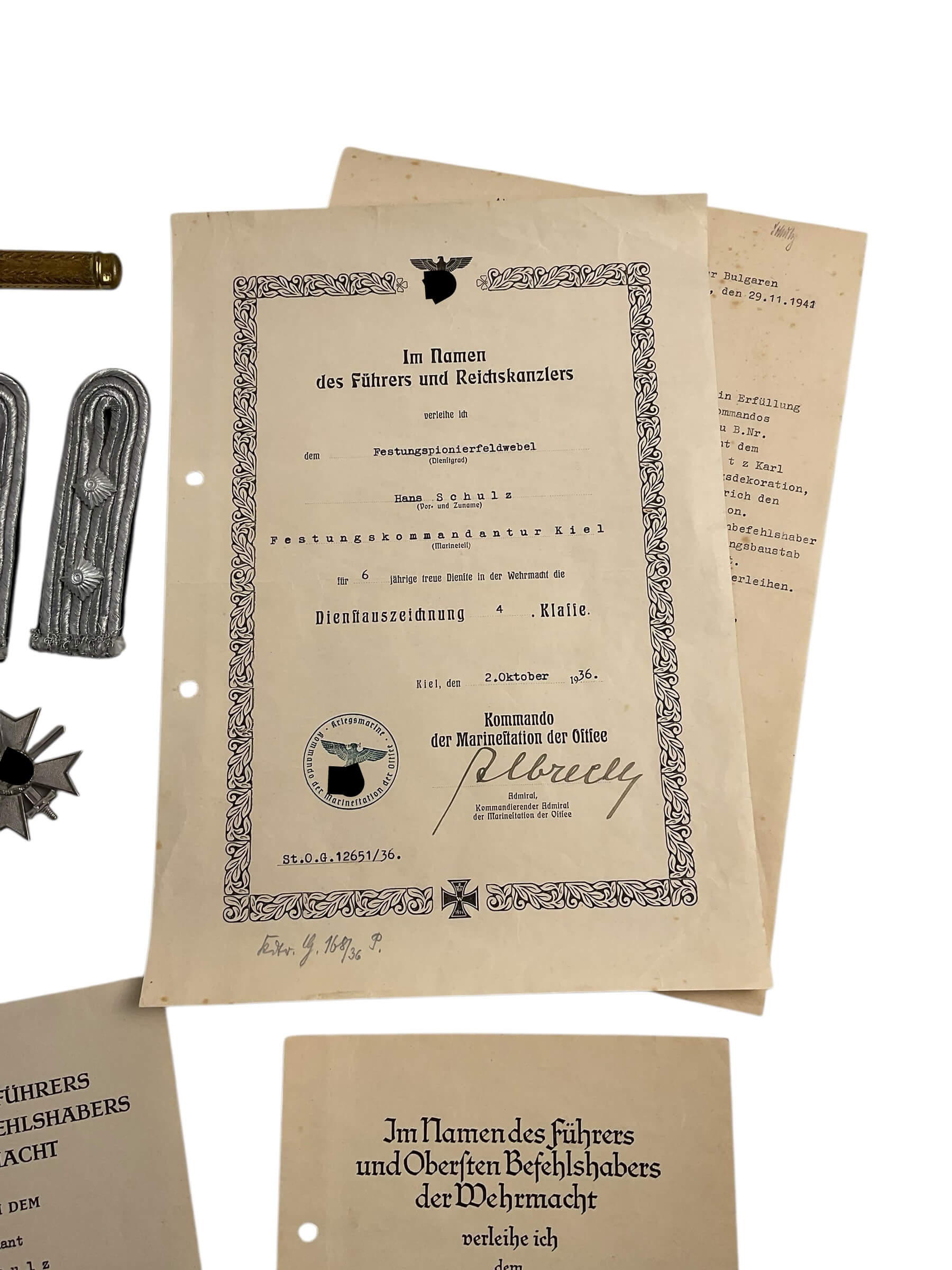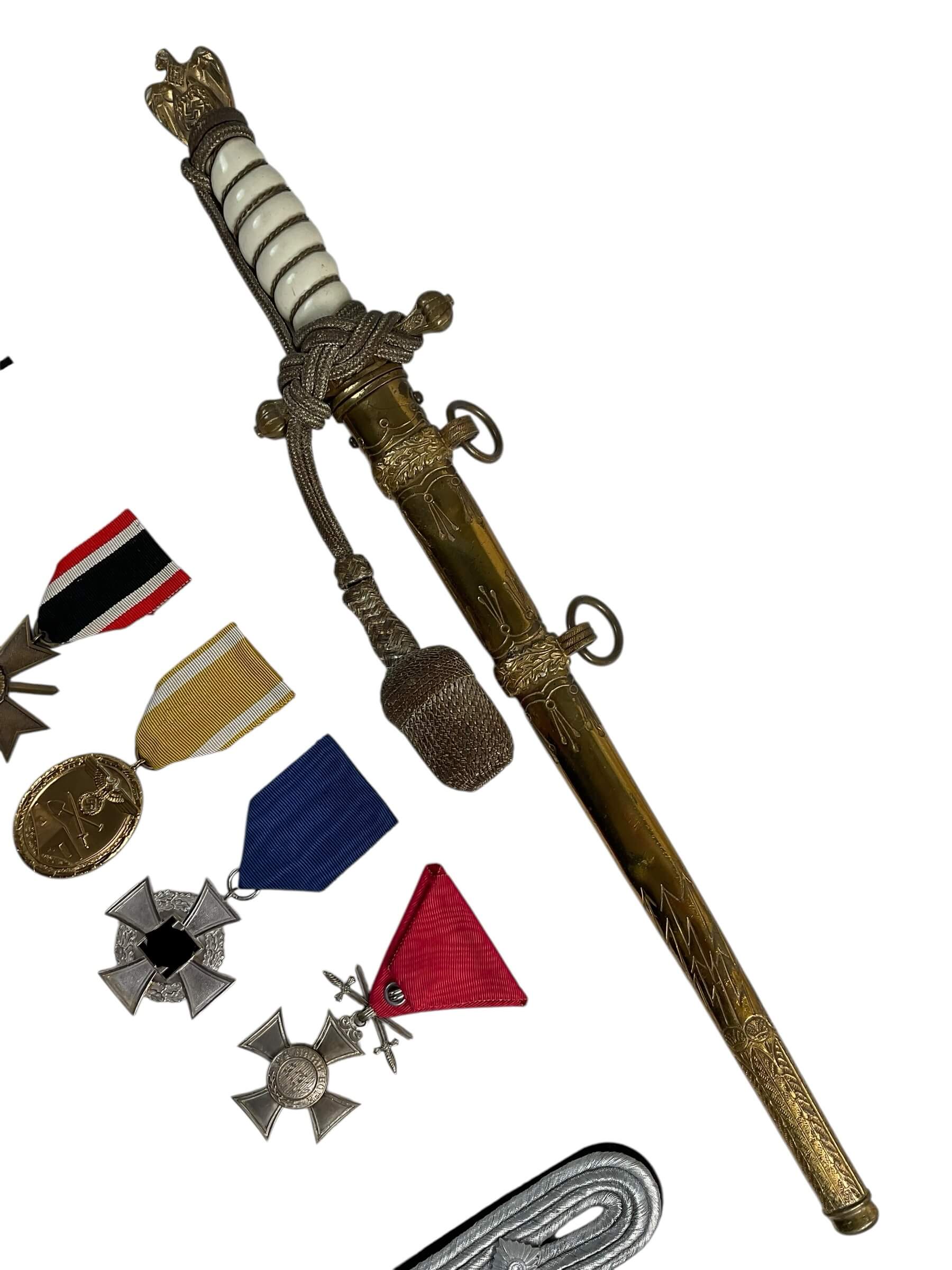 This item is a World War II German Kriegsmarine medal grouping accompanied by documents and a dagger. The grouping includes original military medals awarded to members of the German Navy (Kriegsmarine) during the Second World War. These medals typically recognize naval service, campaign participation, or specific achievements, and are identifiable by their official insignia and period-correct construction. The accompanying documents are period-issued, and may include award certificates or identification papers, providing further historical context and verification of the medals’ origins. The dagger is a standard-issue Kriegsmarine naval dress dagger, featuring the characteristic gold-plated fittings, engraved blade, and fouled anchor emblem, as was customary for German naval officers. Together, these items offer insight into the uniforms, awards, and official documentation of the Kriegsmarine during the Third Reich era. This grouping is suitable for reference by military historians, collectors, and researchers examining German naval history in the 1939–1945 period.