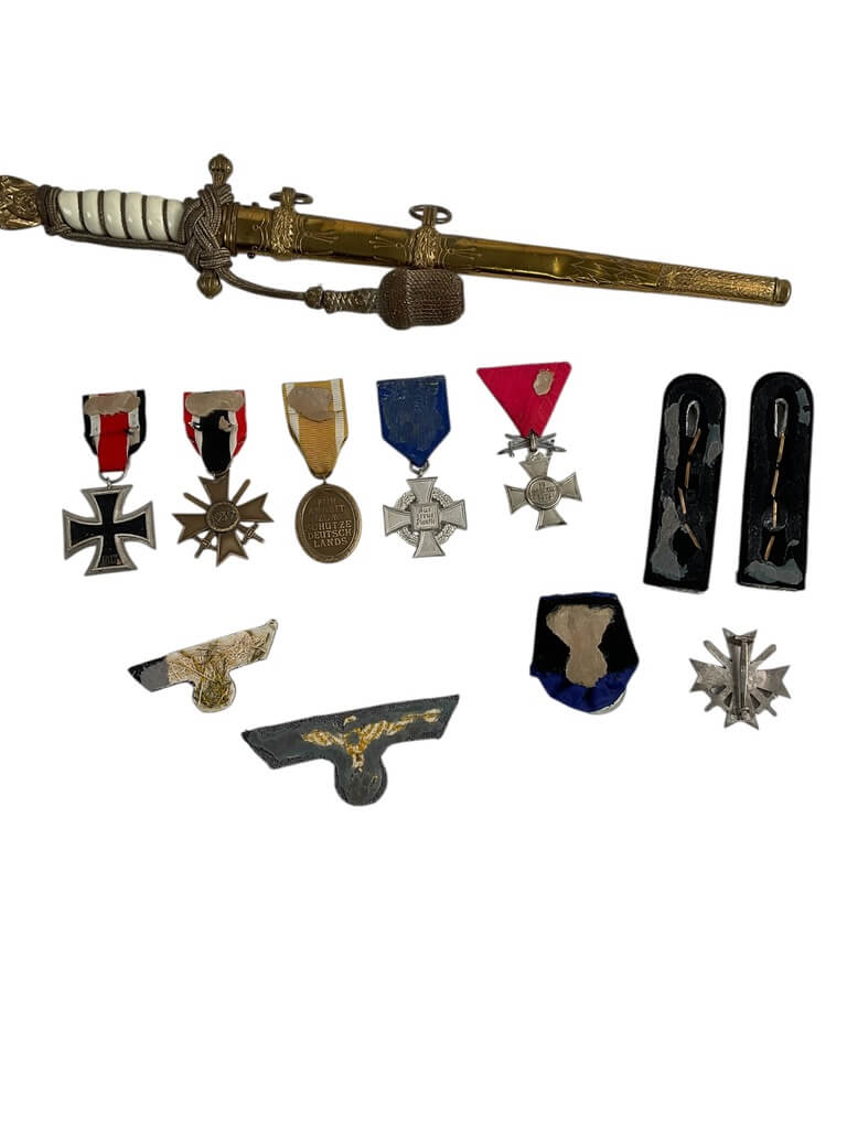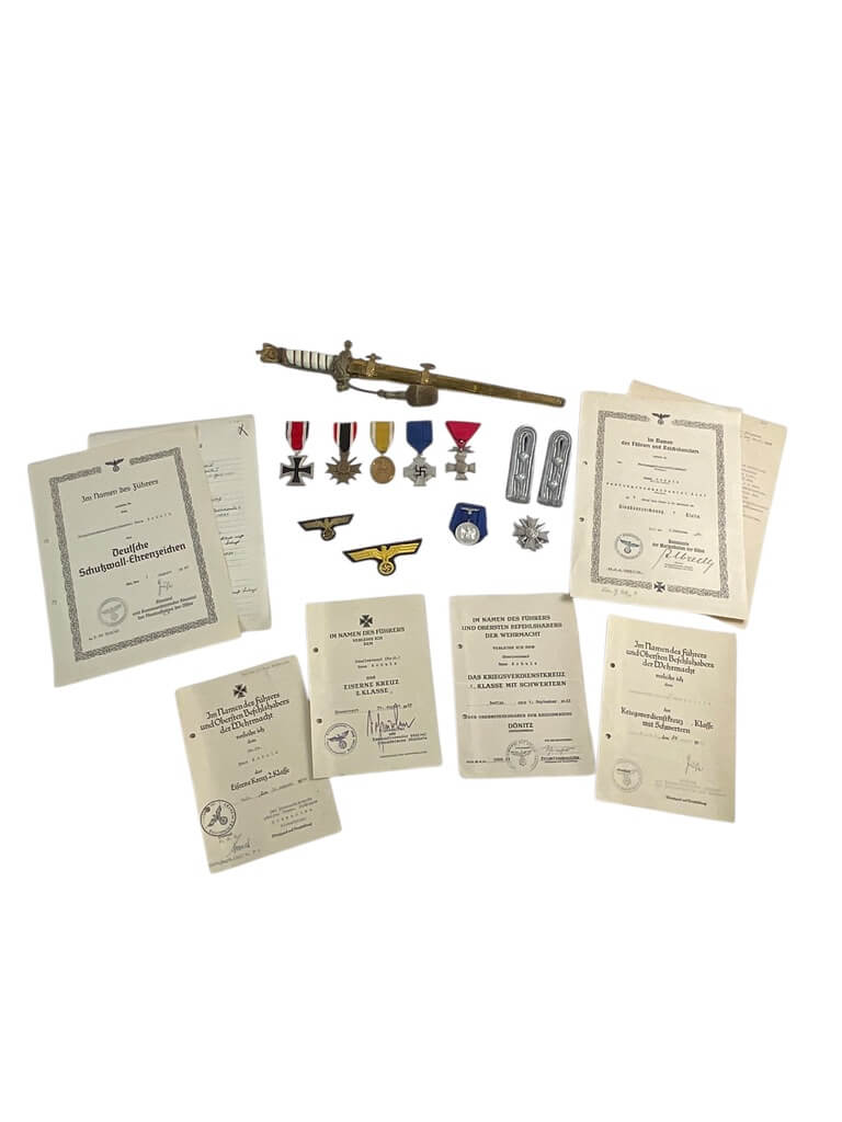 This item is a World War II German Kriegsmarine medal grouping, accompanied by original documents and a naval officer’s dagger. The grouping consists of awards issued to members of the Kriegsmarine, the naval branch of the German armed forces during the Second World War, which operated from 1935 to 1945. Medals typically included in such groups are the War Merit Cross, the Iron Cross