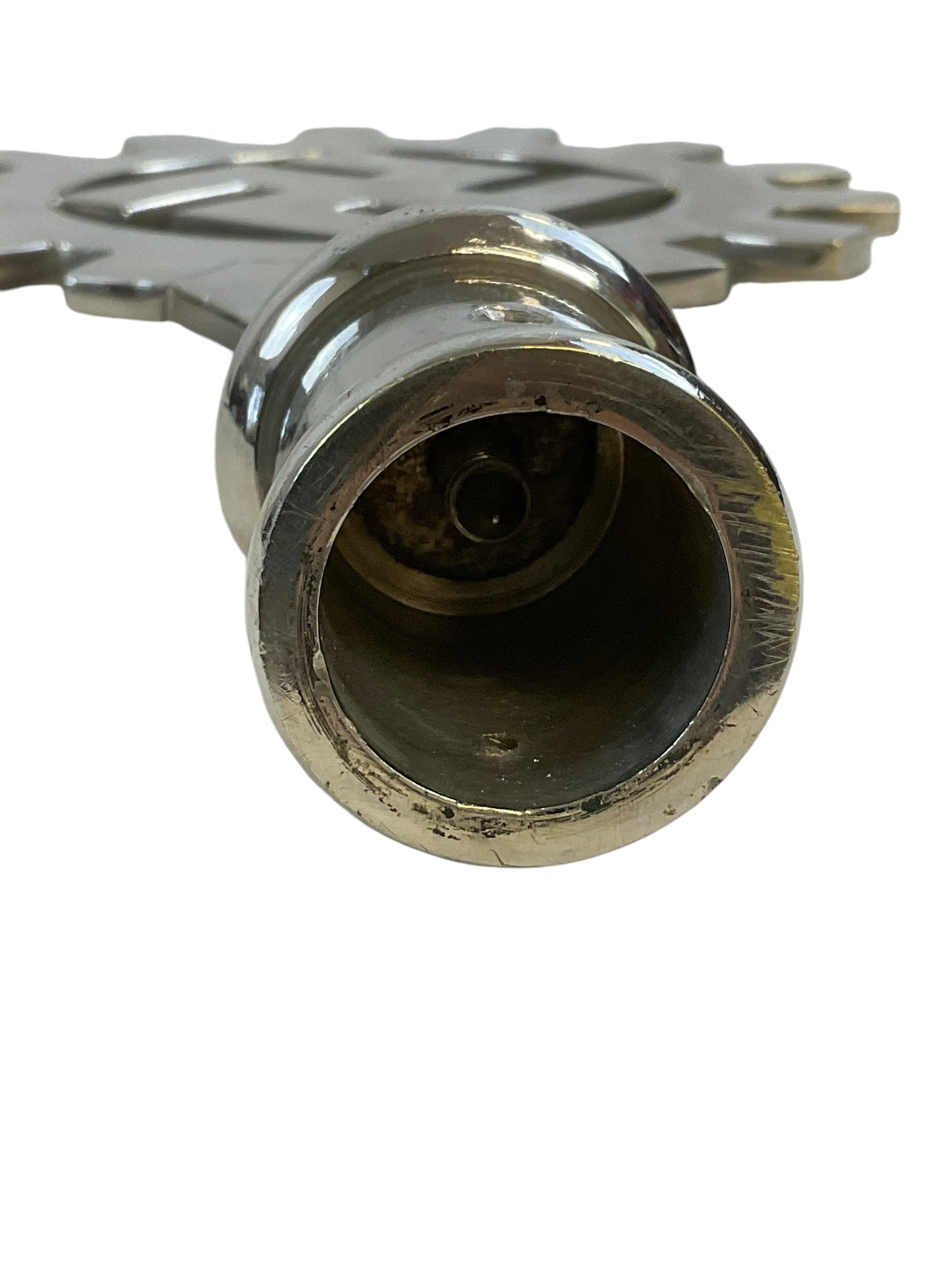 This artifact is a unique piece of World War II memorabilia – a German Labour Front (Deutsche Arbeitsfront, DAF) flag pole top. This significant item was a prominent symbol of the DAF, an organization established by the Nazi regime to replace trade unions and control the German workforce. The flag pole top, marked RZM M3/40, is a hallmark of authenticity, featuring the official Nazi Party marking system. The Reichszeugmeisterei (RZM) was the equipment office of the Nazi Party responsible for production and distribution of party equipment, and M3/40 refers to a specific manufacturer and production year. This artifact serves as a tangible reminder of Germany’s historical past during a dark period of world history. It’s an intriguing item for World War II enthusiasts, historians, and collectors alike.