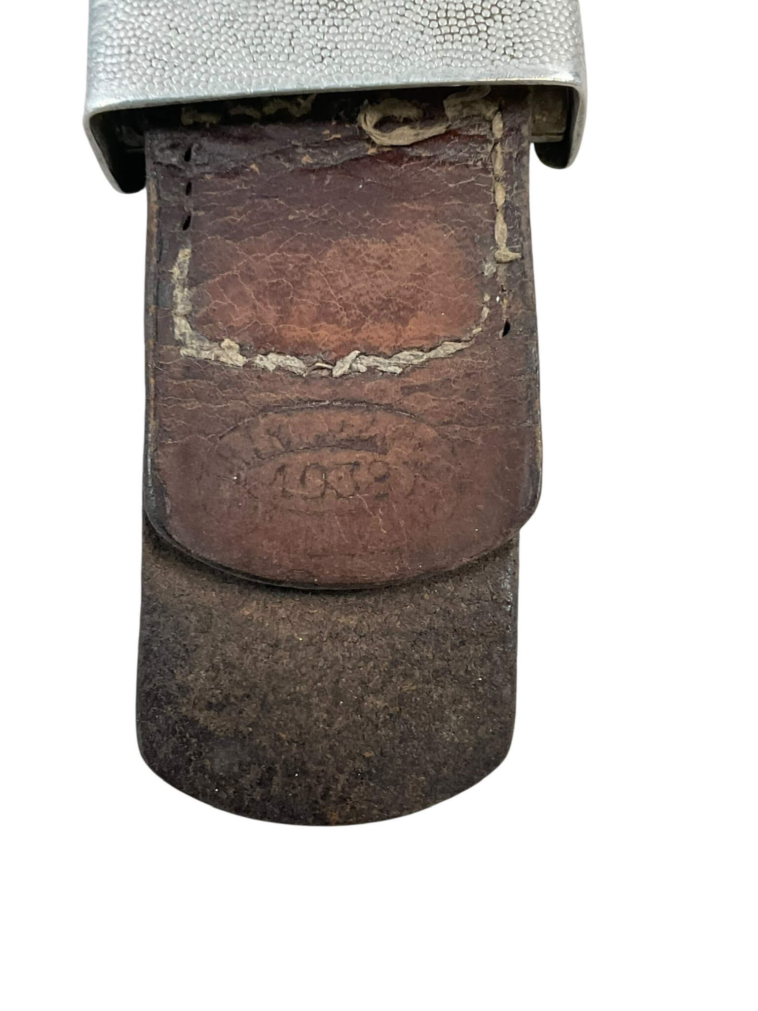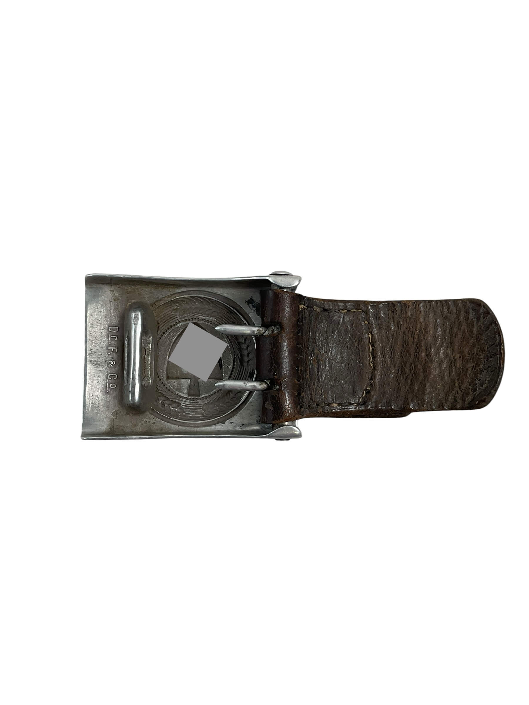 This item is a World War II German Labour Service (Reichsarbeitsdienst, RAD) aluminum belt buckle, complete with its original leather tab. The buckle is dated 1939 and produced by the maker D.R. Franke & Co. Markings on the reverse side confirm the manufacturer’s details and the year of issue, along with RAD insignia featuring the organization’s distinctive spade and swastika emblem within a wreath. The attached leather tab is also marked and dated, enhancing its collectability and helping verify authenticity and period use. Belt buckles of this type were standard issue for RAD personnel, a paramilitary organization responsible for labor and infrastructure projects in Germany before and during World War II. Constructed from lightweight aluminum, these buckles replaced earlier nickel and steel versions to conserve materials. This example illustrates typical construction and design features seen in uniforms and equipment used by RAD members during the late 1930s.