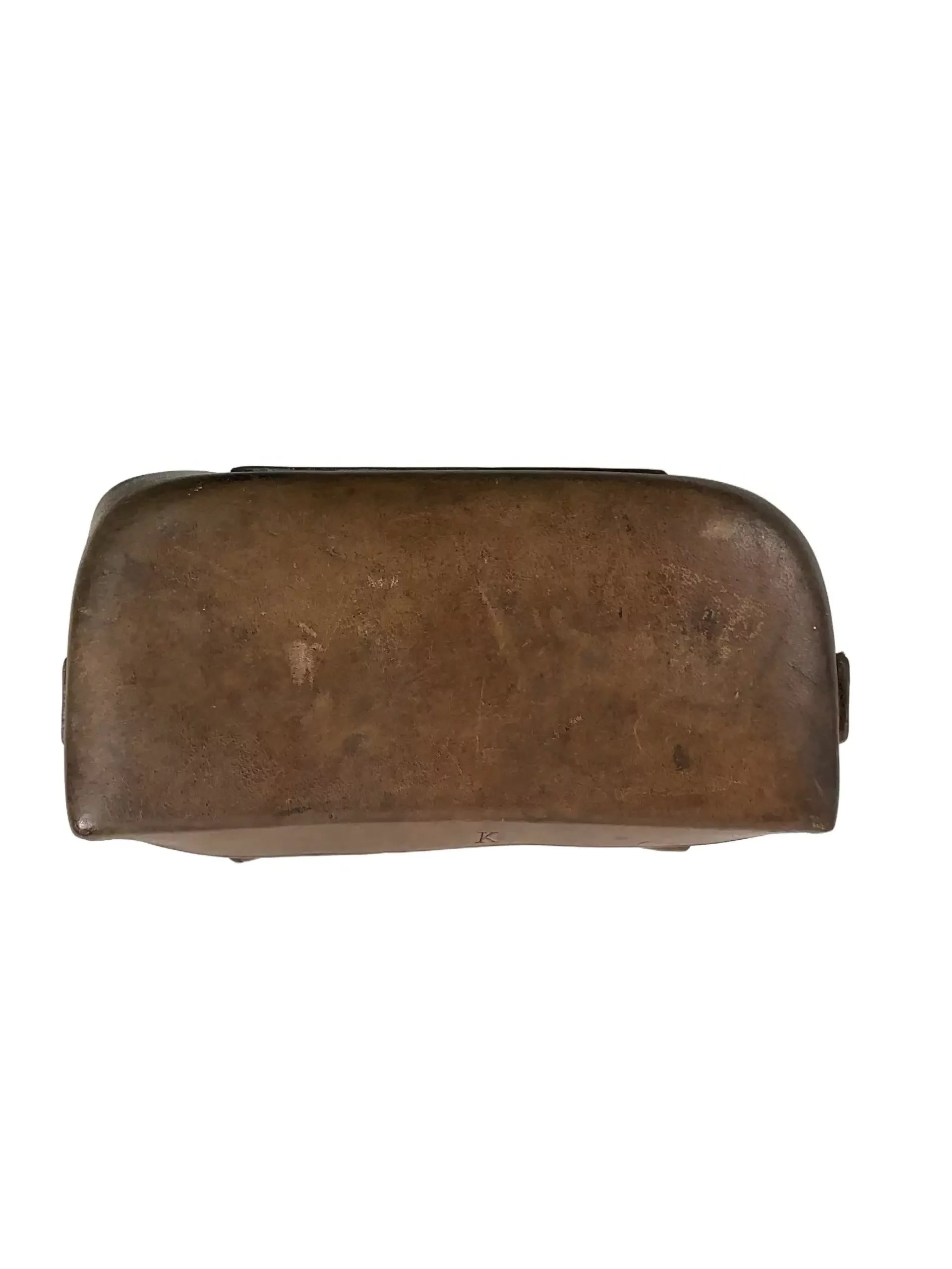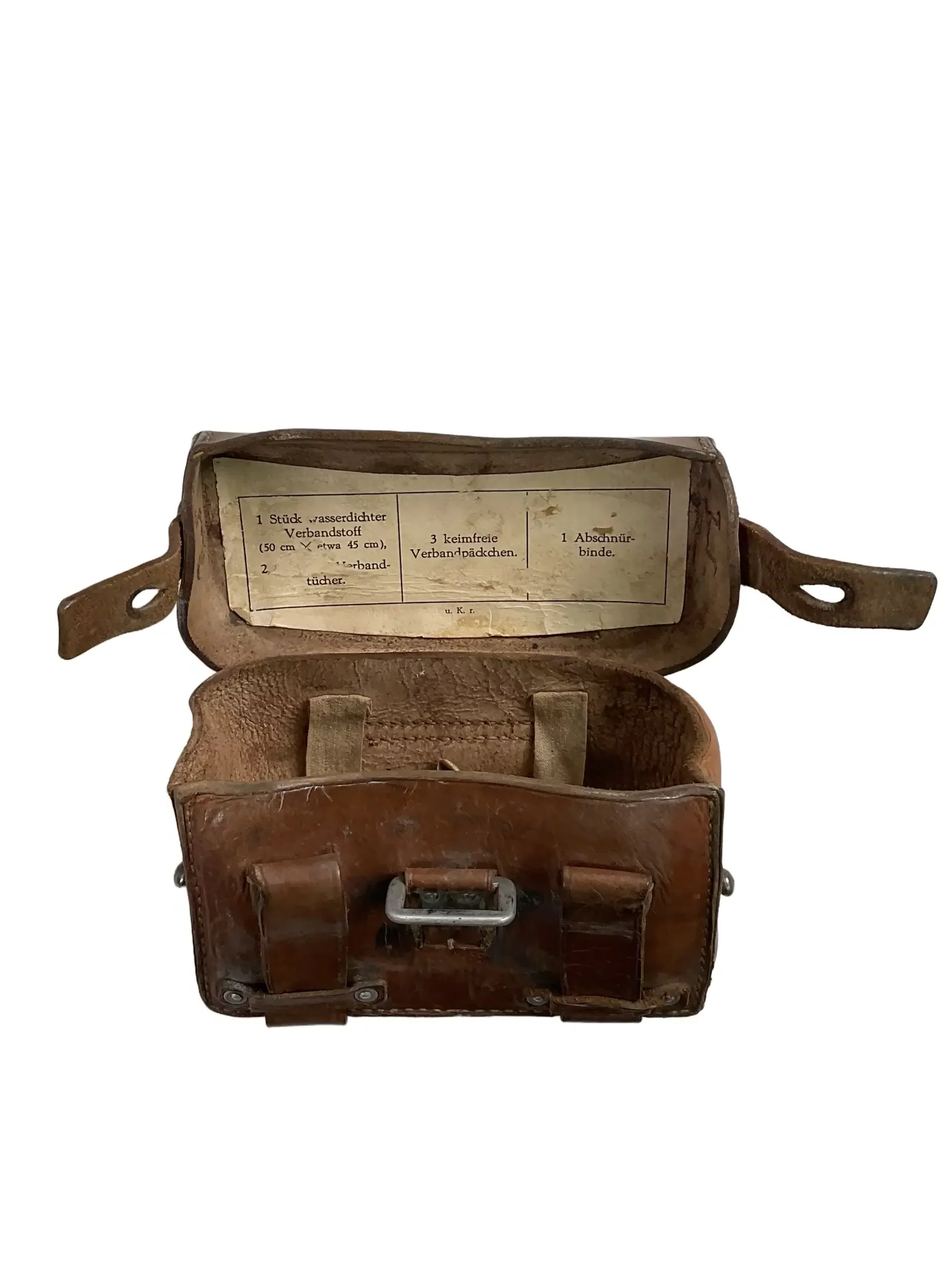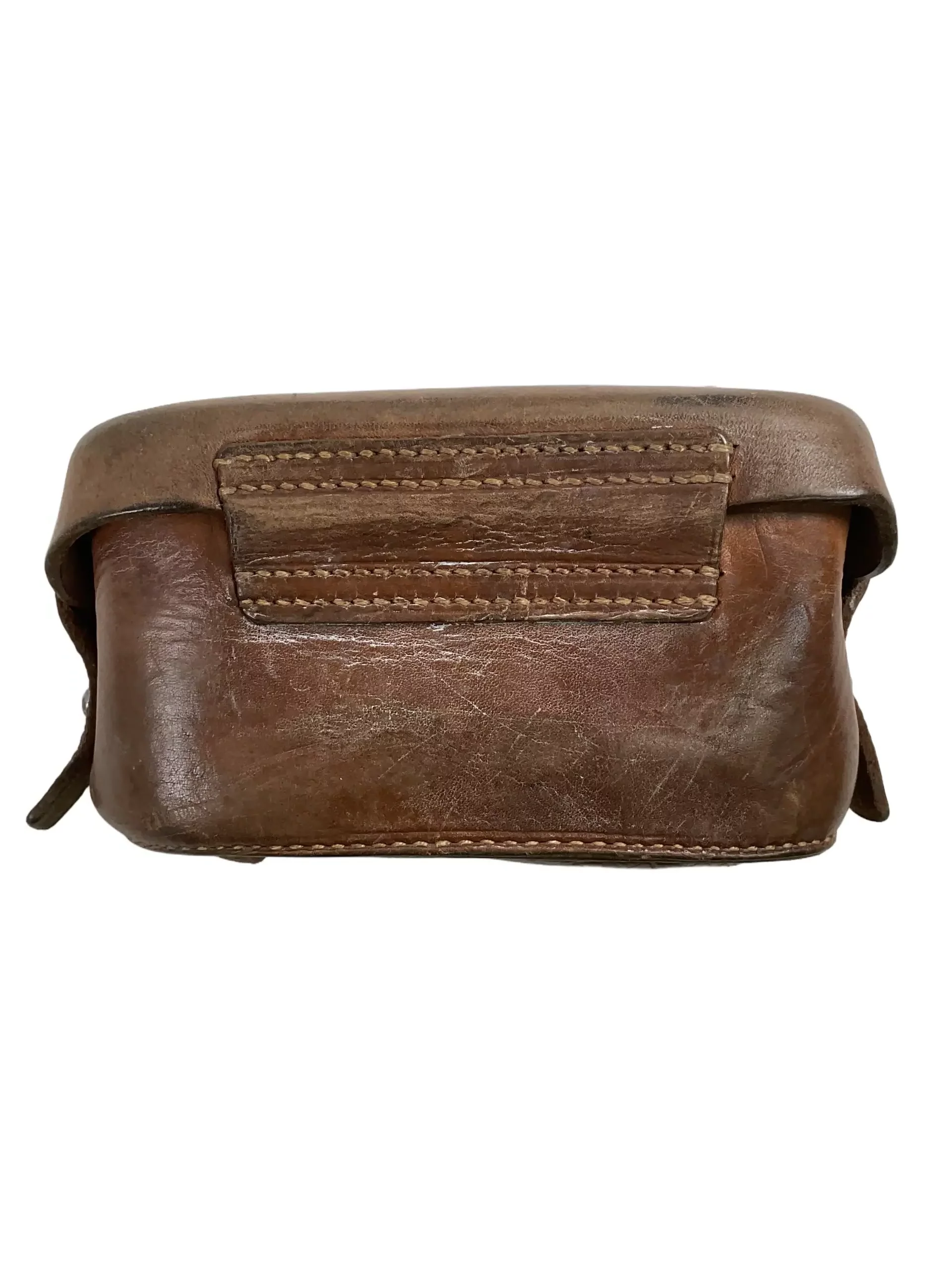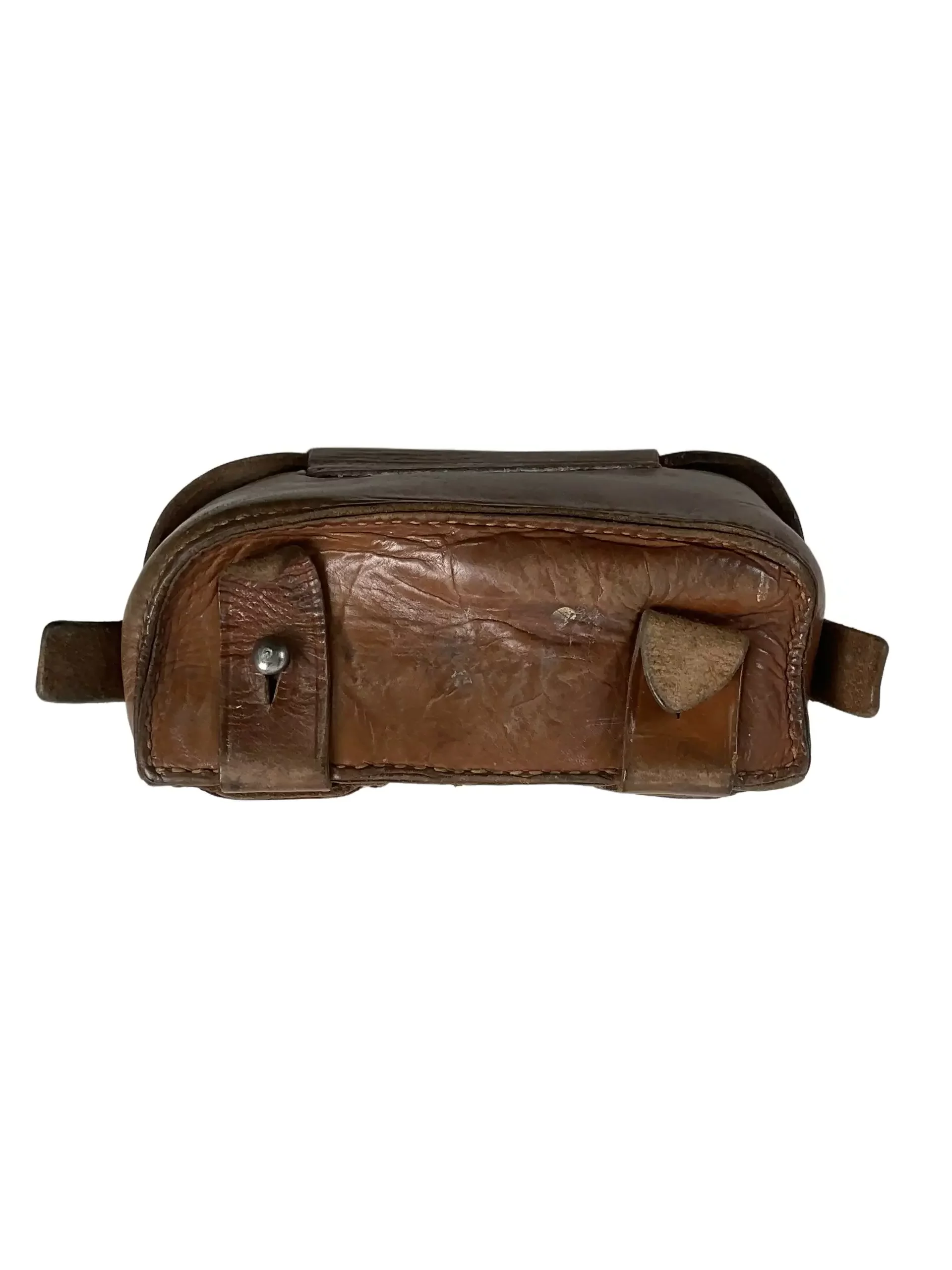 The WW2 German Leather Medic Pouch EMPTY is an original military accessory issued to German medical personnel during the Second World War. Constructed from durable brown or black leather, these pouches were designed to hold essential medical supplies for field use. The pouch features compartmentalized interior sections to organize bandages, vials, and other medical tools, though this example is offered without contents. Typical elements include reinforced stitching, belt loops for attachment to standard gear, and metal hardware for closure. Many pouches bear embossed stamps or markings indicating manufacturer, date, and military branch. This equipment reflects the organizational aspects of wartime German field medicine, emphasizing portability and accessibility in combat situations. As with other standard-issue Wehrmacht gear, the medic pouch exhibits pragmatic design intended to meet the demands of frontline service. This empty pouch provides a representative example of personal medical equipment used by German forces between 1939 and 1945.