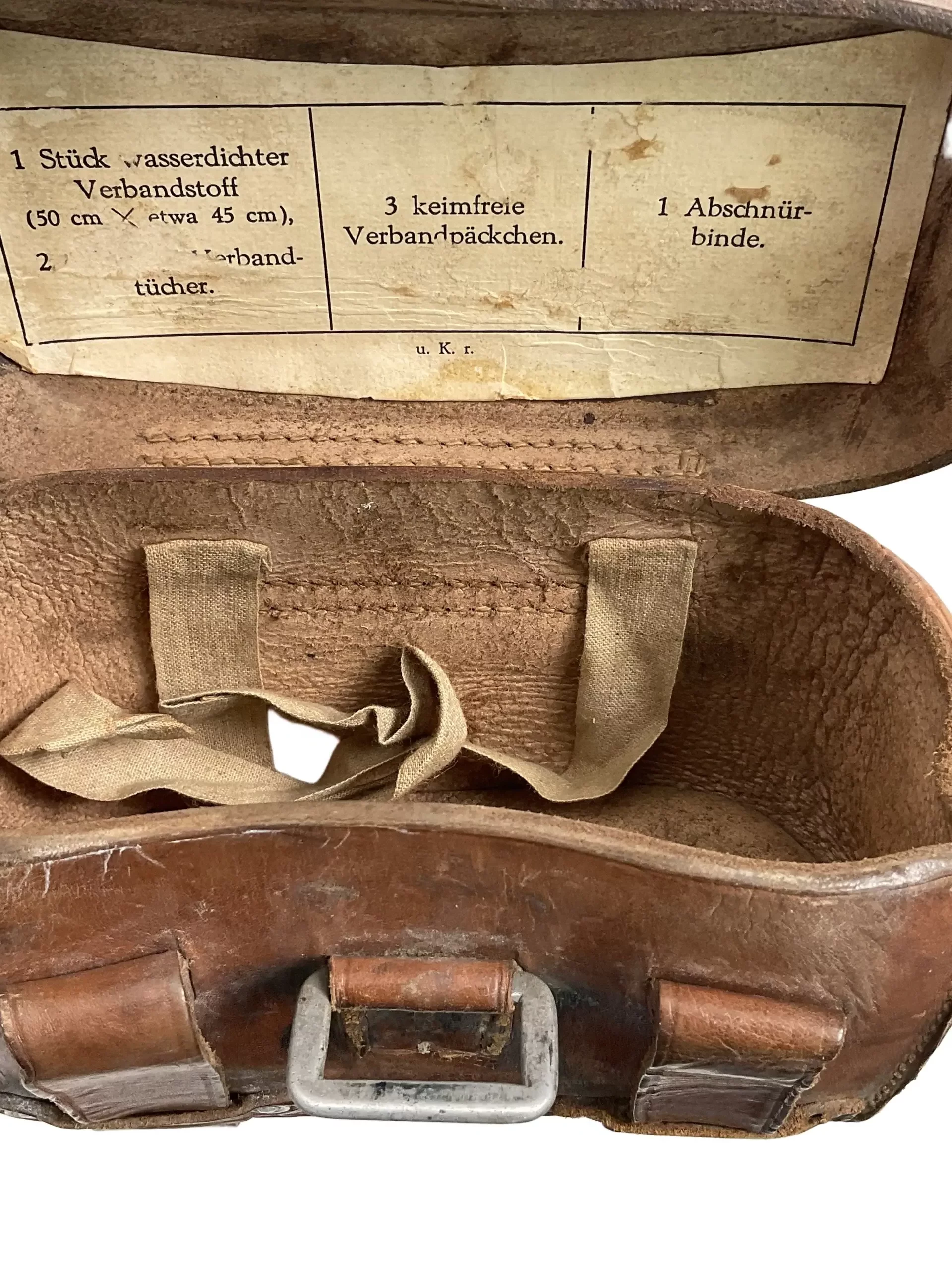 The WW2 German Leather Medic Pouch is an original piece of military field equipment used by German medical personnel during the Second World War. Constructed from durable brown or black leather, this pouch was designed to carry essential medical supplies for immediate treatment in the field. The pouch typically features a flap closure secured by leather straps and metal buckles, providing both security and quick access. Internal compartments and loops were