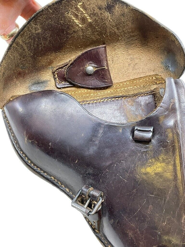This authentic World War II German Leather P08 Holster is a must-have for historical collectors and enthusiasts. Dated 1937 and stamped with the city of Dresden, this holster is a testament to pre-war craftsmanship and military history. Constructed from high-quality leather, it has weathered the decades while maintaining its robust structure, offering a glimpse into the past with impressive authenticity. Every detail, from the stitching to the fastening mechanisms, speaks to its original use during one of history’s most tumultuous times. Ideal for display or as a piece of a living history ensemble, this 1937-dated P08 holster is more than just a protective case for the iconic German Luger – it’s a tangible piece of history, carrying with it the stories of its era. Add this exceptional piece to your collection for a rare combination of historical significance and vintage craftsmanship.