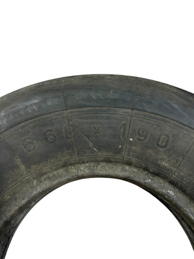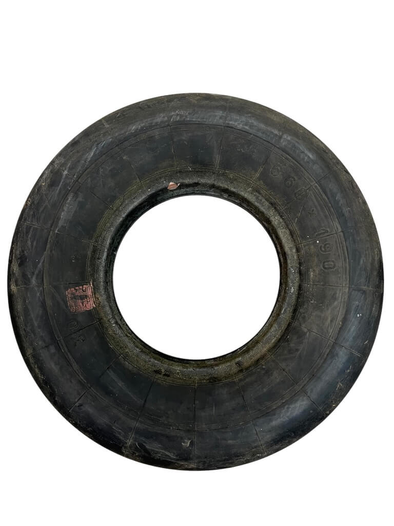 The WW2 German Luftwaffe Bf-109K Front Tire is an original aircraft component used on the Messerschmitt Bf 109K, the final production version of the Bf 109 fighter series deployed by the German Luftwaffe during the latter stages of the Second World War. This front tire was specifically designed for the Bf 109K’s retractable tailwheel undercarriage, contributing to the aircraft’s improved handling and performance. Manufactured from durable wartime rubber compounds, the tire features period-specific tread patterns and markings, providing evidence of its historical application. The Bf 109K model saw operational service from late 1944 through 1945, and surviving parts such as this tire offer tangible insight into the materials and equipment used in late-war Luftwaffe aviation engineering. Its dimensions, construction, and wear are consistent with use in frontline service, making it a noteworthy artifact for study or display in collections focused on WW2 aviation technology and history.