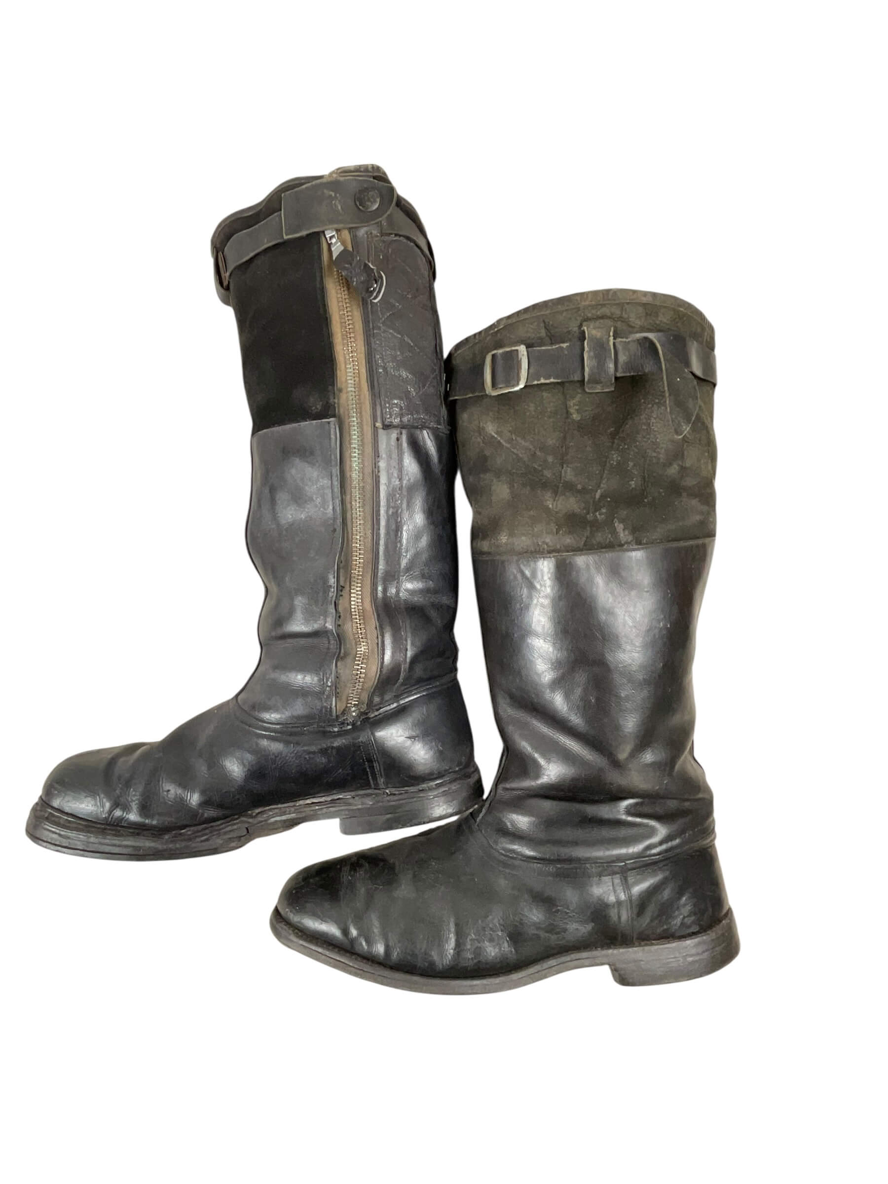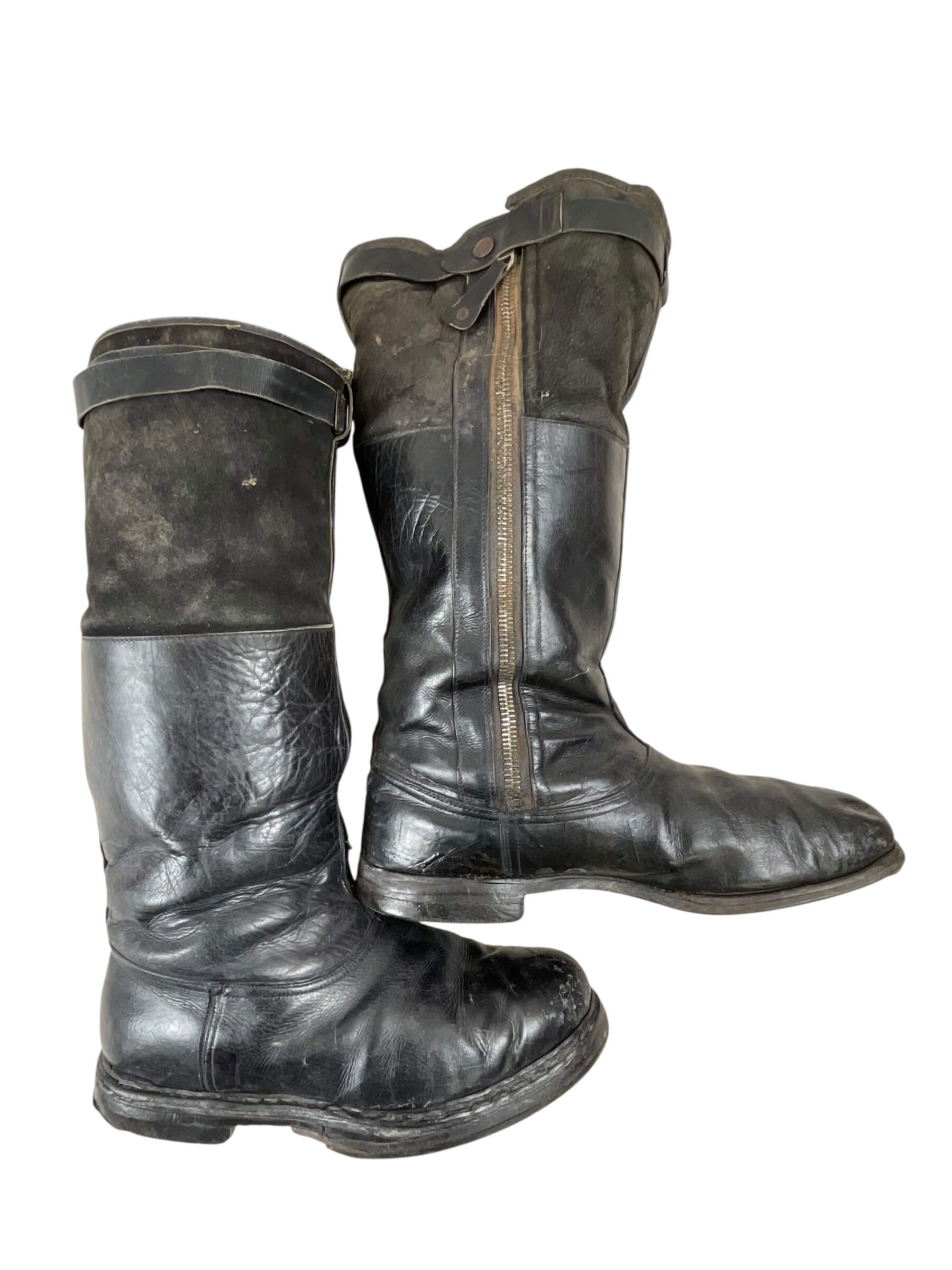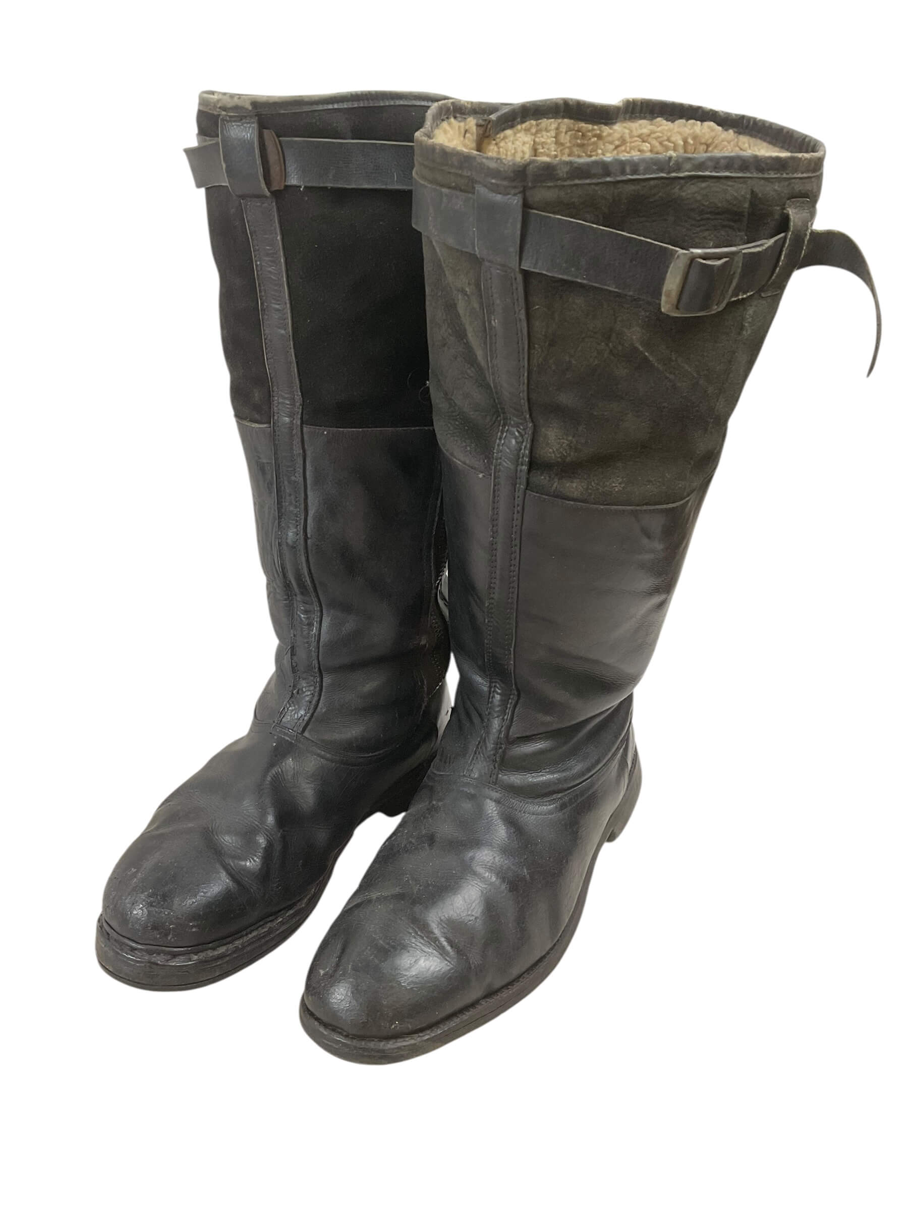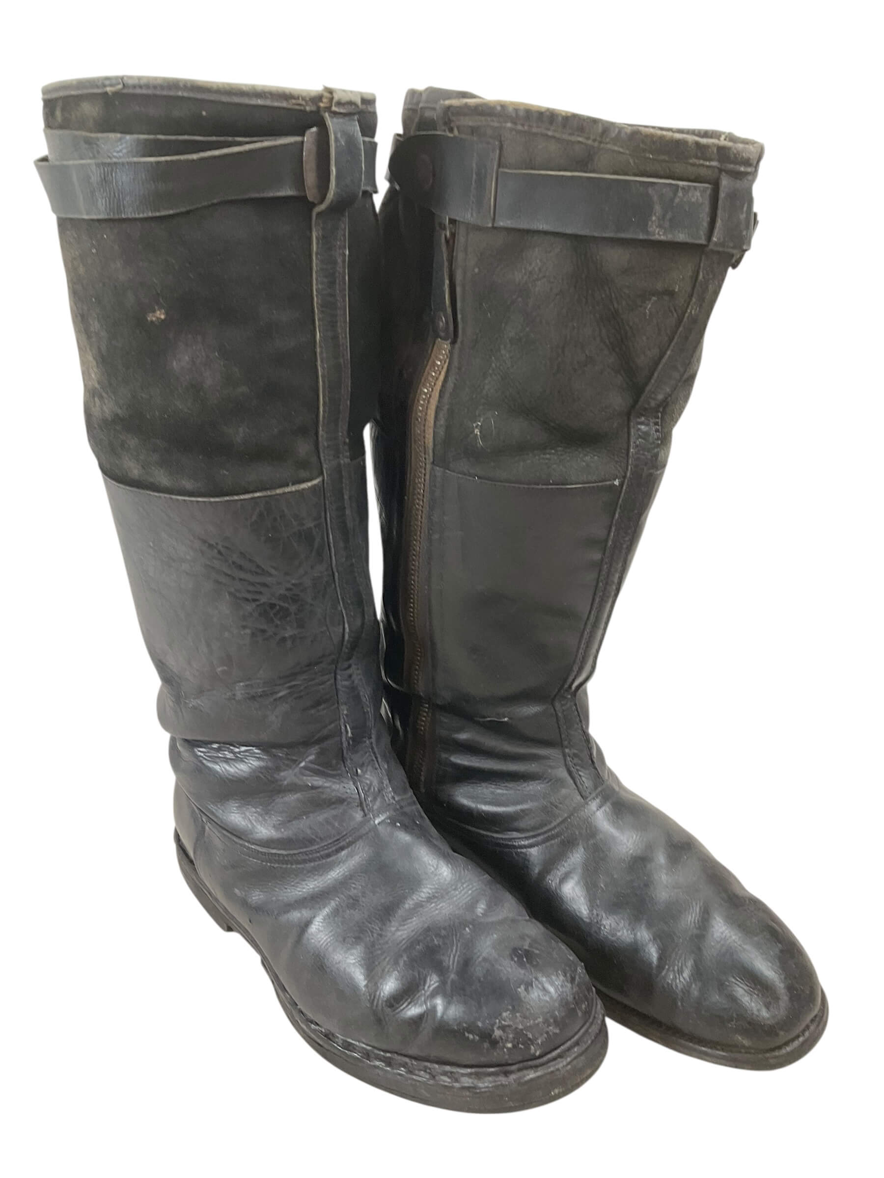 This item is a pair of WWII German Luftwaffe black leather flight boots, issued to aircrew members of the German Air Force during the Second World War. These boots are constructed from durable black leather, designed to provide protection and insulation during high-altitude flights. The uppers typically feature adjustable leather straps and metal buckles for a secure fit around the calf. The interior lining is often made of shearling or wool to offer additional warmth. The soles are generally composed of thick leather or rubber to resist wear and improve grip in aircraft and on the ground. Such flight boots formed standard part of the Luftwaffe flying kit and were worn by pilots and aircrew throughout the conflict. They are representative of mid-20th century military footwear technology and design, and are recognizable by their characteristic profile and materials. These boots are of interest to collectors, historians, and those studying WWII military aviation equipment.