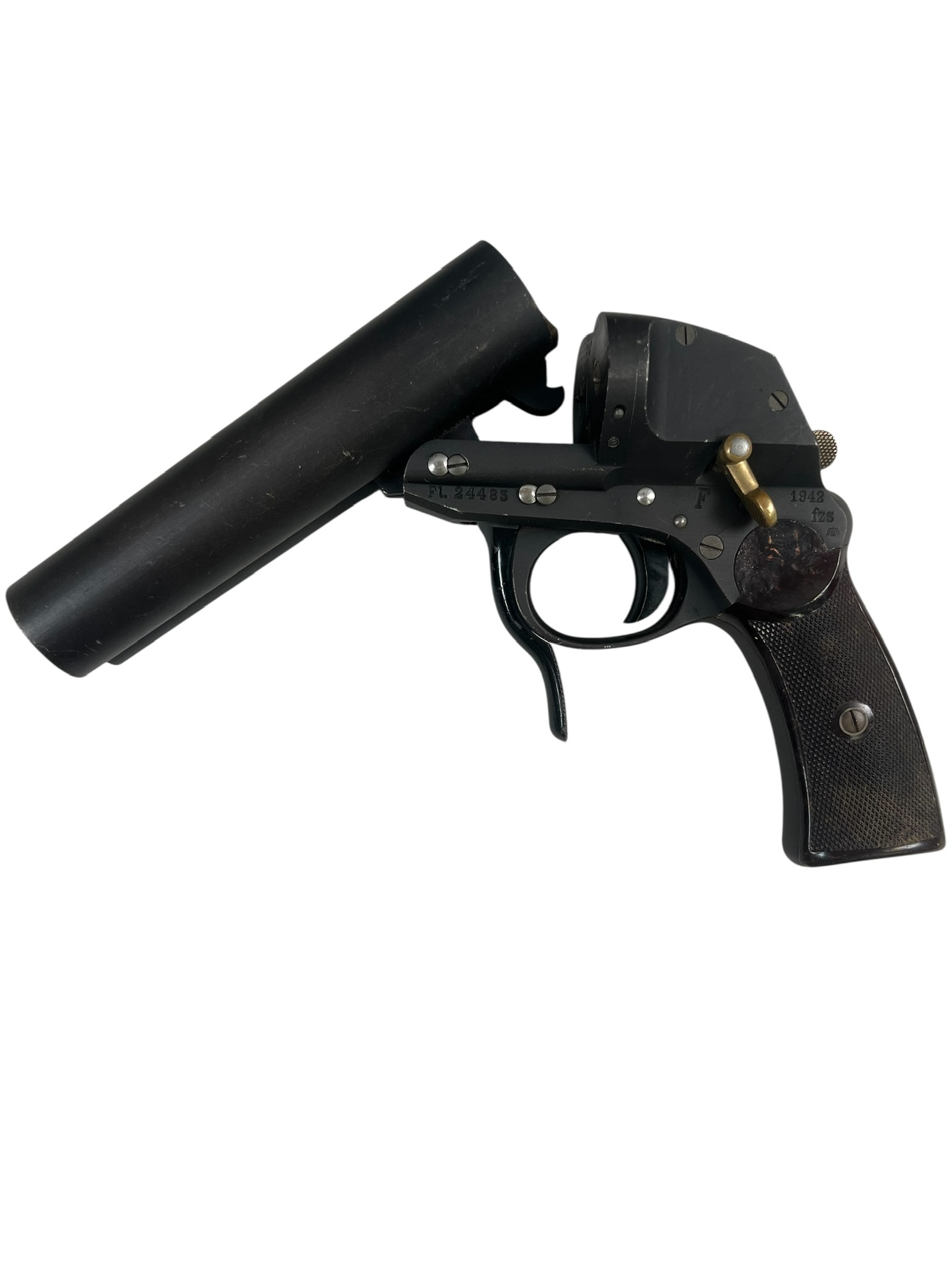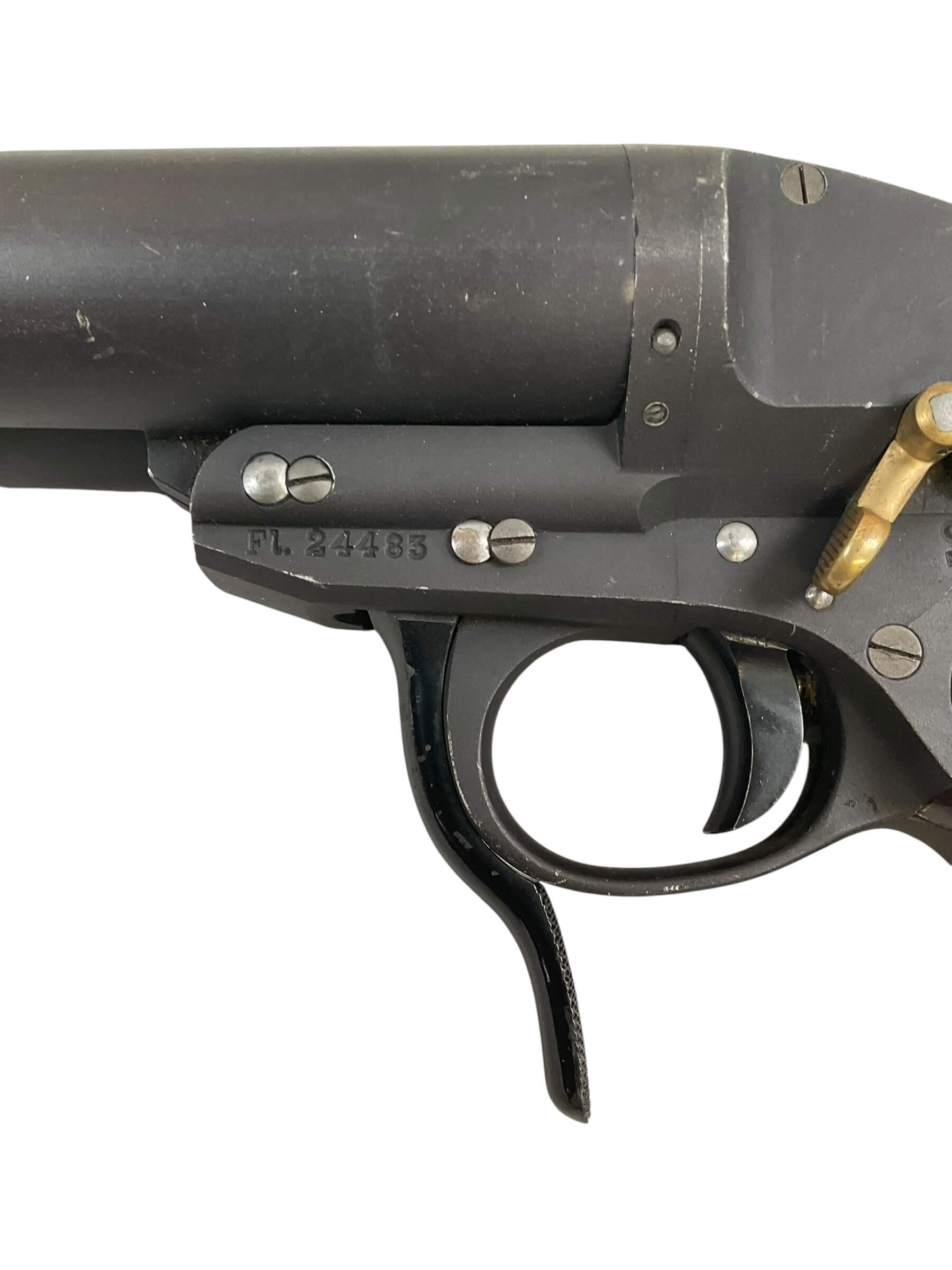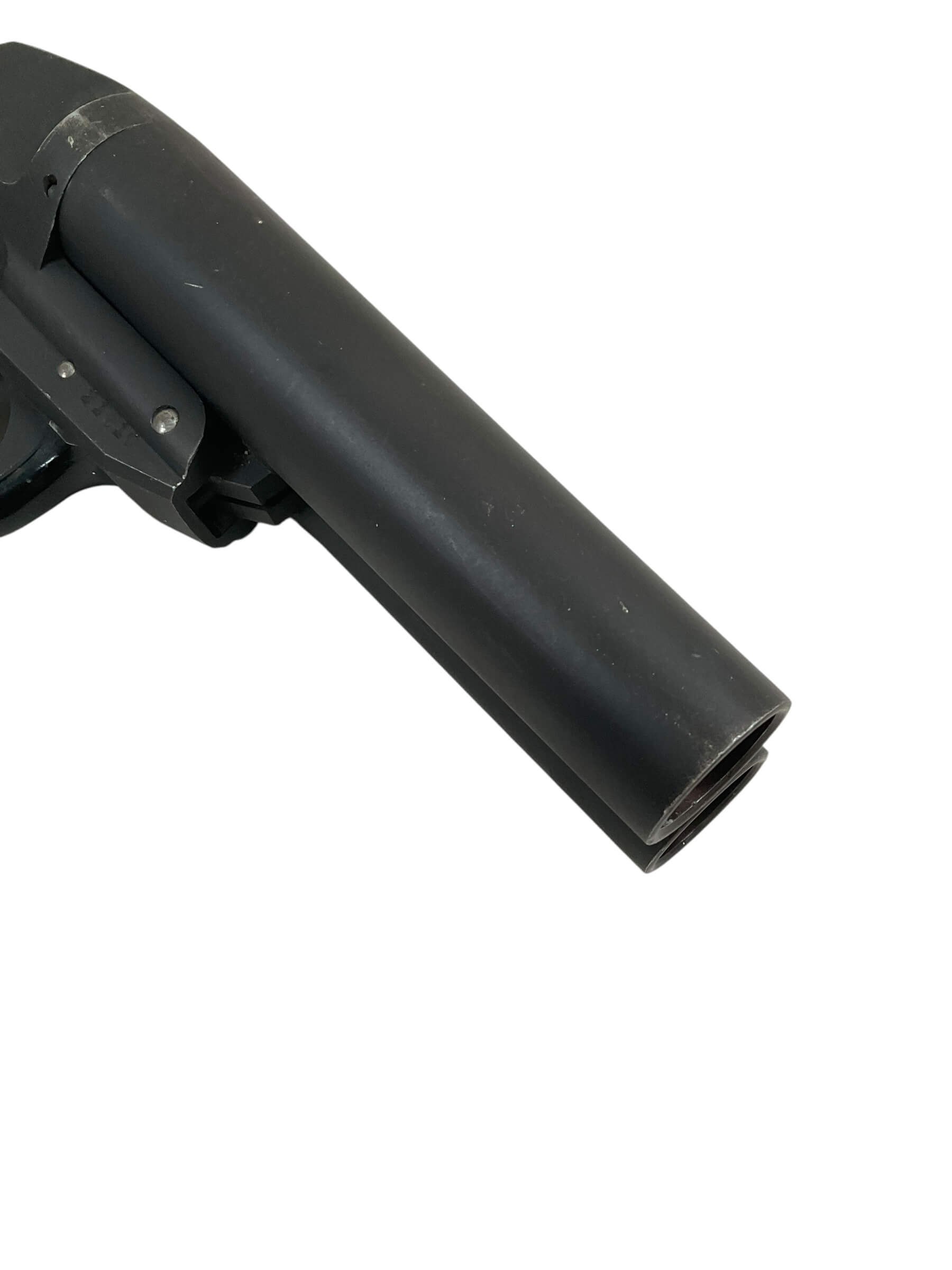 The WW2 German Luftwaffe Double Barrel Flare Pistol, dated 1942, is a military-issue signaling device utilized by the German Air Force during the Second World War. Constructed predominantly from steel with a bakelite or metal grip, this non-firing flare pistol features a distinctive double barrel design, allowing for the sequential firing of two flares without reloading. The top break action provides easy access for loading and unloading. Serial numbers, Luftwaffe acceptance marks, and manufacture dates are typically stamped on the frame and barrels, confirming authenticity and period origin. Flare pistols such as this were used for signaling, illumination, and communication between aircraft and ground forces. Classified as a historical artifact, this item does not require a permit for ownership under current regulations. This example retains its original wartime markings and represents a significant example of German military engineering from the era. For display purposes only; not functional as a firearm.