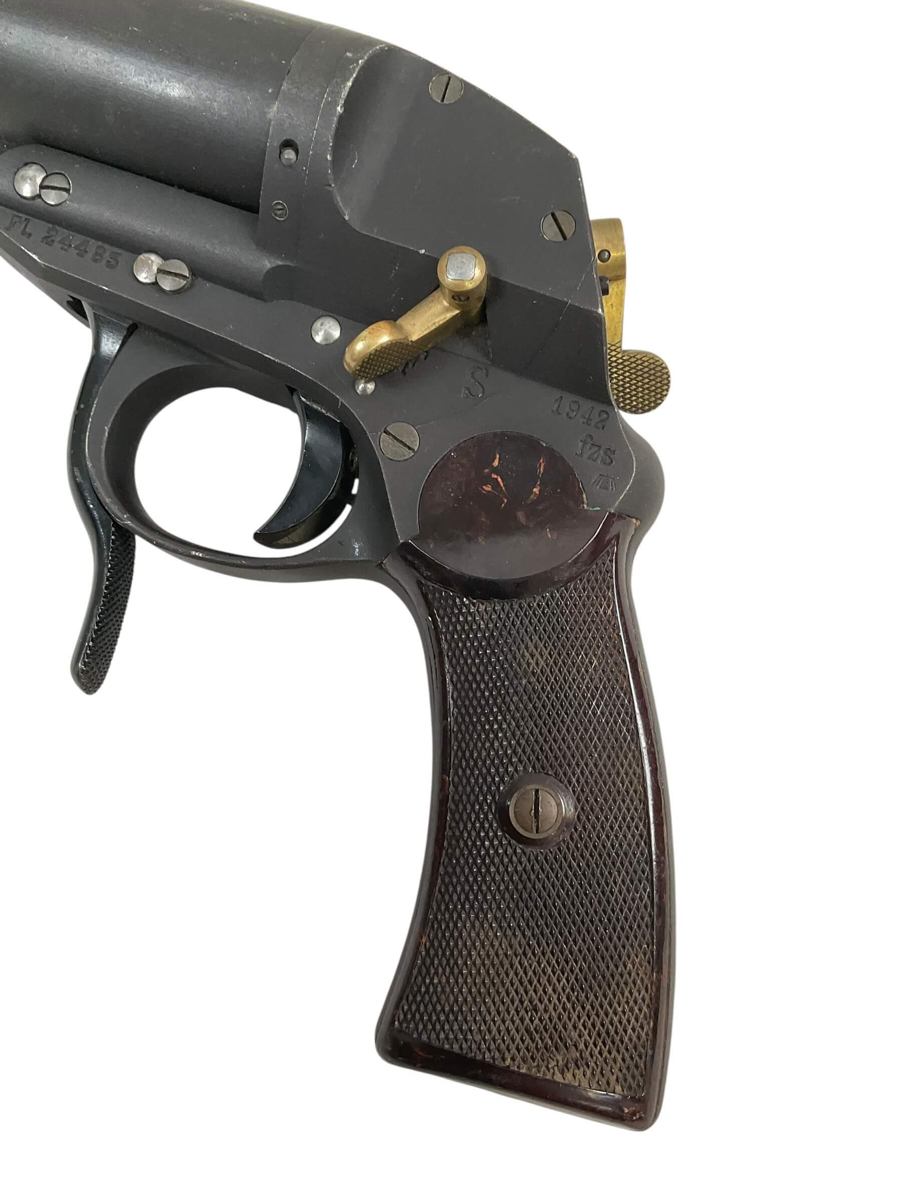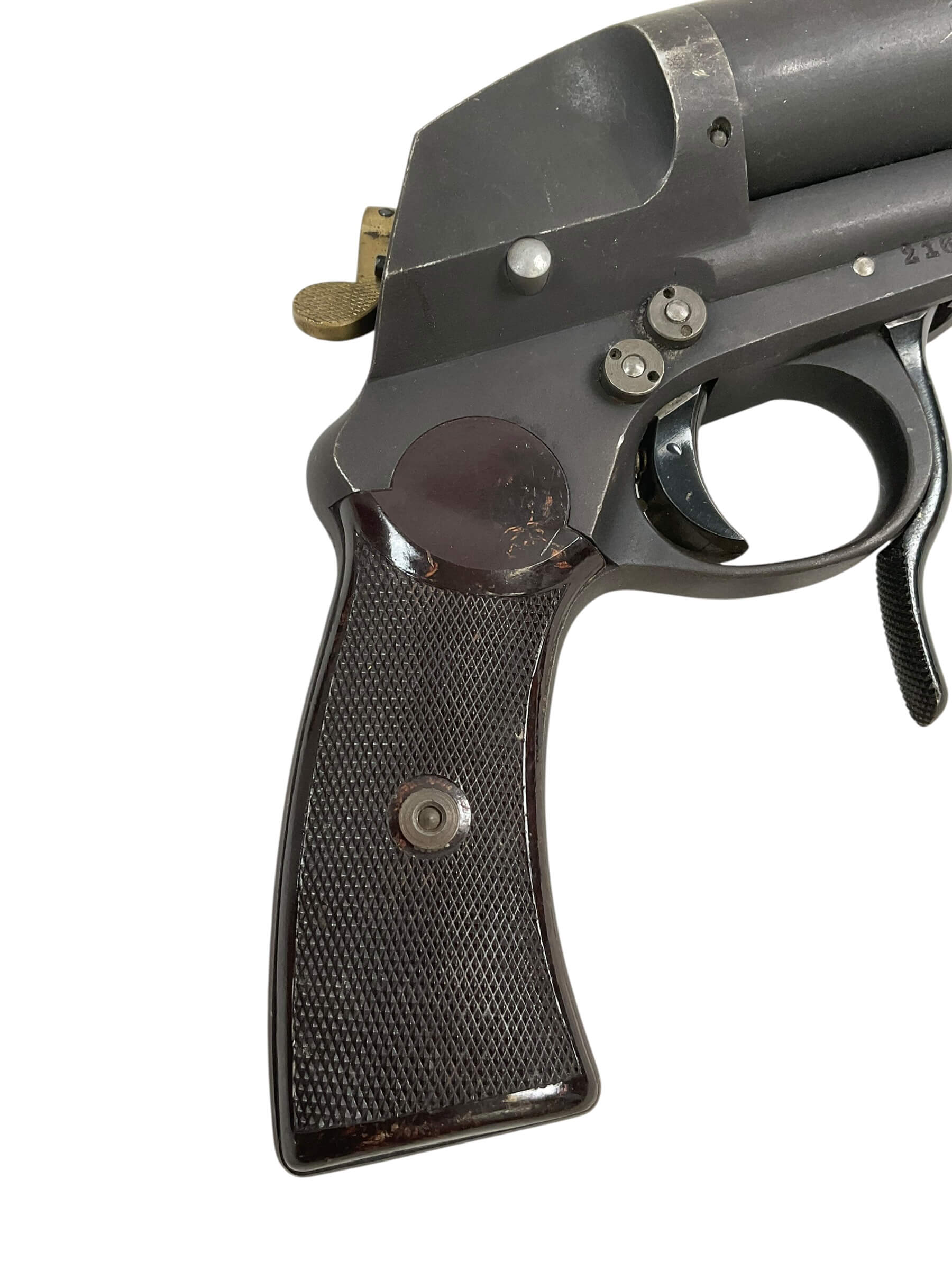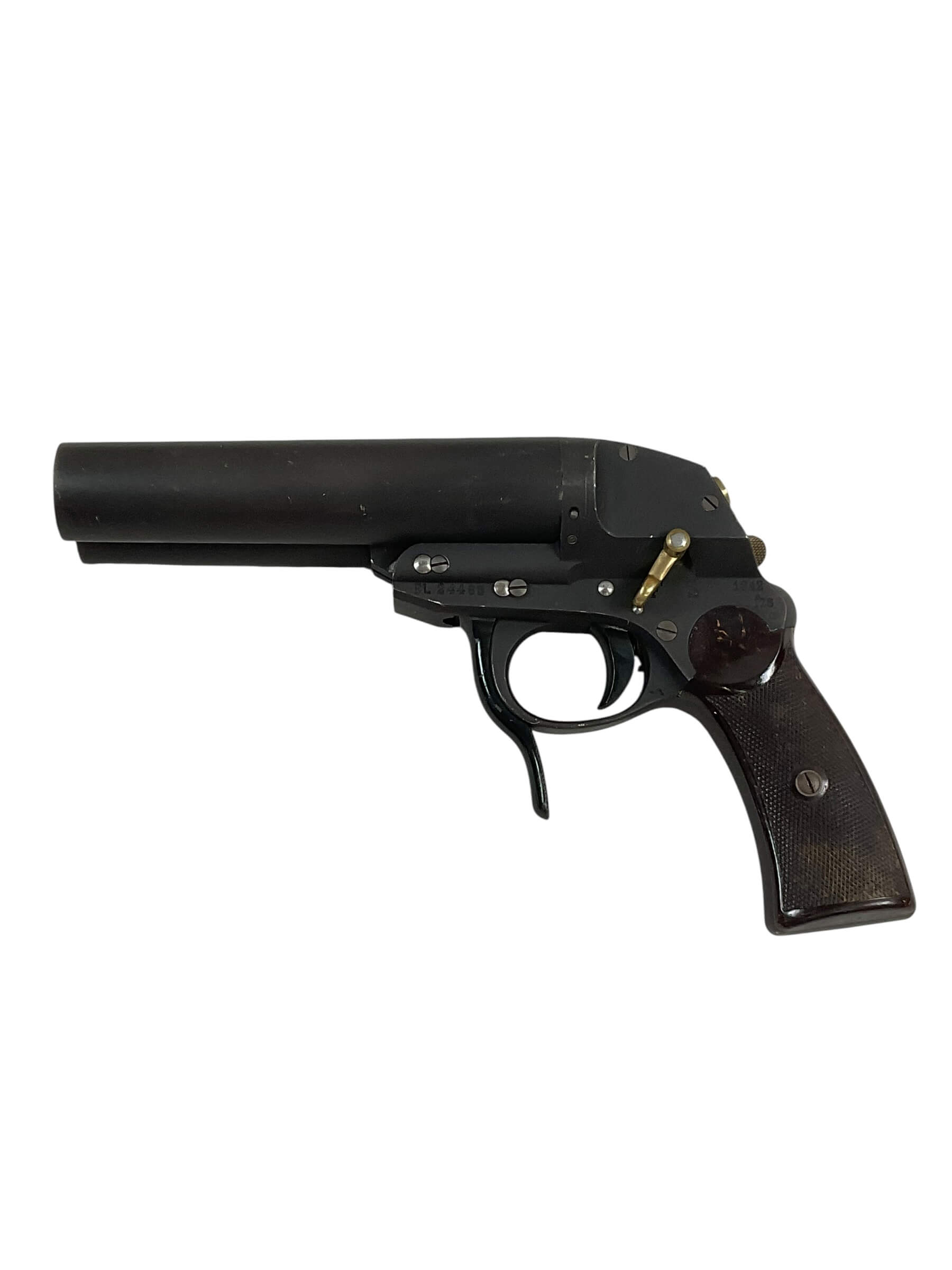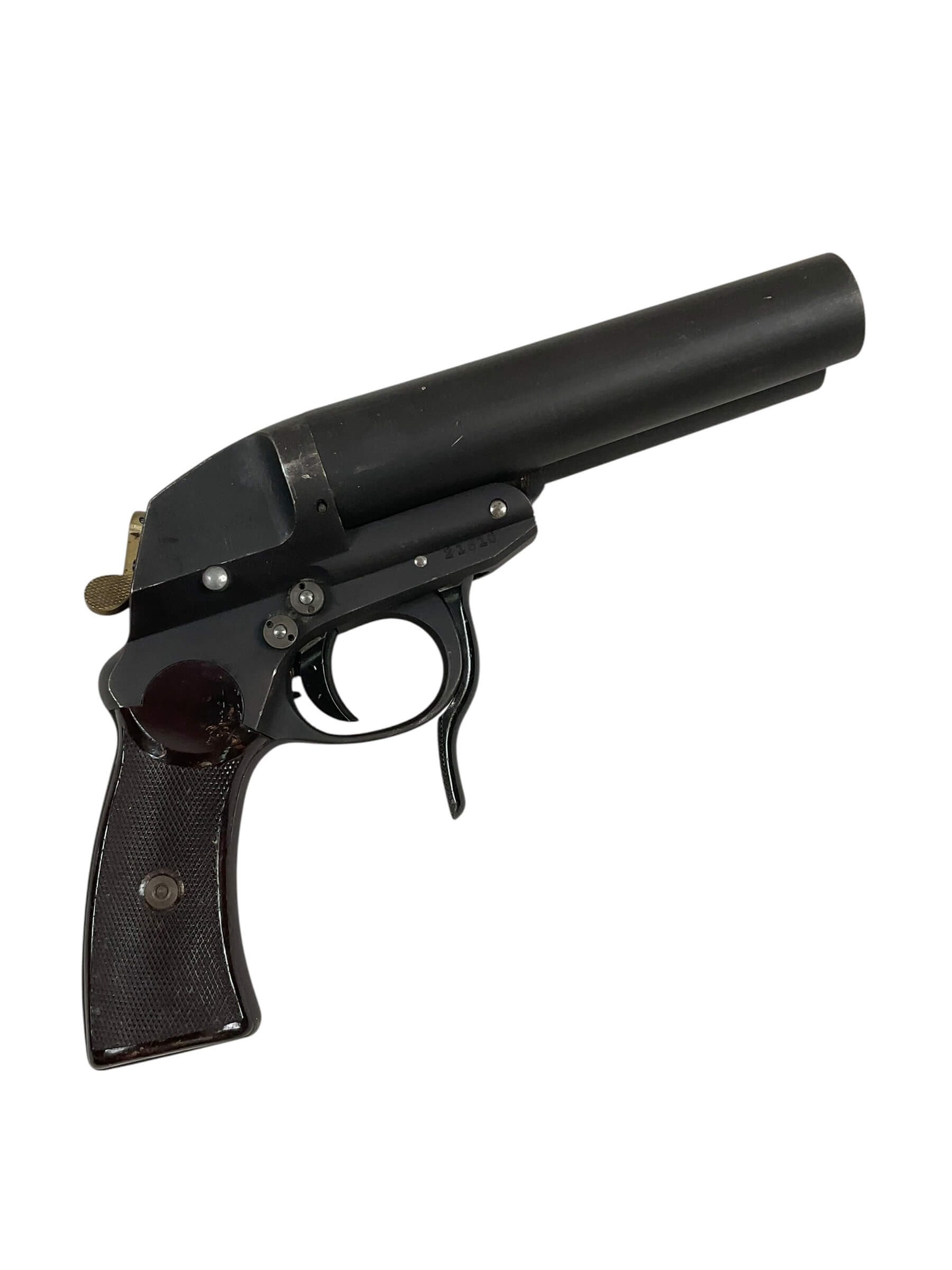 The WW2 German Luftwaffe Double Barrel Flare Pistol, dated 1942, is a military-issue signaling device utilized by the German Air Force during the Second World War. Constructed predominantly from steel with a bakelite or metal grip, this non-firing flare pistol features a distinctive double barrel design, allowing for the sequential firing of two flares without reloading. The top break action provides easy access for loading and unloading. Serial numbers, Luftwaffe acceptance marks, and manufacture dates are typically stamped on the frame and barrels, confirming authenticity and period origin. Flare pistols such as this were used for signaling, illumination, and communication between aircraft and ground forces. Classified as a historical artifact, this item does not require a permit for ownership under current regulations. This example retains its original wartime markings and represents a significant example of German military engineering from the era. For display purposes only; not functional as a firearm.