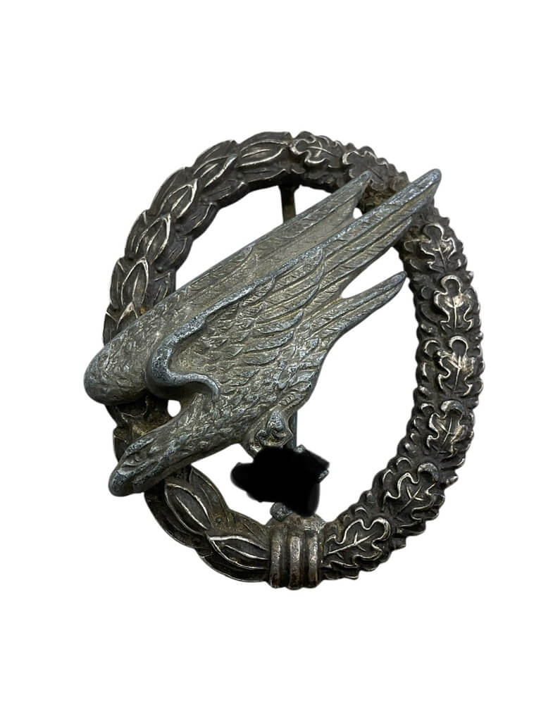 This is a rare WWII German Luftwaffe Fallschirmjager Airborne Qualification Badge, unit marked to the 16th Battery of the 1st FJ Division. The badge features the iconic Luftwaffe eagle diving, signifying the airborne status of the wearer. It is carefully crafted in metal, exhibiting the superior German craftsmanship of the era. The badge is unit marked to Feldpost #50713 which is 16th Battery of the Fallschirmjager Artillery Regiment #1 of the 1st Fallschirmjager Division, a prestigious airborne division in the German Luftwaffe during WWII. This treasured artifact not only represents the valor and skill of the German paratroopers but also serves as a tangible link to the dramatic events of the Second World War. NORMALLY WE DO NOT PUT ANY CREDIT ON NAMED GERMAN BADGES BUT THIS CAME FROM A MUSEUM BASEMENT THAT DIDNT NEED IT SO WE ARE SURE IT IS GOOD BUT WITH EVERYTHING BUY THE ITEM NOT THE STORY. LIGHTLY SCRATCHED INTO THE WREATH ALONG WITH THE FORMER OWNERS INITIALS OF MB OR BM