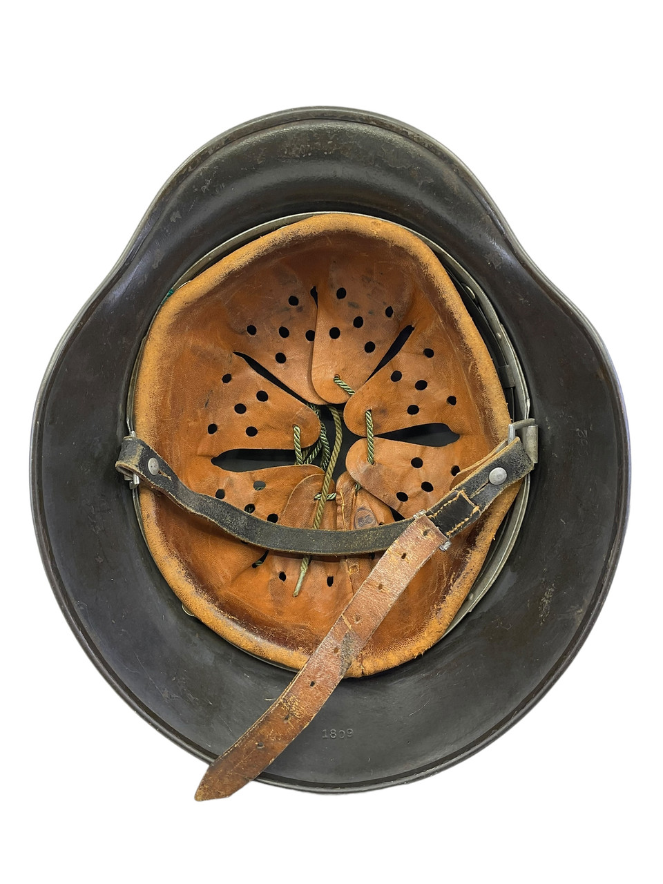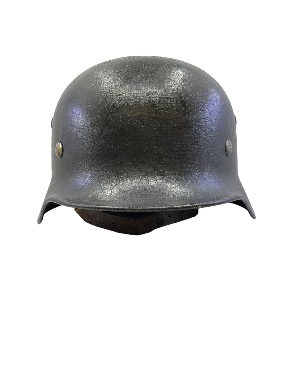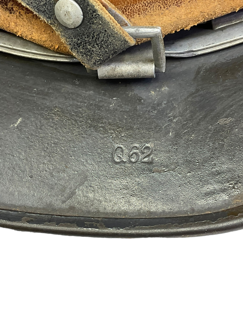 This WW2 German Luftwaffe M35 Single Decal Helmet, stamped with the maker code Q62, is a remarkable piece of military history, capturing the essence of the era’s aviation warfare. The lot number, 1809, identifies it as an authentic artifact manufactured during the tumultuous years of the Second World War. The single decal, emblematic of the Luftwaffe—Germany’s formidable air force—remains prominently displayed on the helmet’s smooth exterior, a testament to its storied past. Crafted from steel, the M35 model was known for its robustness and functionality, offering protection and a distinguished look to its wearers. This helmet not only holds historical significance but also serves as a symbol of the engineering prowess and design excellence of the era. Collectors and history enthusiasts will appreciate the helmet’s well-preserved condition, making it a sought-after addition to any World War II memorabilia collection.