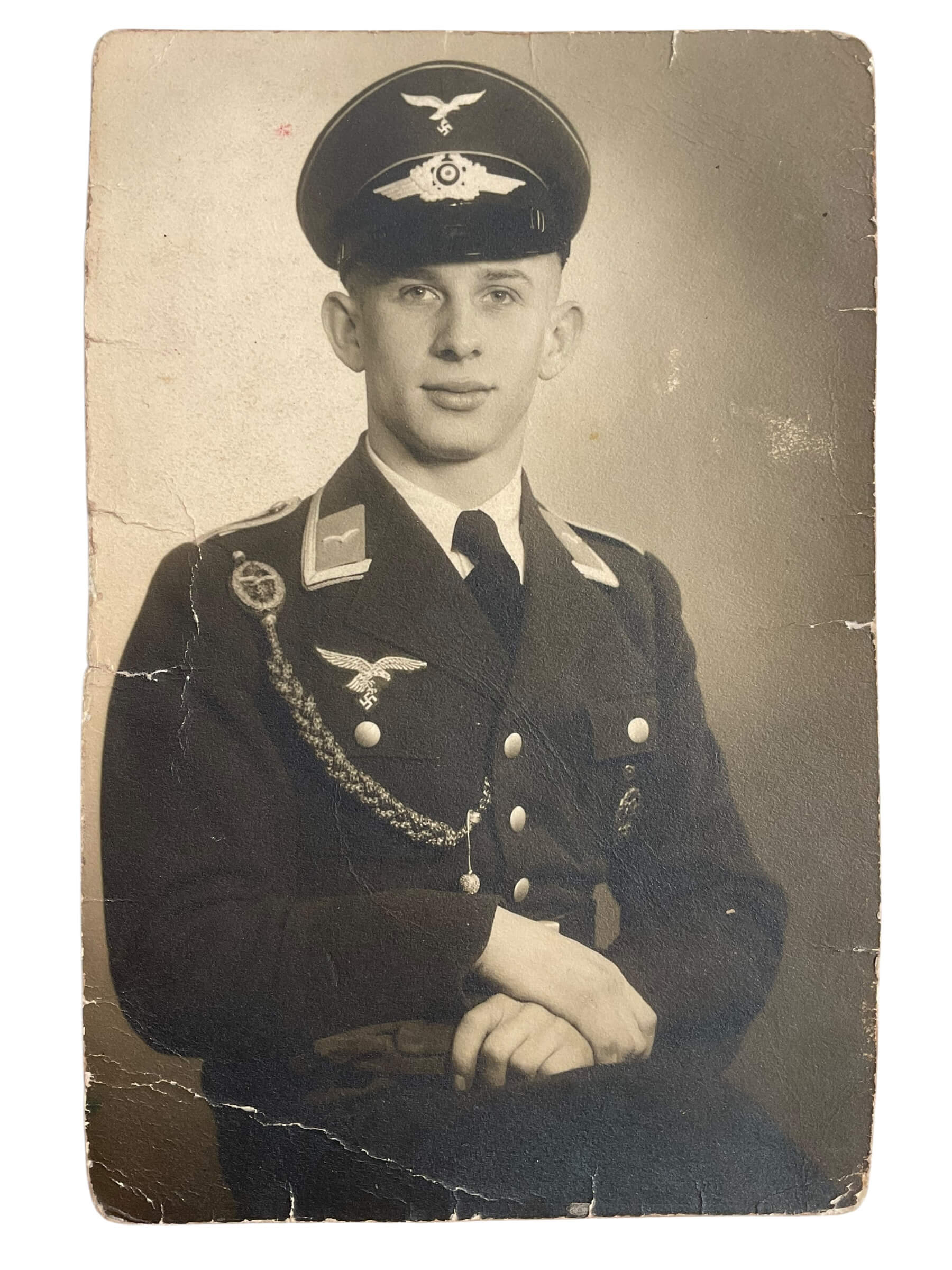 This item is an original World War II German Luftwaffe officer’s portrait photograph postcard. The postcard features a formal studio portrait of a Luftwaffe officer in uniform, captured in black and white. The officer is depicted wearing the standard Luftwaffe service dress, including insignia that identify rank and branch of service. Such portrait postcards were commonly produced and distributed during the wartime period for personal use, often sent to family members or kept as mementos.  The reverse of the postcard may include a blank space for correspondence and address, conforming to period conventions. Items of this nature are valued for their historical context, offering insight into German military personnel and photographic practices during the Second World War. No reproductions or modifications are present unless otherwise stated in the condition notes.