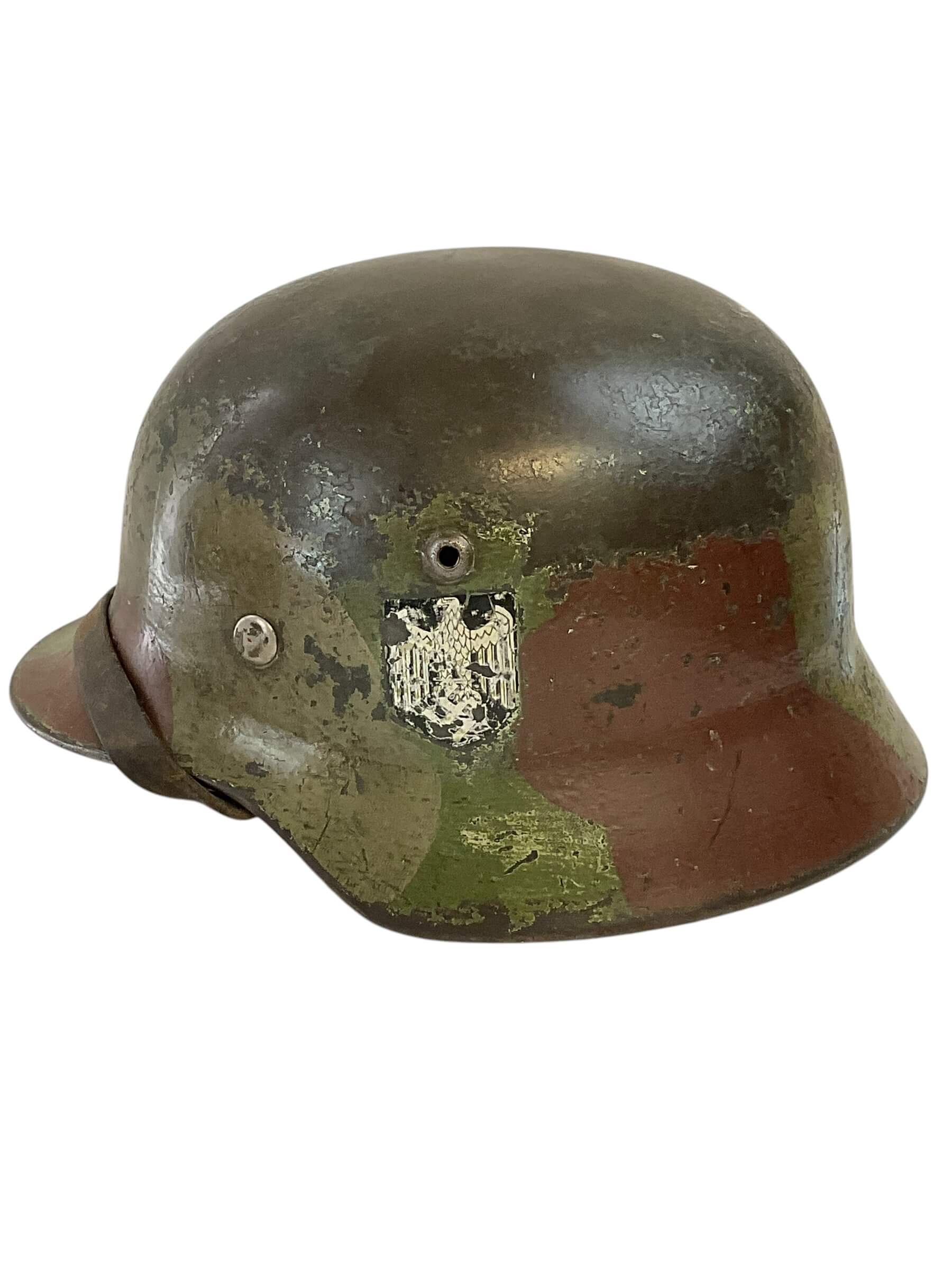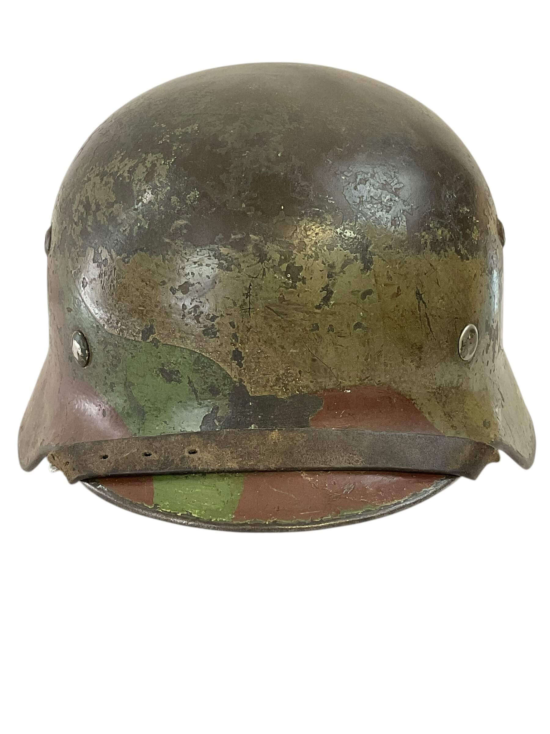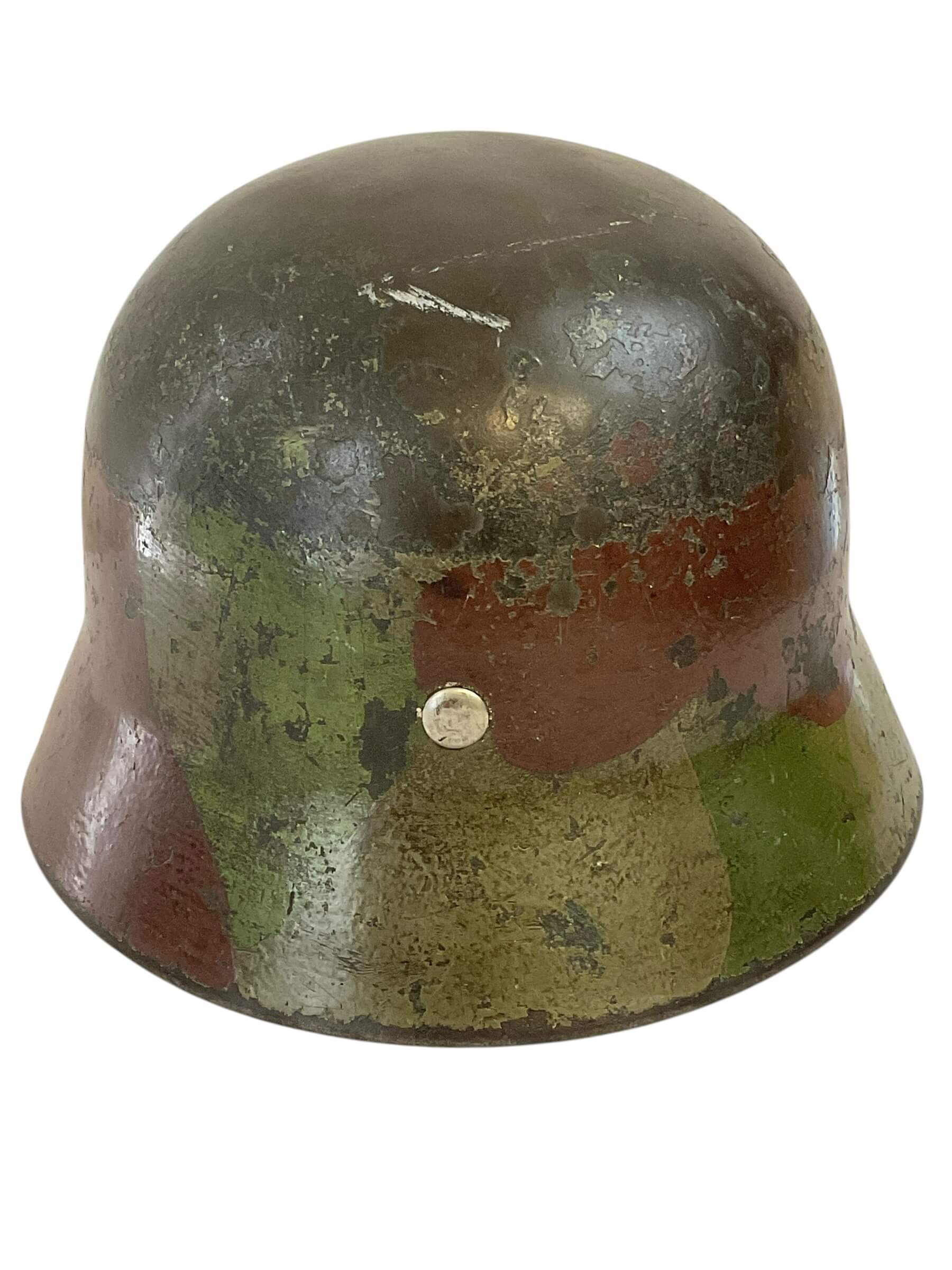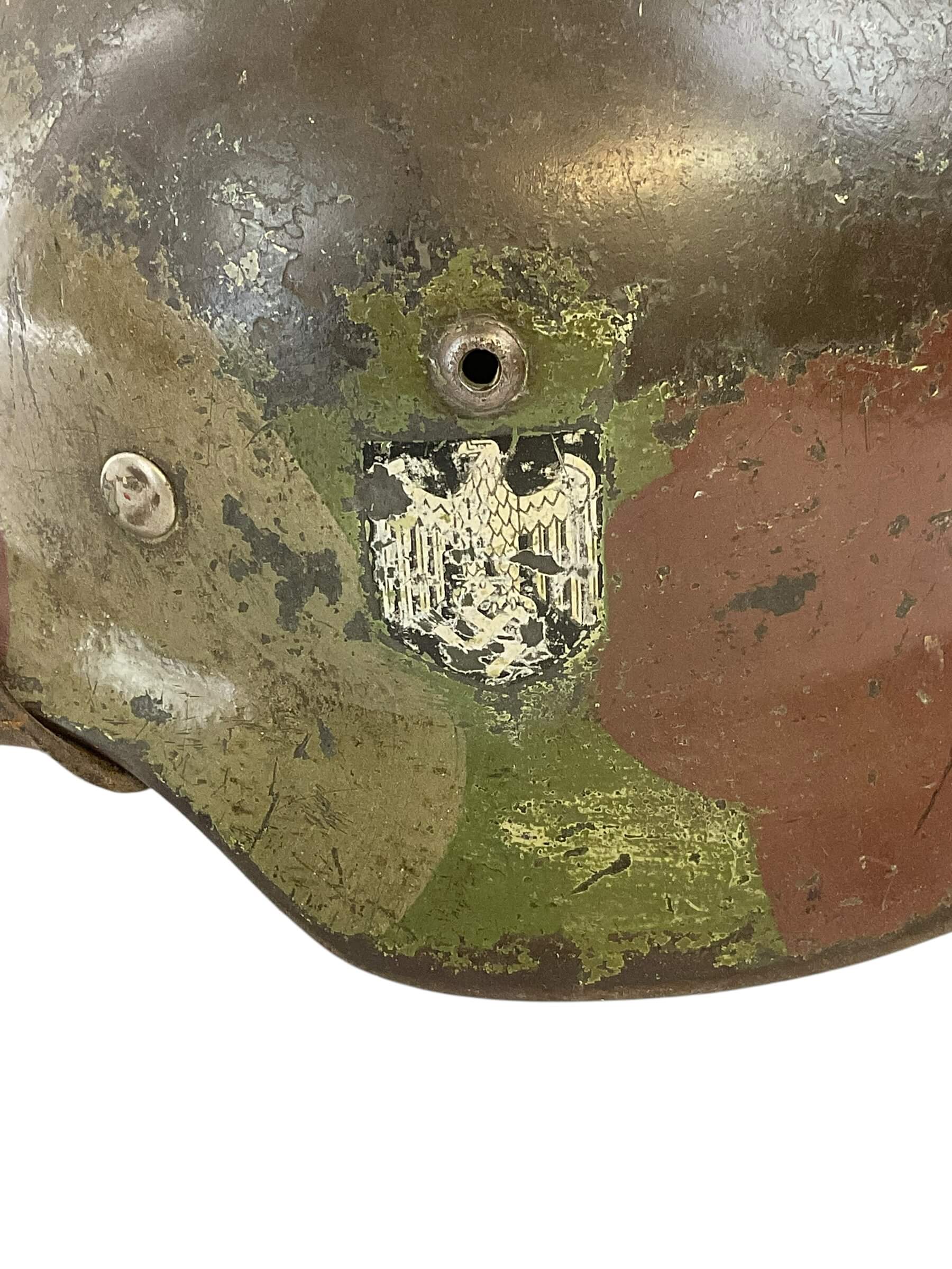 This is a WWII German M35 SD Single Decal Camouflage Named Steel Helmet, SE62, part of Lot #3549. This historical artifact stands as a testament to the harsh realities of the Second World War. The helmet features an original camouflage pattern, applied by the soldier who would have worn it, making it a unique piece of wartime memorabilia. The single decal indicates its authenticity as a German Wehrmacht-issued piece. It’s size SE62, suitable for display or for collectors with a specific focus on German military history. The named aspect suggests it was once the personal gear of a specific soldier, adding an extra layer of historical context and interest. This helmet embodies the courage, fear, and tragedy of one of the most significant events in world history.