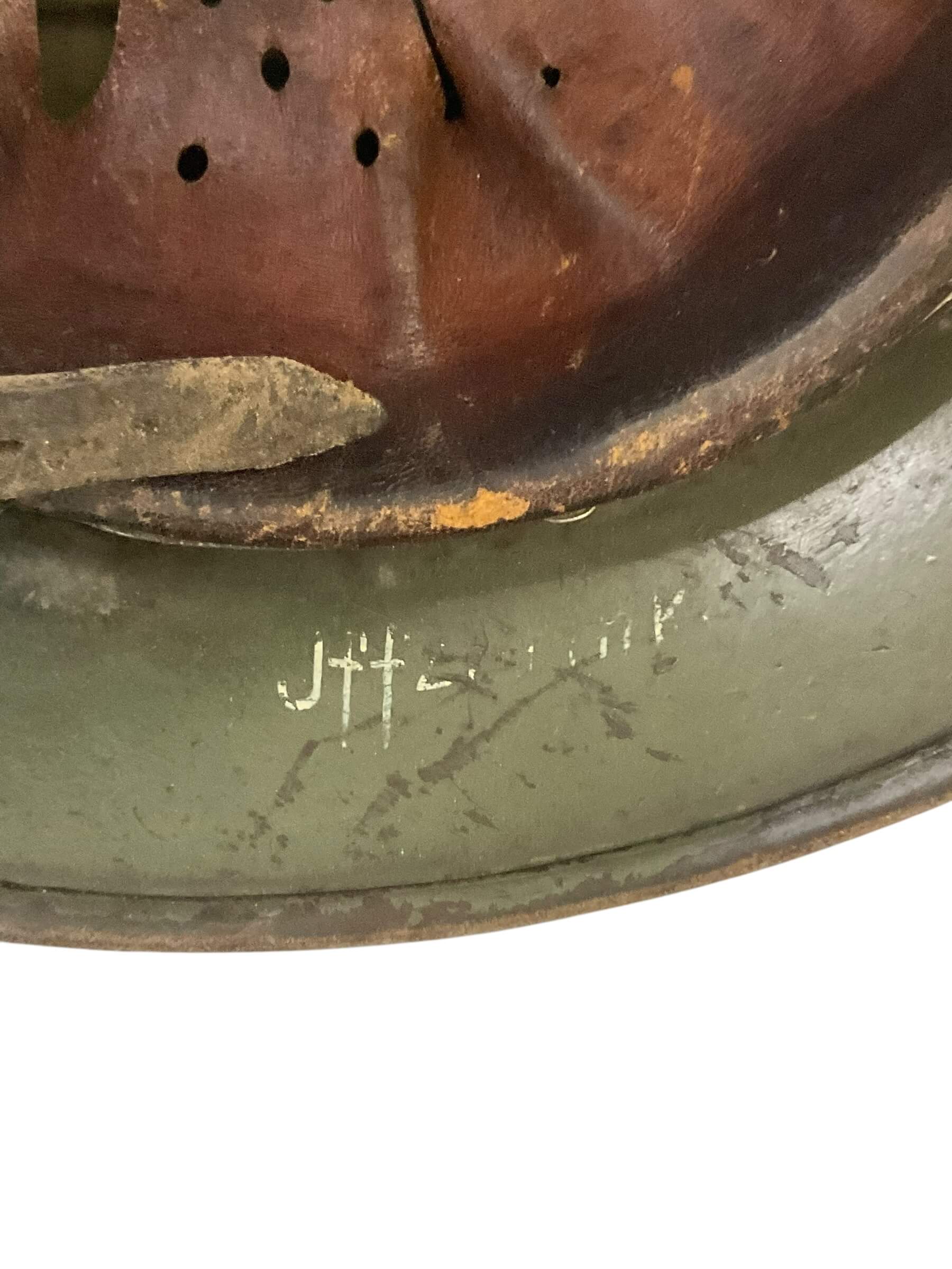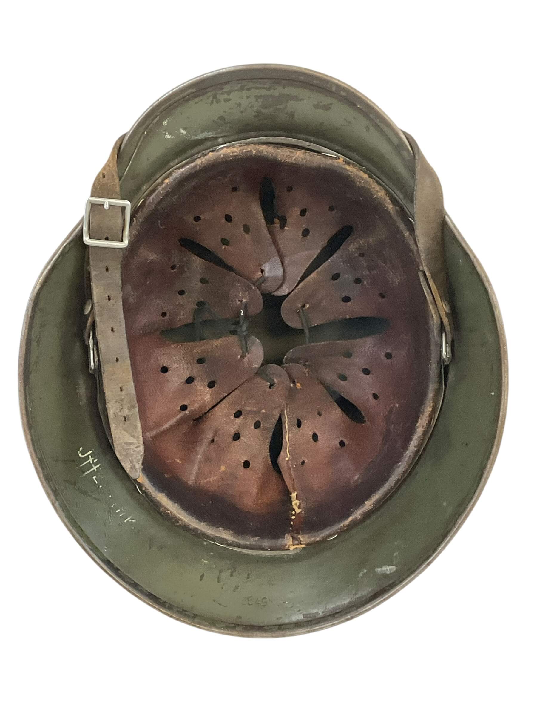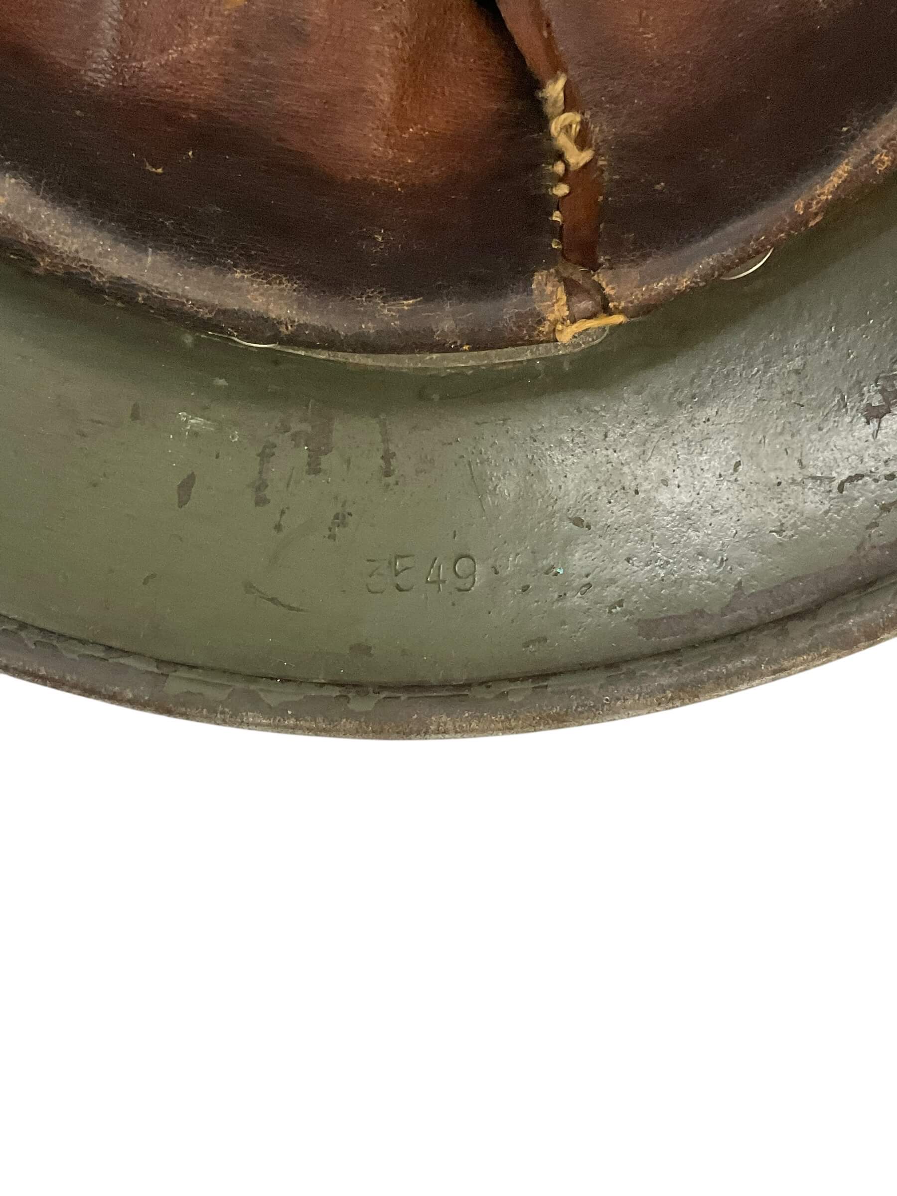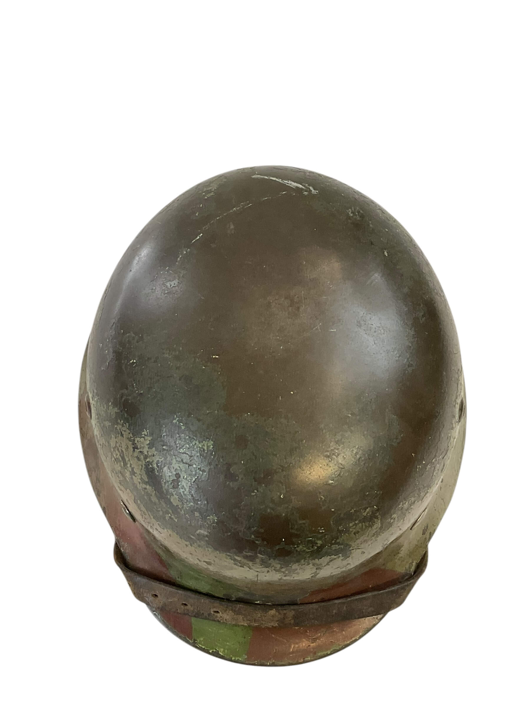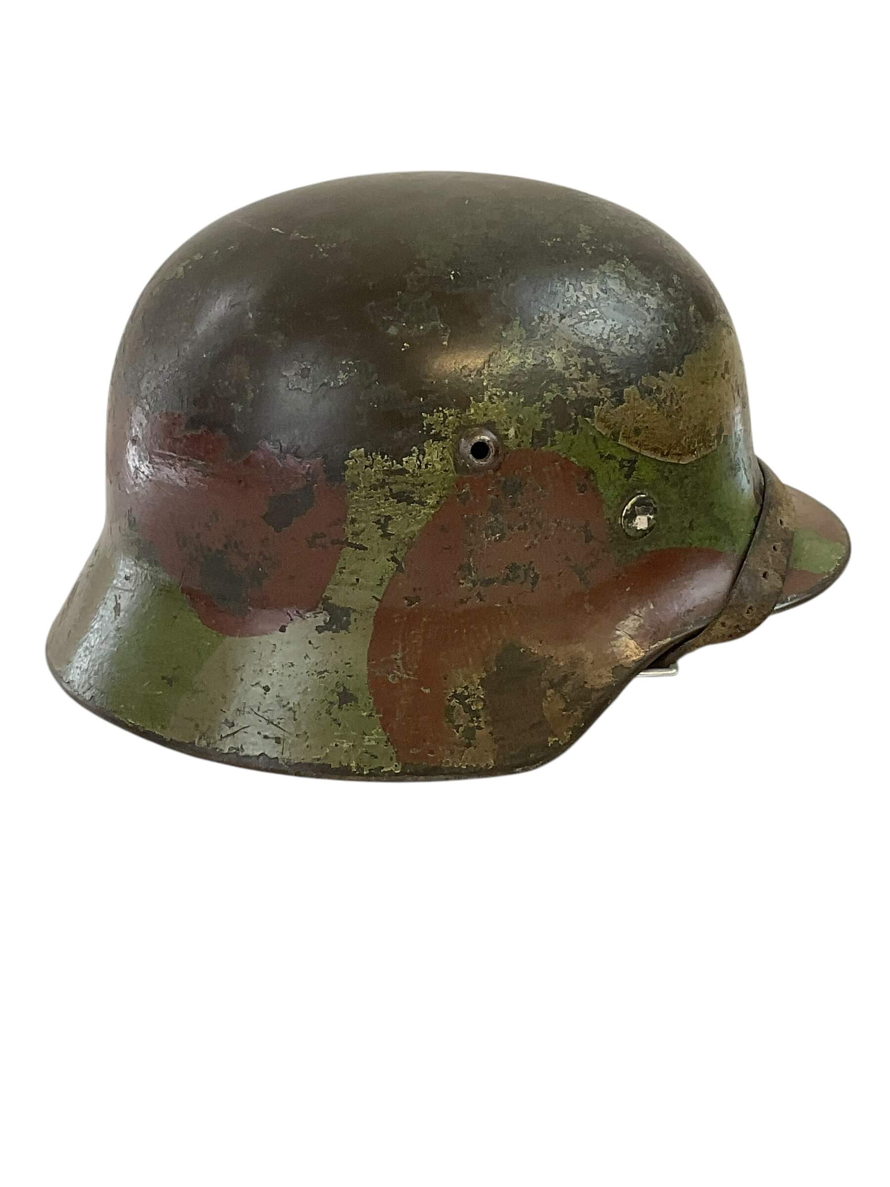 This is a WWII German M35 SD Single Decal Camouflage Named Steel Helmet, SE62, part of Lot #3549. This historical artifact stands as a testament to the harsh realities of the Second World War. The helmet features an original camouflage pattern, applied by the soldier who would have worn it, making it a unique piece of wartime memorabilia. The single decal indicates its authenticity as a German Wehrmacht-issued piece. It’s size SE62, suitable for display or for collectors with a specific focus on German military history. The named aspect suggests it was once the personal gear of a specific soldier, adding an extra layer of historical context and interest. This helmet embodies the courage, fear, and tragedy of one of the most significant events in world history.