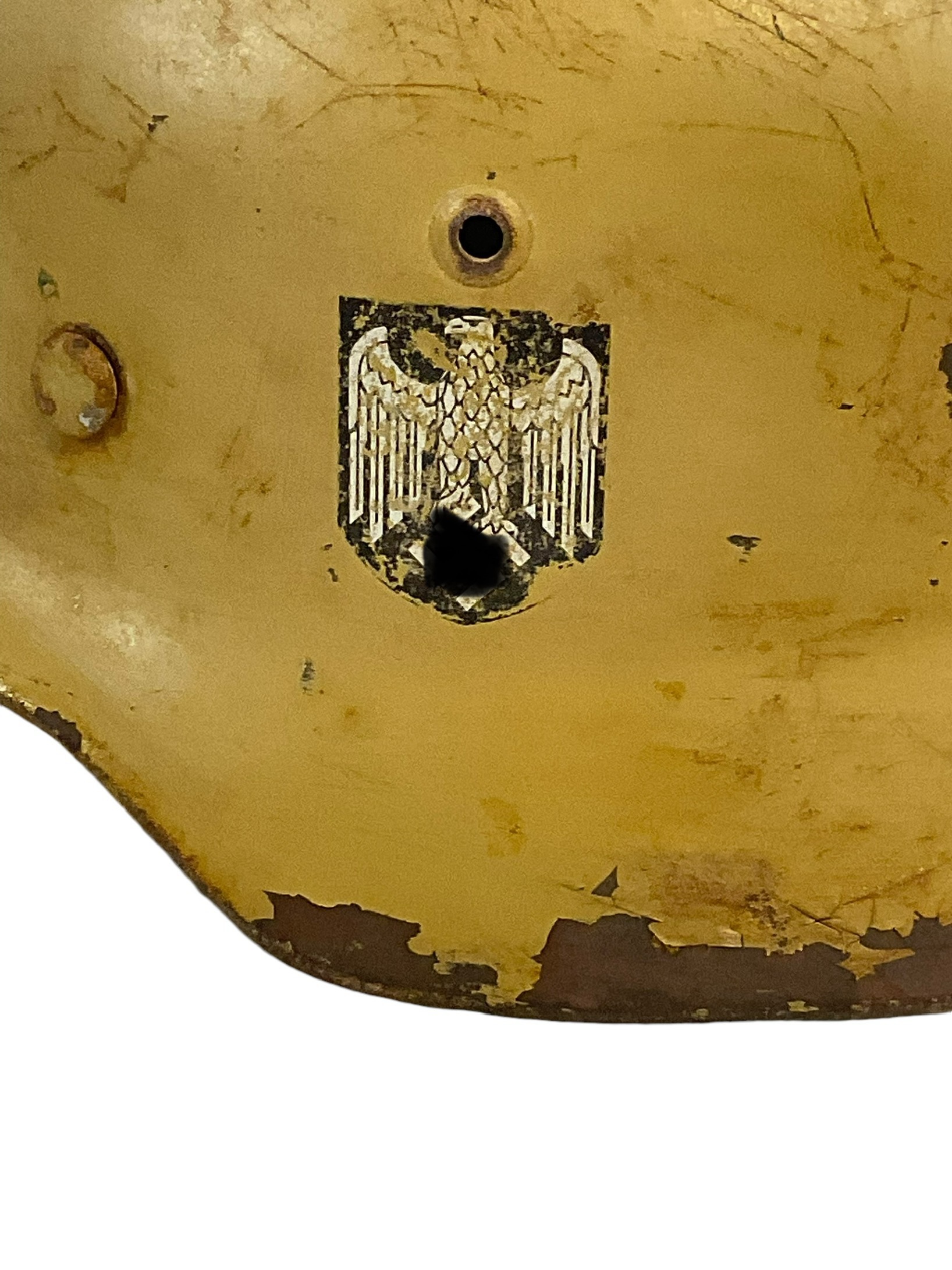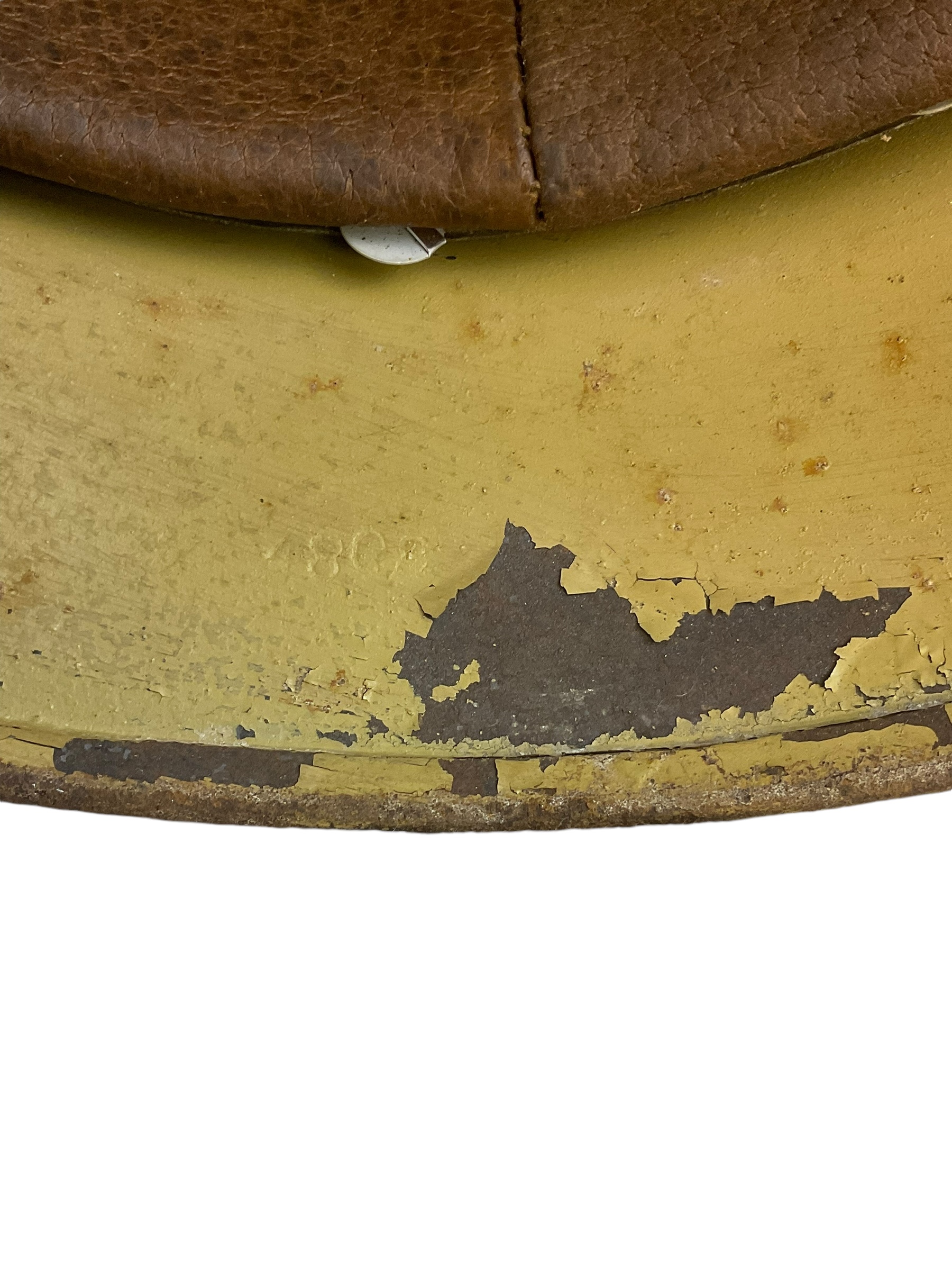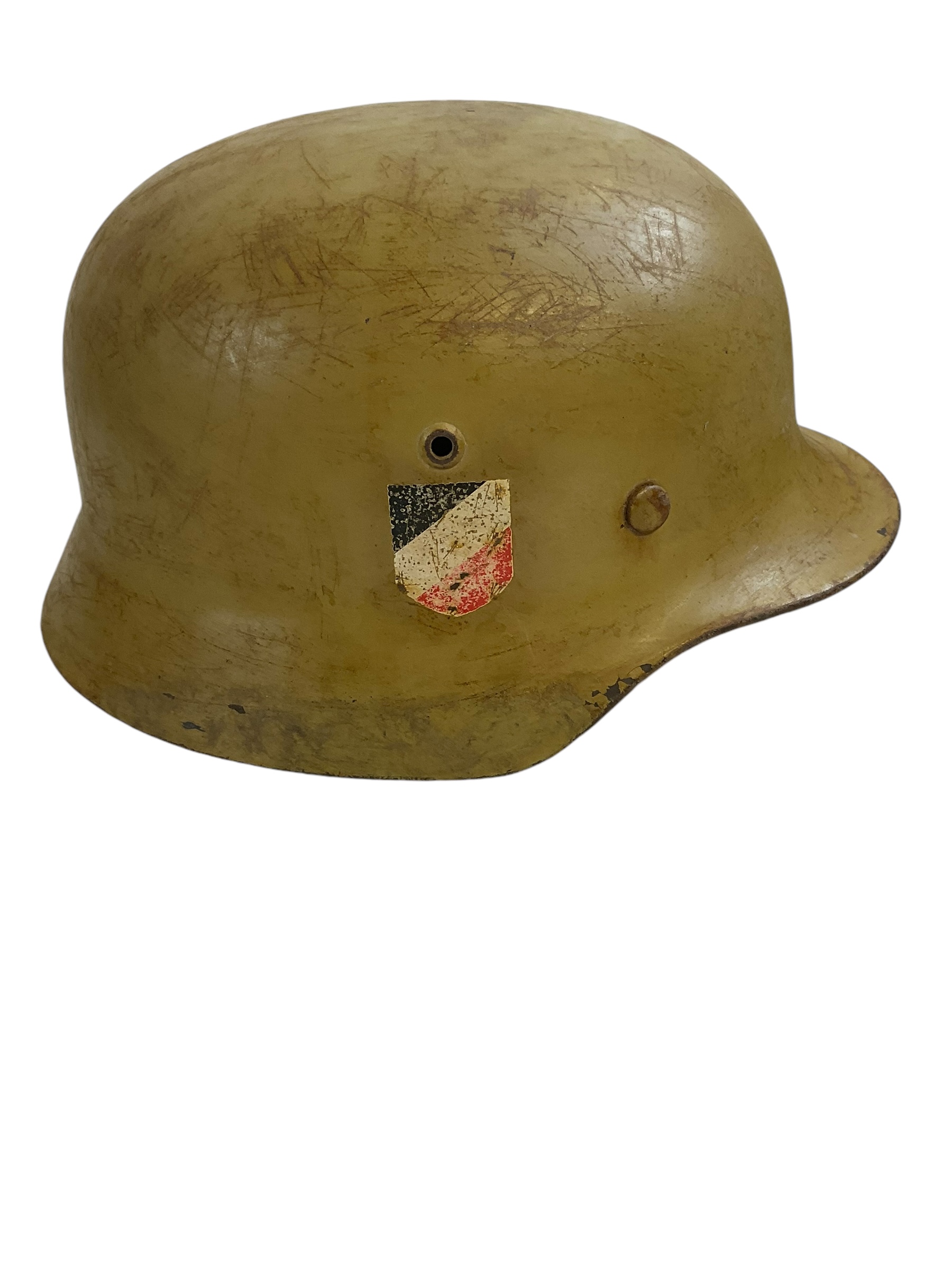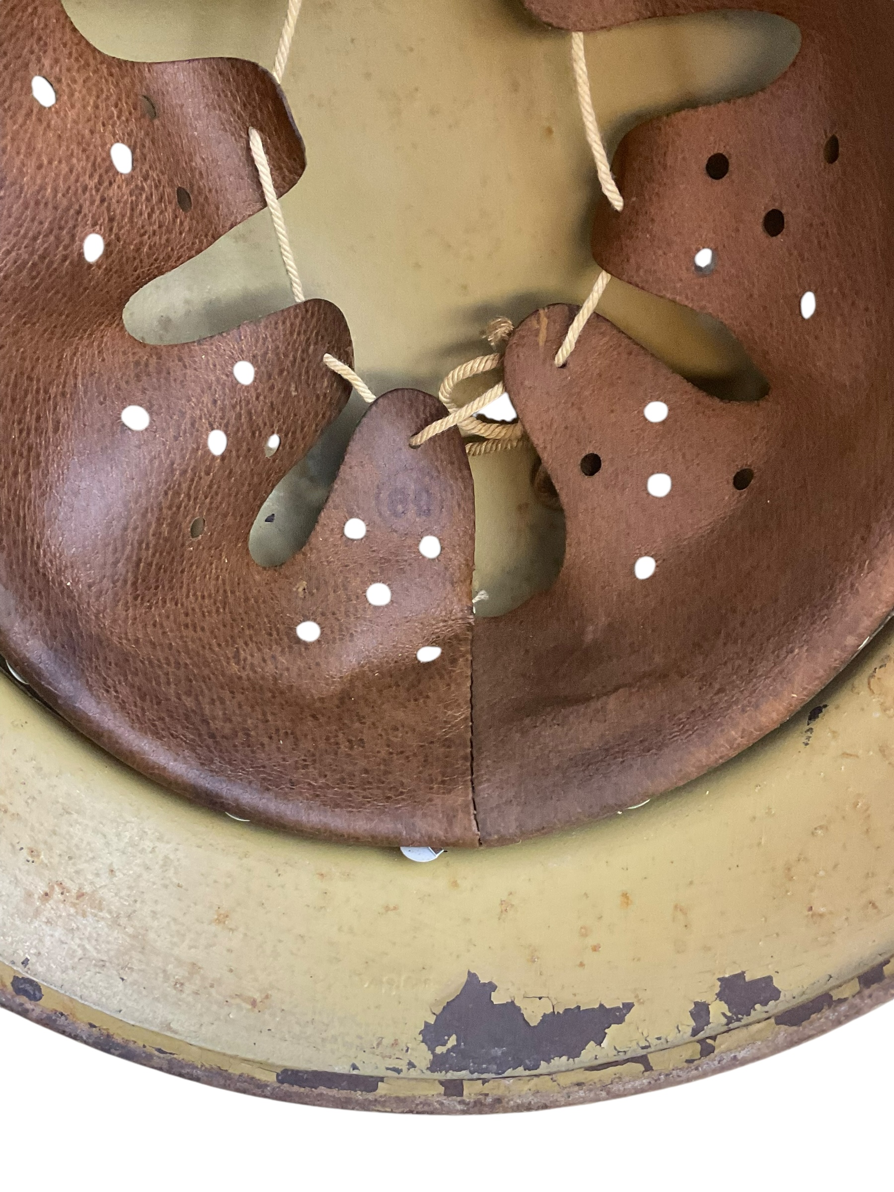 This is a restored original shell WWII German M35 Steel Helmet Q68. It is not an all original piece but an imitation, designed to resemble the authentic helmets used by German soldiers during the Second World War. The helmet is an original M35 steel shell and a DAK paint finish. It also carries the ‘Q68’ marking, indicating its size and Maker. Though this helmet is a fake, it has been restored to maintain a vintage look and feel. It serves as a fascinating piece of historical memorabilia and can be an excellent addition to any WWII collection or display. Please remember, this is not a genuine all original piece.