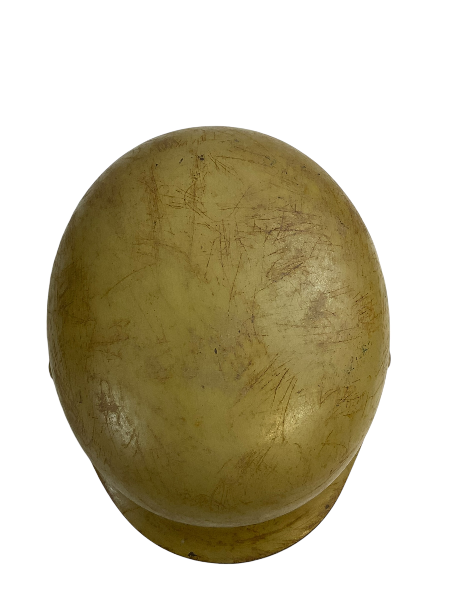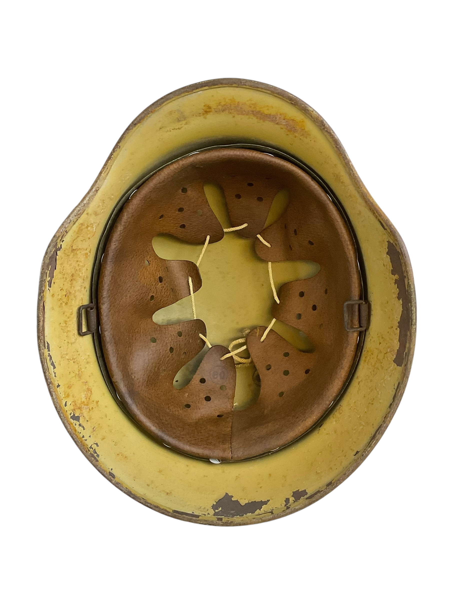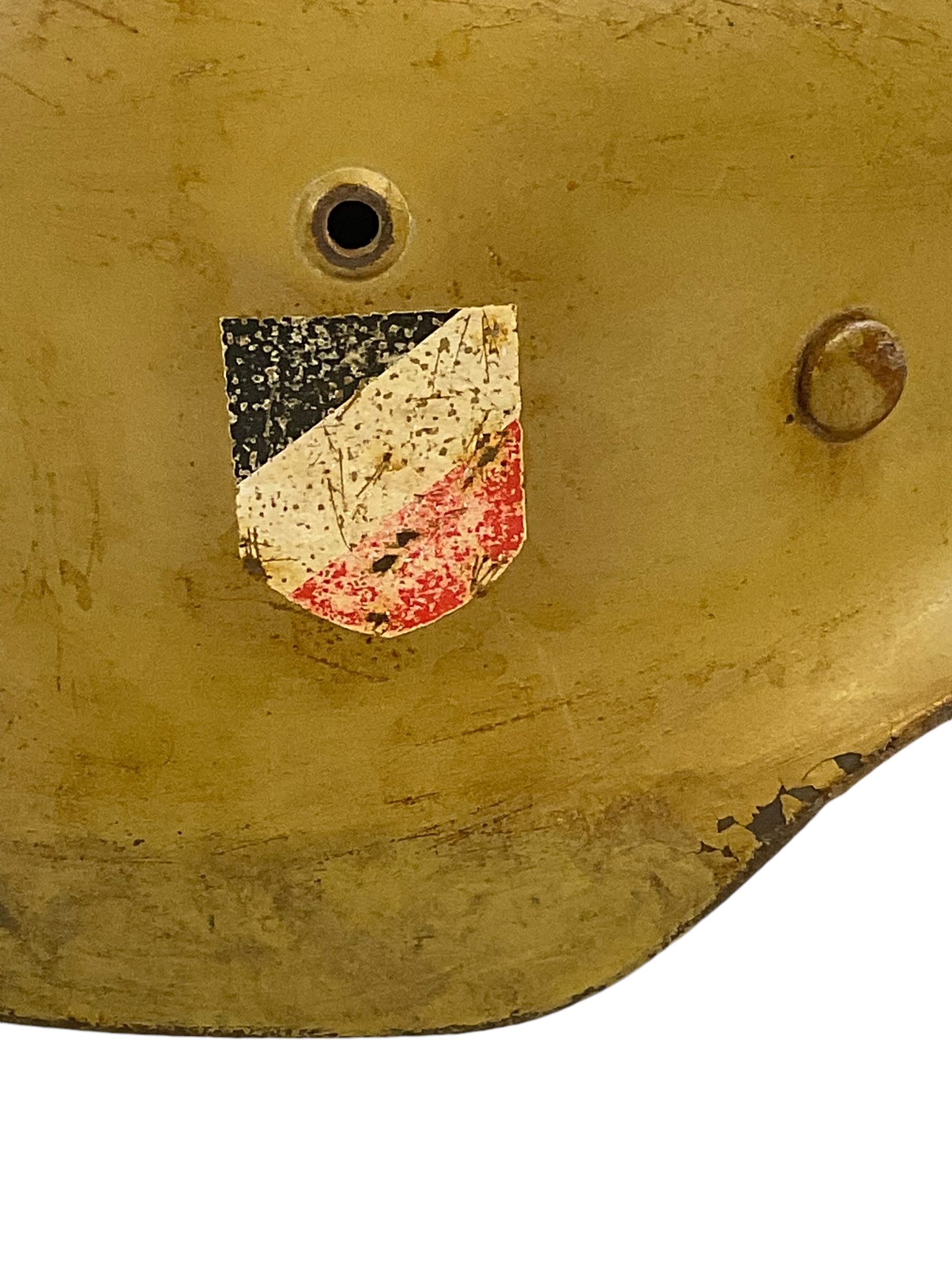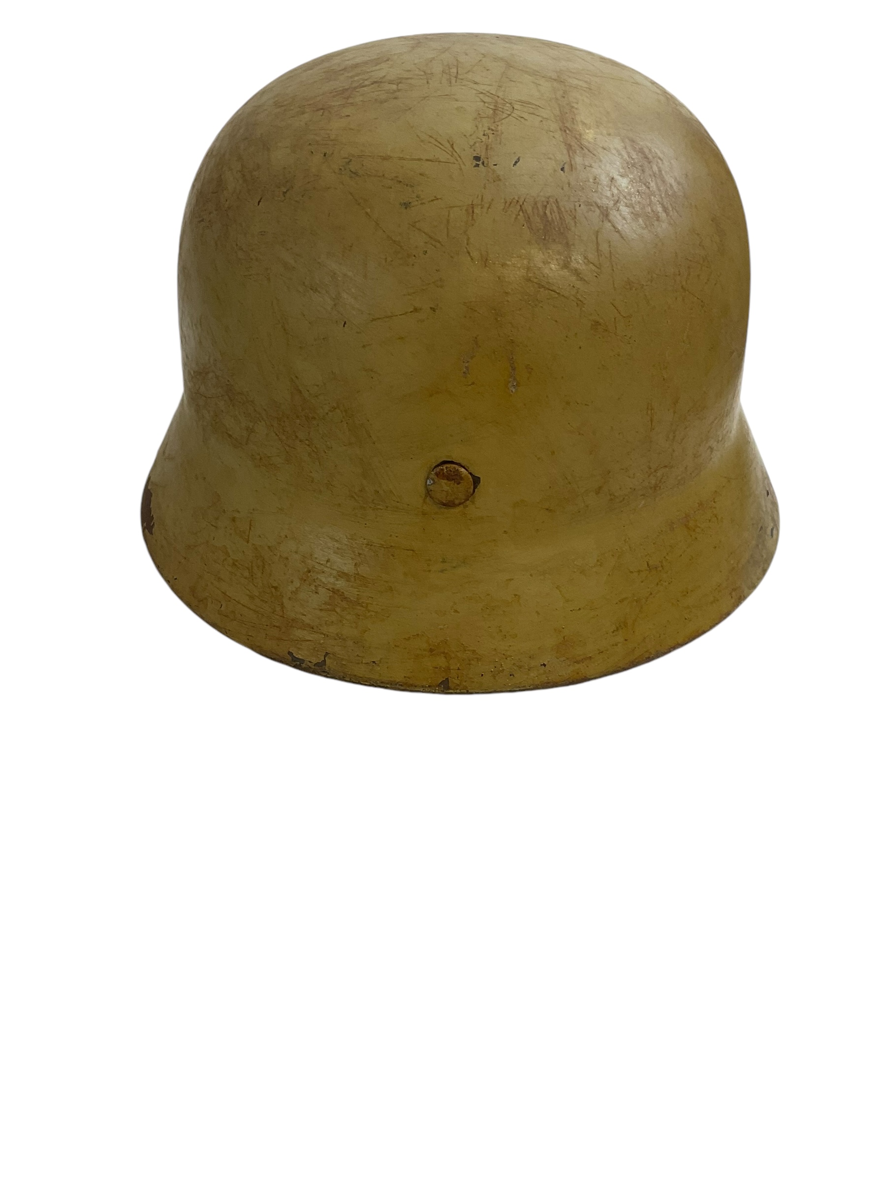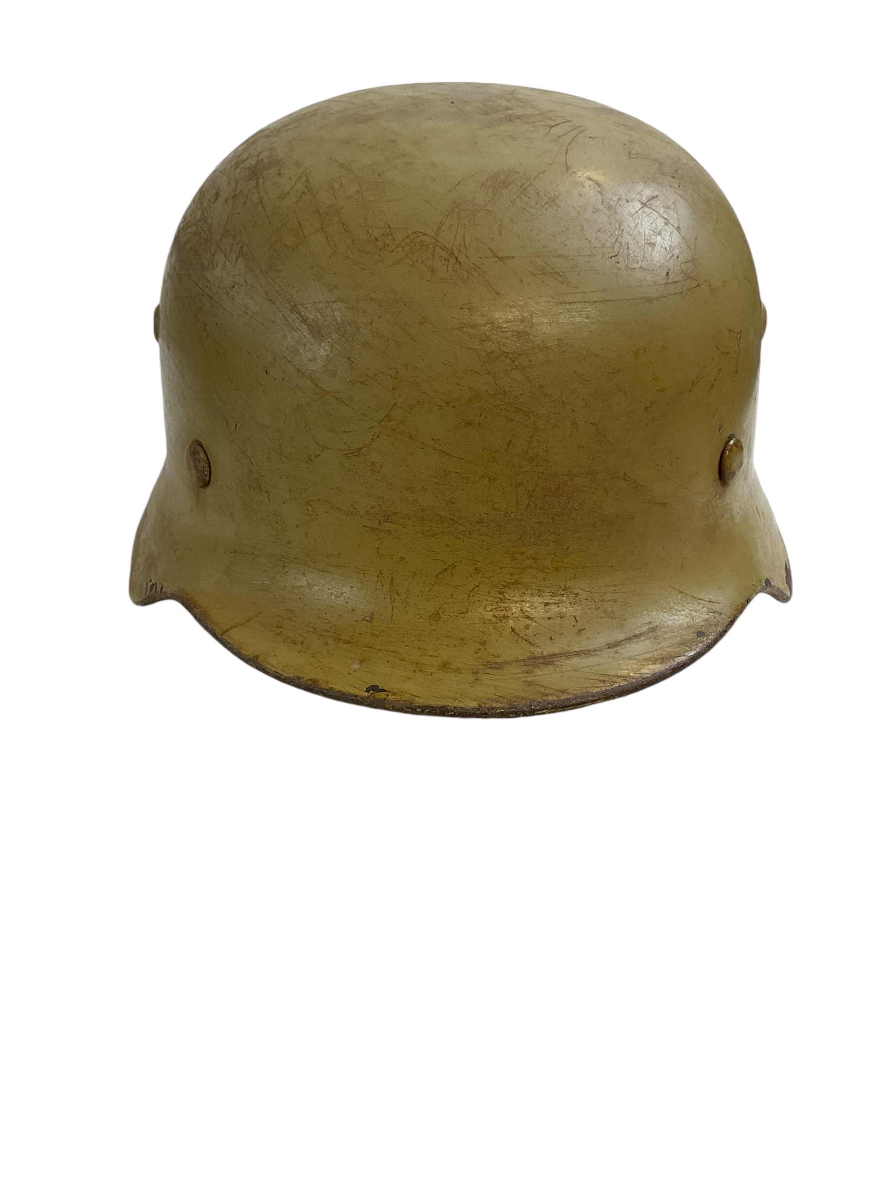 This is a restored original shell WWII German M35 Steel Helmet Q68. It is not an all original piece but an imitation, designed to resemble the authentic helmets used by German soldiers during the Second World War. The helmet is an original M35 steel shell and a DAK paint finish. It also carries the ‘Q68’ marking, indicating its size and Maker. Though this helmet is a fake, it has been restored to maintain a vintage look and feel. It serves as a fascinating piece of historical memorabilia and can be an excellent addition to any WWII collection or display. Please remember, this is not a genuine all original piece.