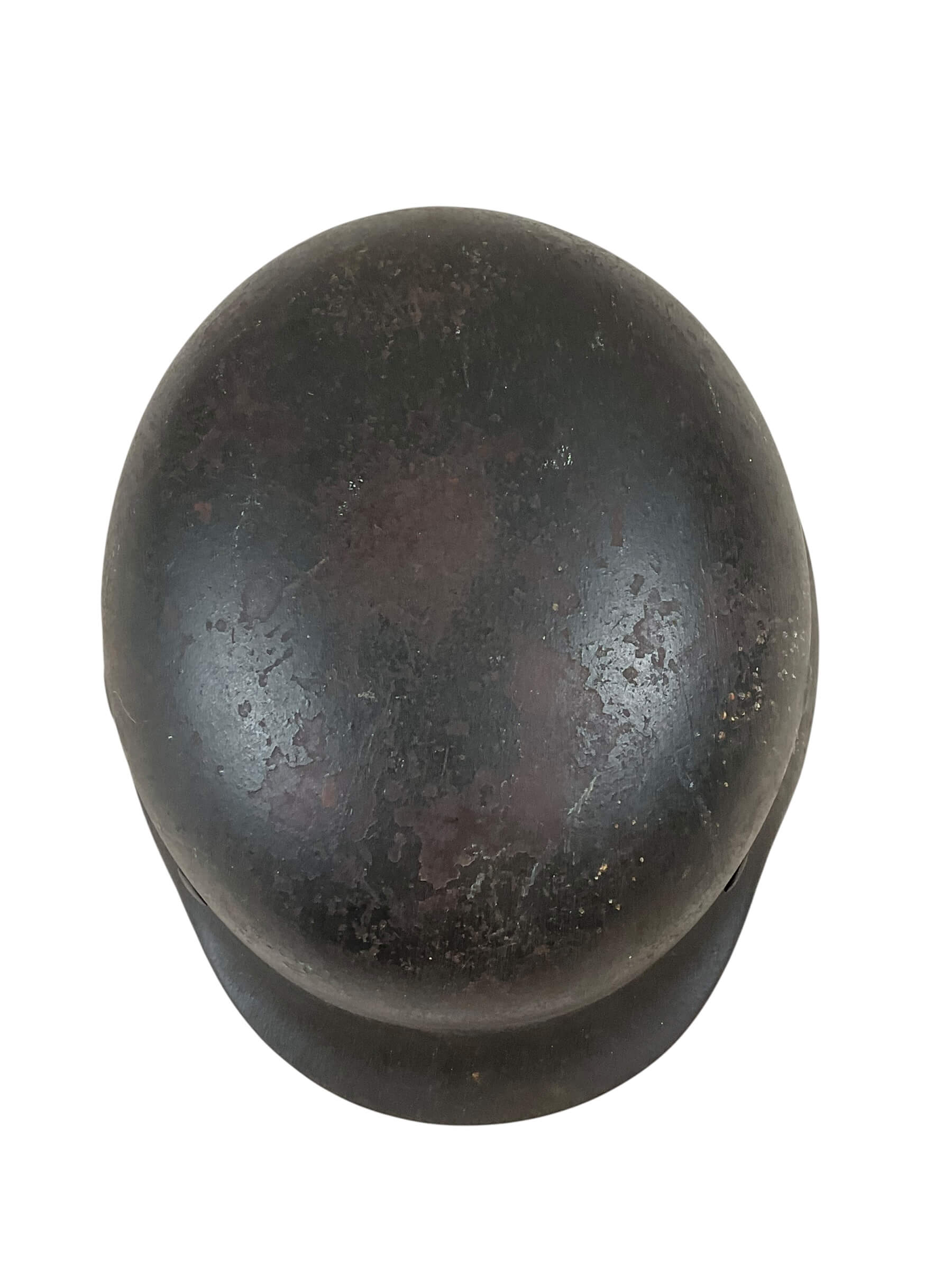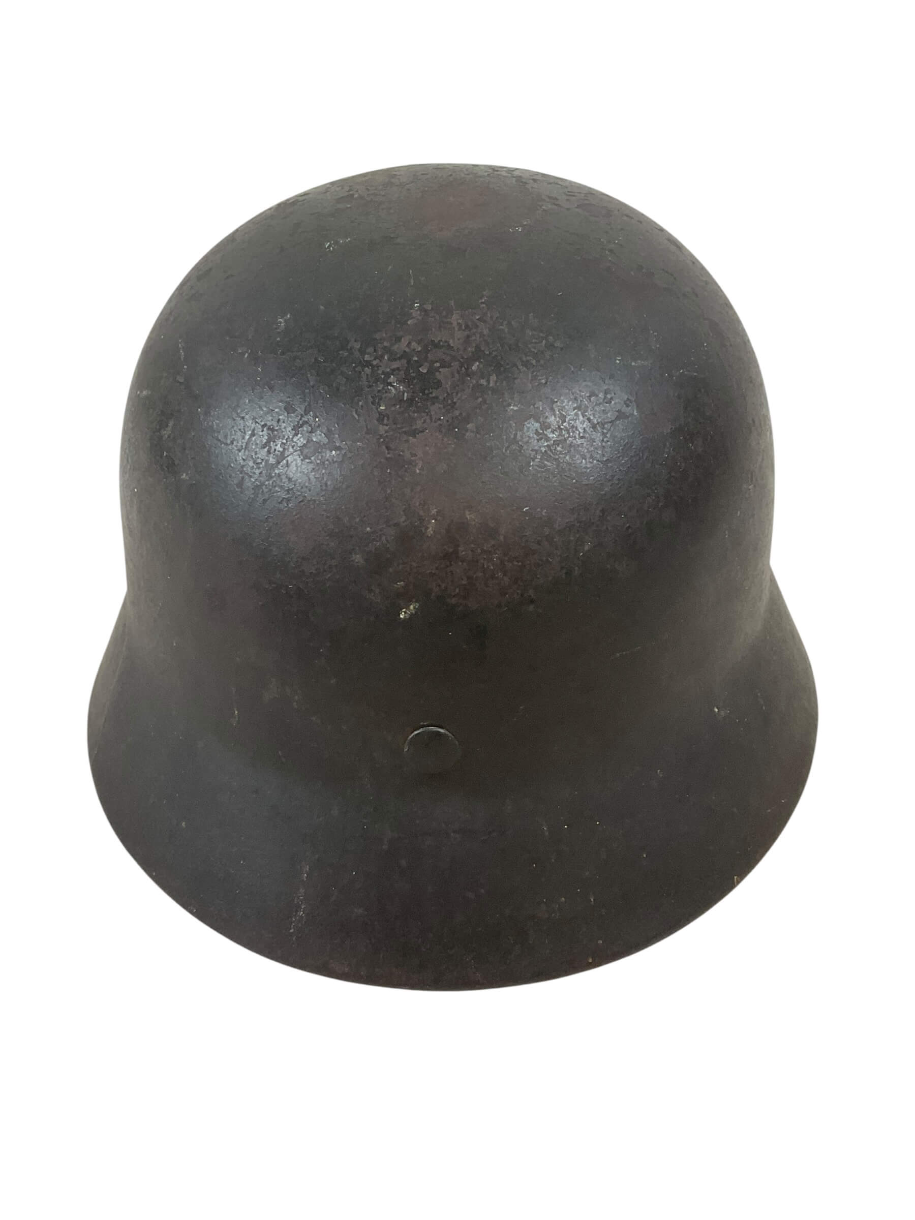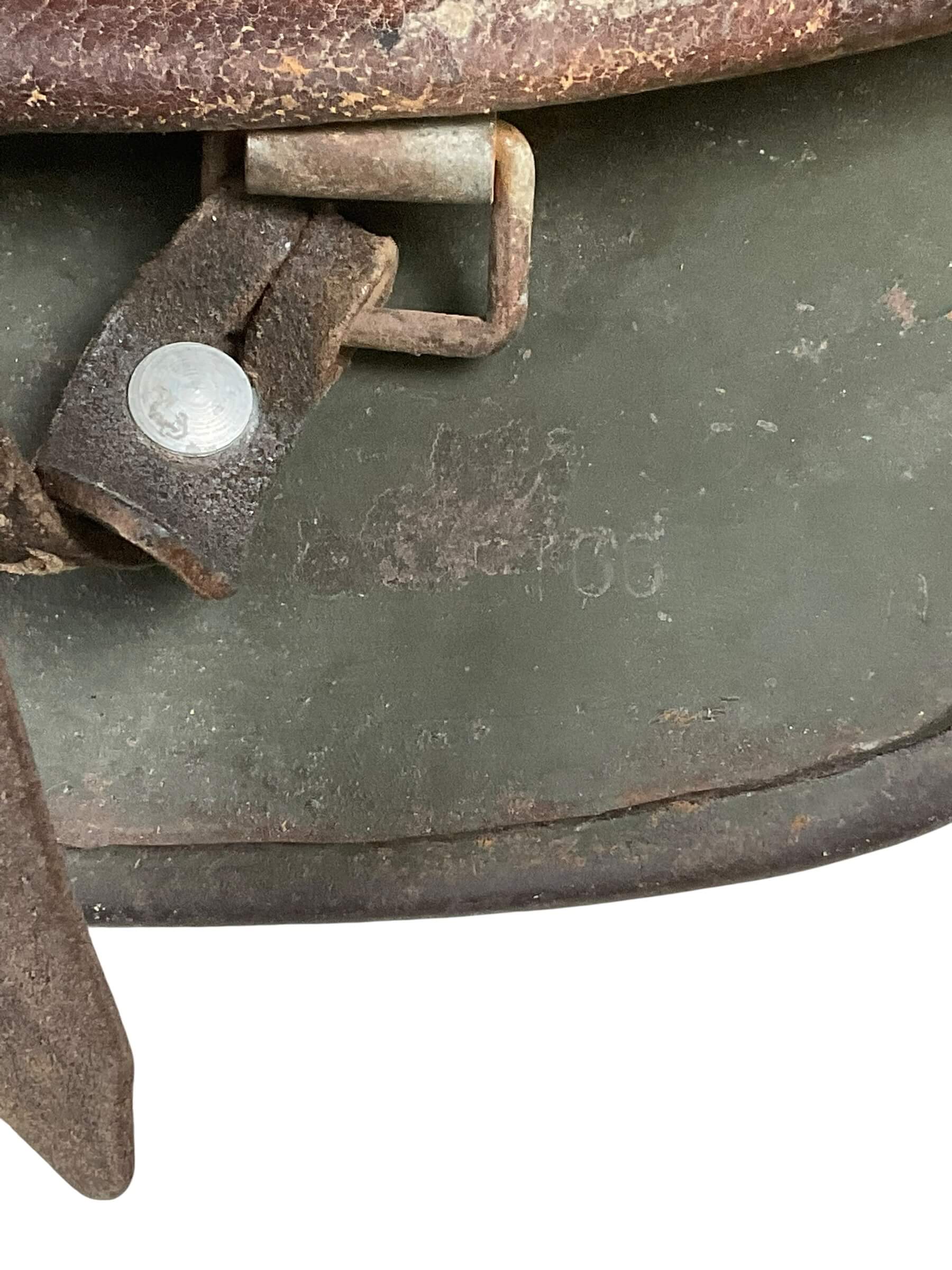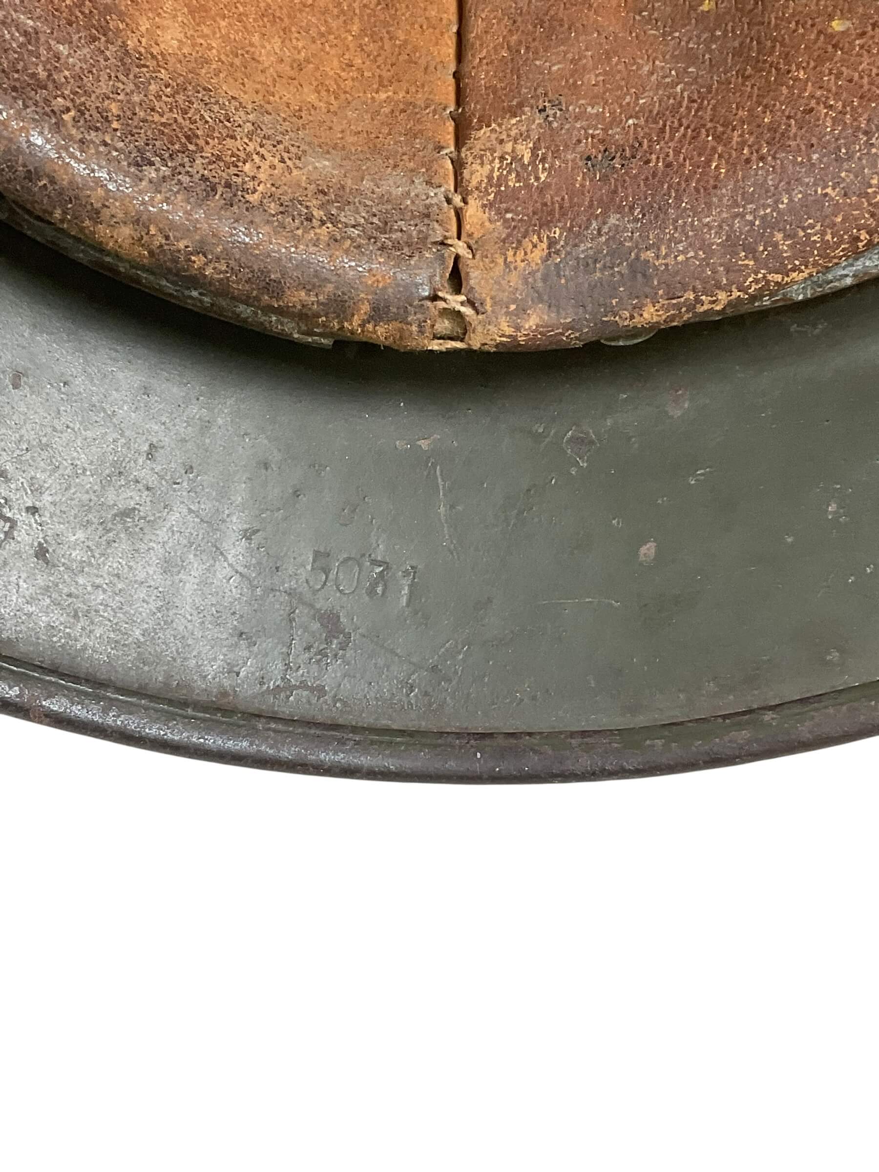 The WW2 German M40 Helmet, designated as ET-66 Lot No. 5031 with decal removed, is a military headgear produced during the Second World War for the German armed forces. The M40 variant introduced stamped air vents directly into the shell, a modification from earlier models that utilized separate fittings. The helmet is constructed from steel and is marked “ET-66,” indicating manufacture by Eisenhüttenwerke, Thale, with a shell size of 66 centimeters. The lot number 5031 corresponds to a specific production batch, facilitating historical research and identification. The decal removal suggests post-war denazification or field modification, as insignias were often removed for compliance or camouflage. This helmet style was widely issued across various branches of the Wehrmacht and maintained the classic German helmet profile that provided enhanced head and neck protection for soldiers. The remaining patina and manufacturing marks offer insight into both its period use and later handling.