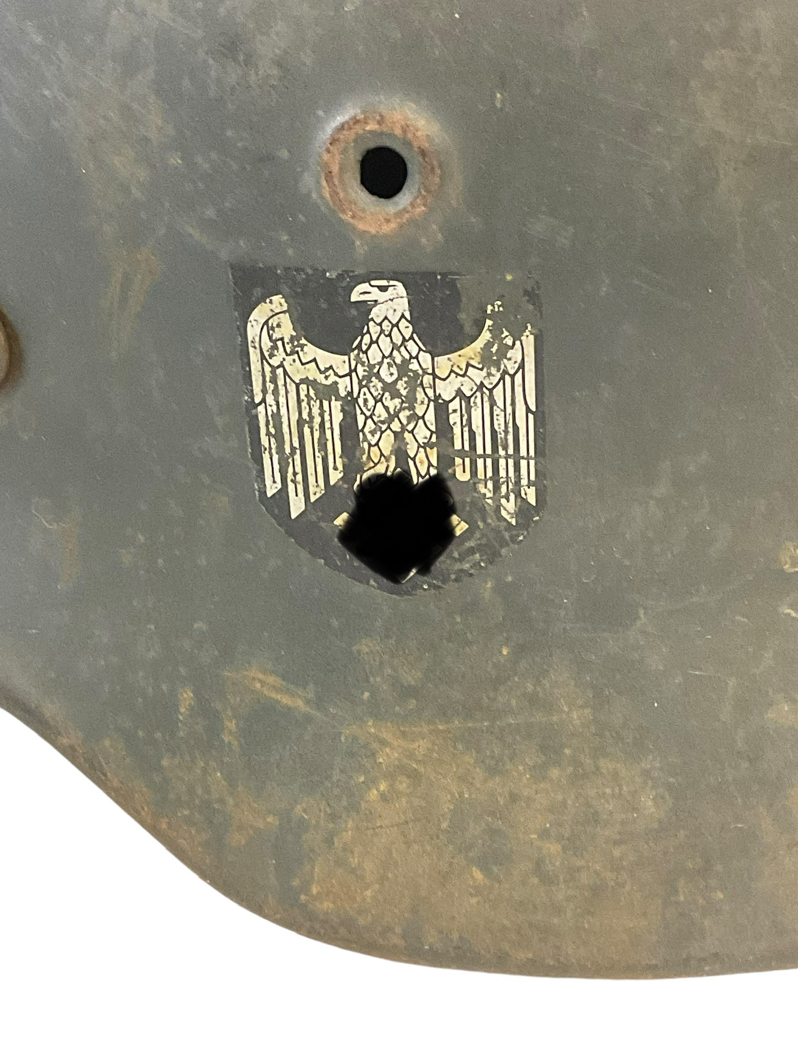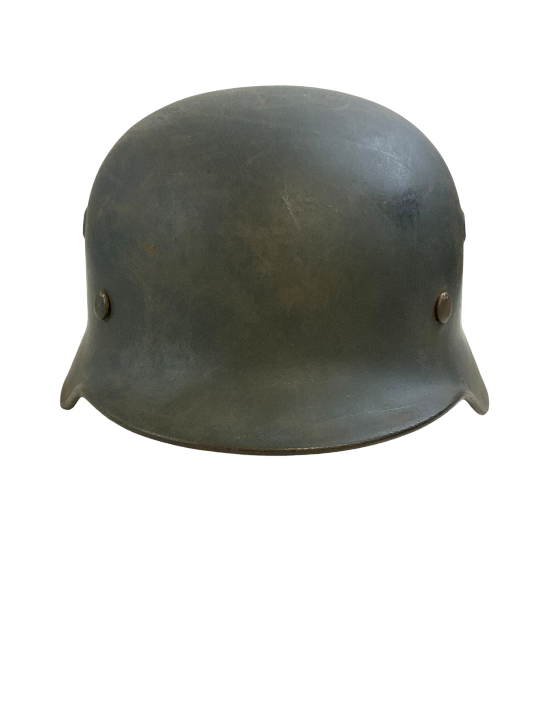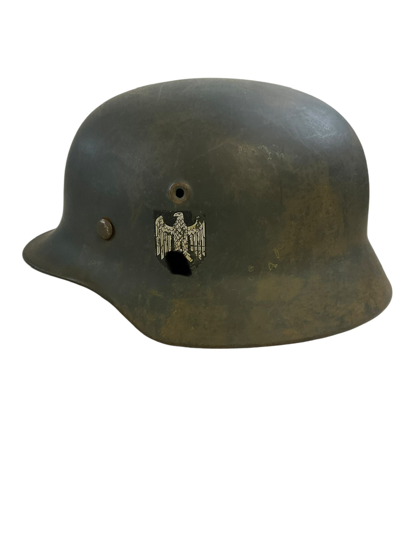 This is a restored original shell WWII German m40 Steel Helmet Q66. It is not an all original piece but an imitation, designed to resemble the authentic helmets used by German soldiers during the Second World War. The helmet is an original m40 steel shell with restored paint, Liner and decals. It also carries the ‘Q66’ marking, indicating its size and Maker. Though this helmet is a fake, it has been restored to maintain a vintage look and feel. It serves as a fascinating piece of historical memorabilia and can be an excellent addition to any WWII collection or display. Please remember, this is not a genuine all original piece.