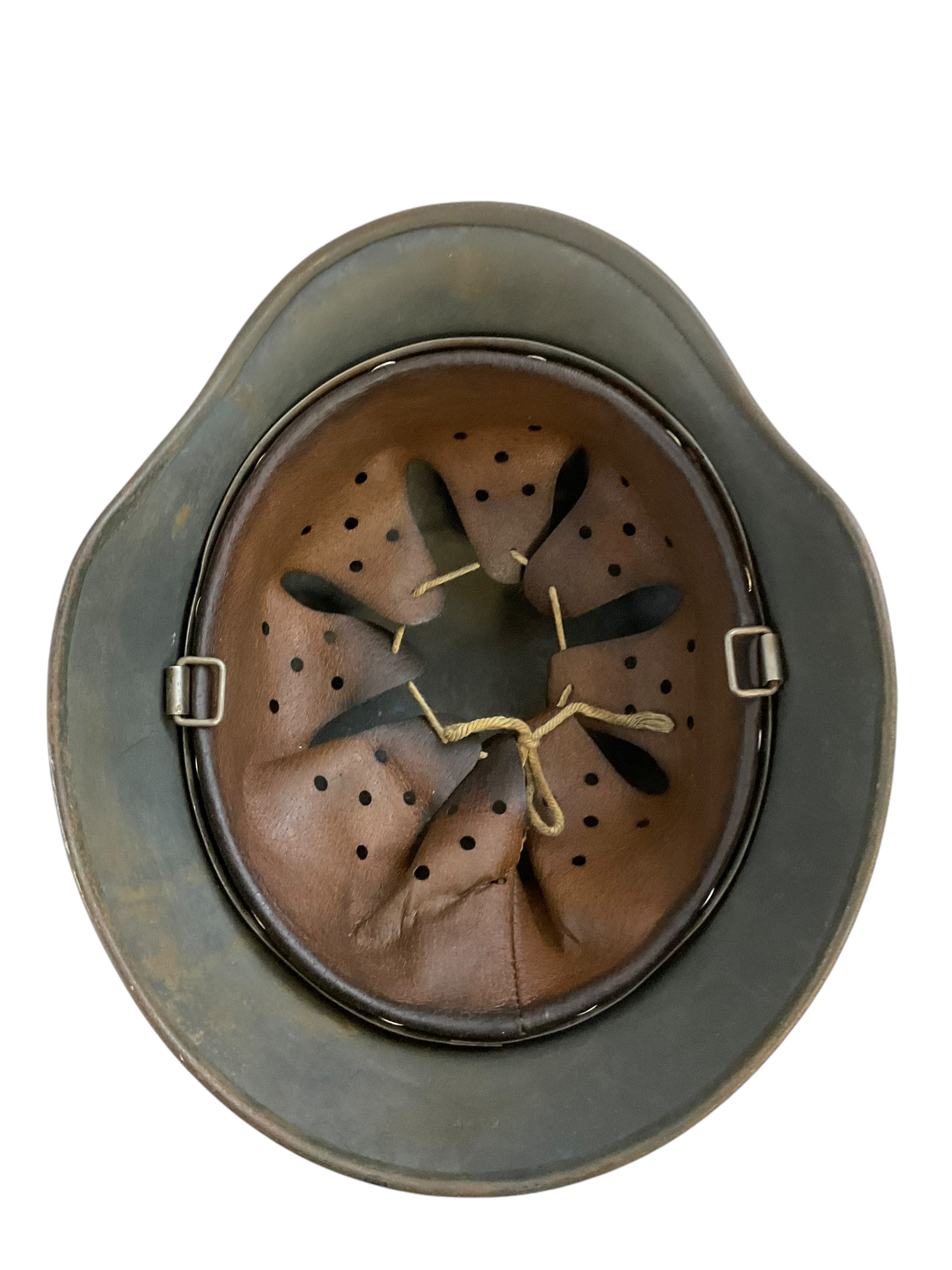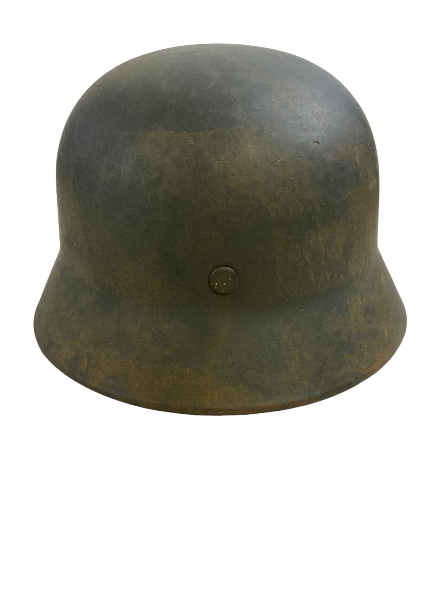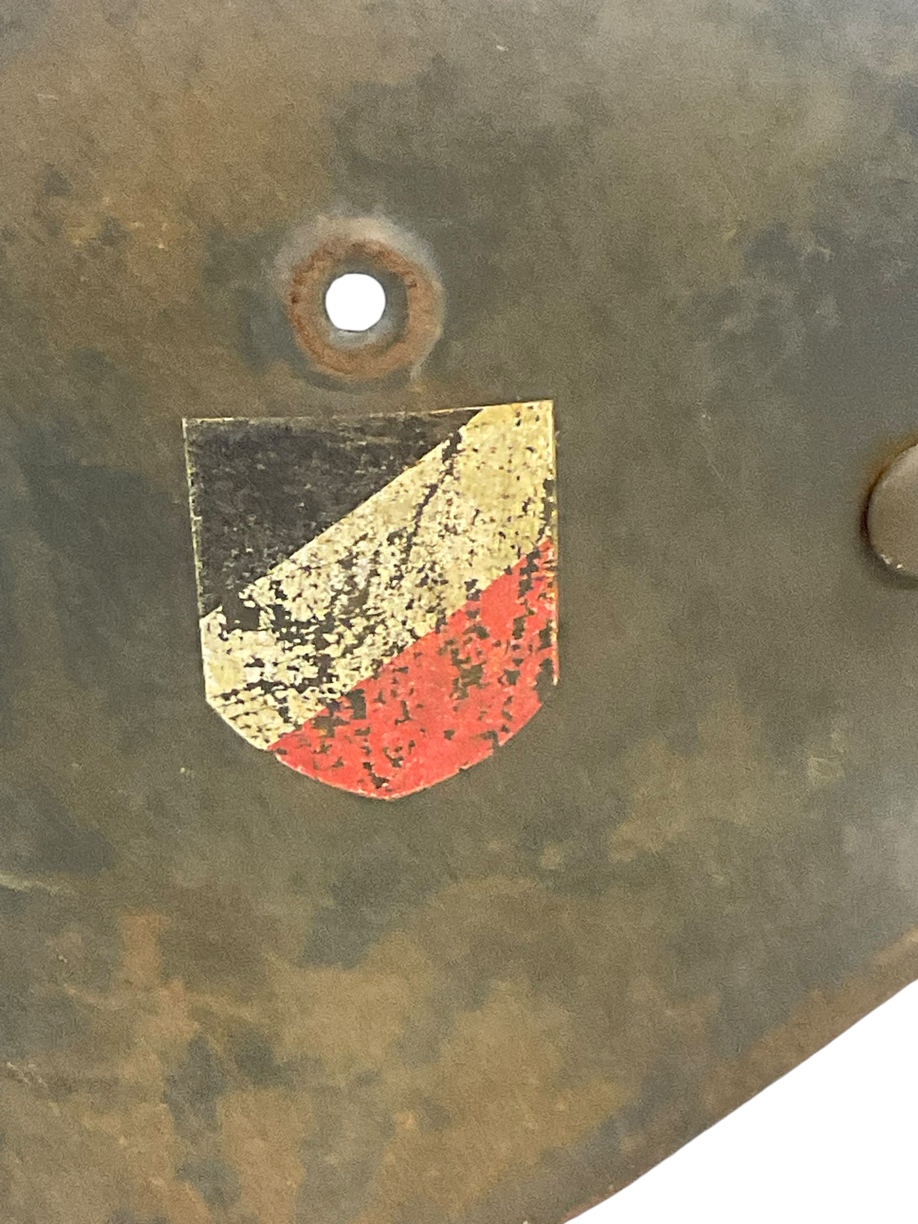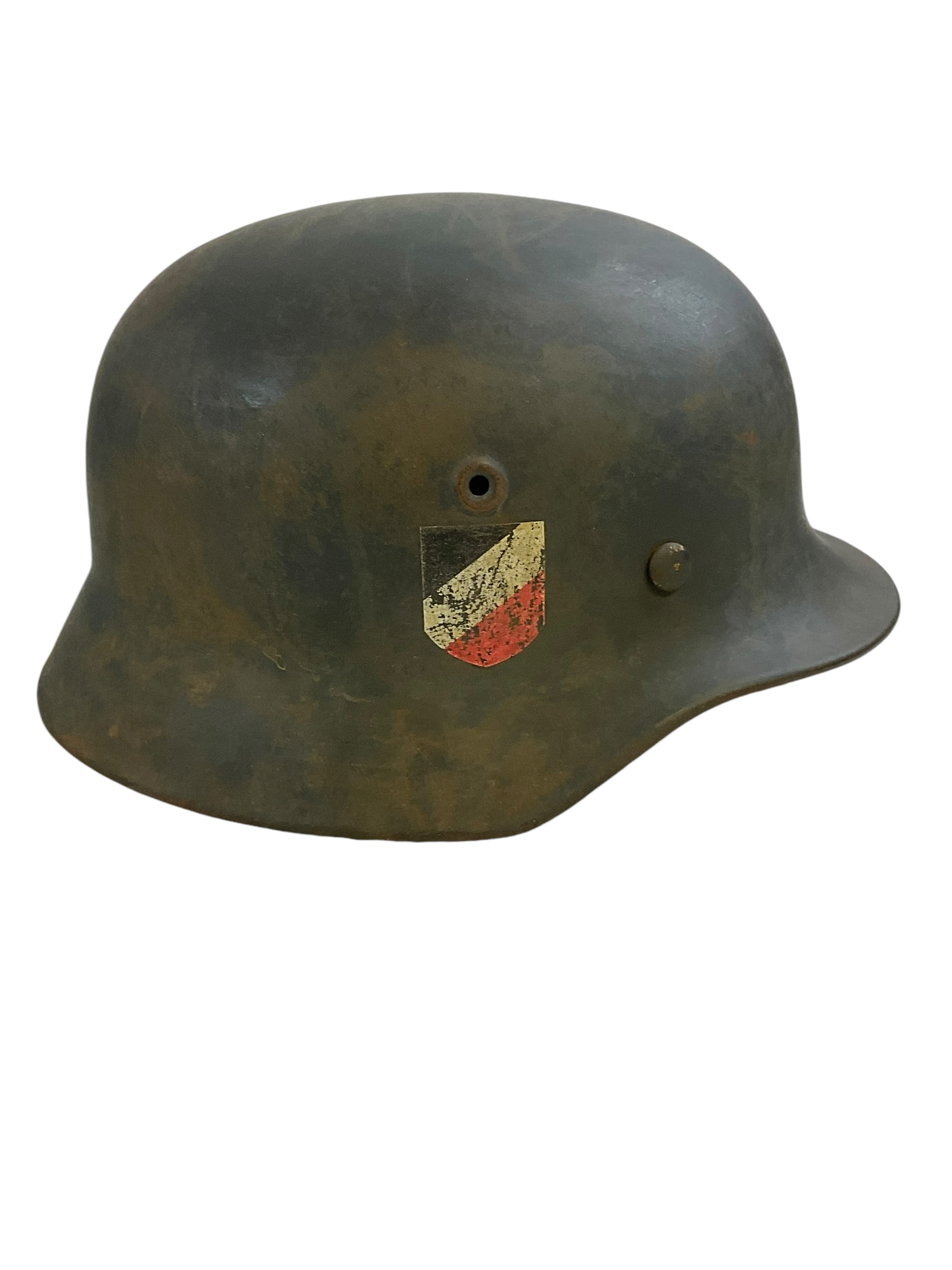 This is a restored original shell WWII German m40 Steel Helmet Q66. It is not an all original piece but an imitation, designed to resemble the authentic helmets used by German soldiers during the Second World War. The helmet is an original m40 steel shell with restored paint, Liner and decals. It also carries the ‘Q66’ marking, indicating its size and Maker. Though this helmet is a fake, it has been restored to maintain a vintage look and feel. It serves as a fascinating piece of historical memorabilia and can be an excellent addition to any WWII collection or display. Please remember, this is not a genuine all original piece.