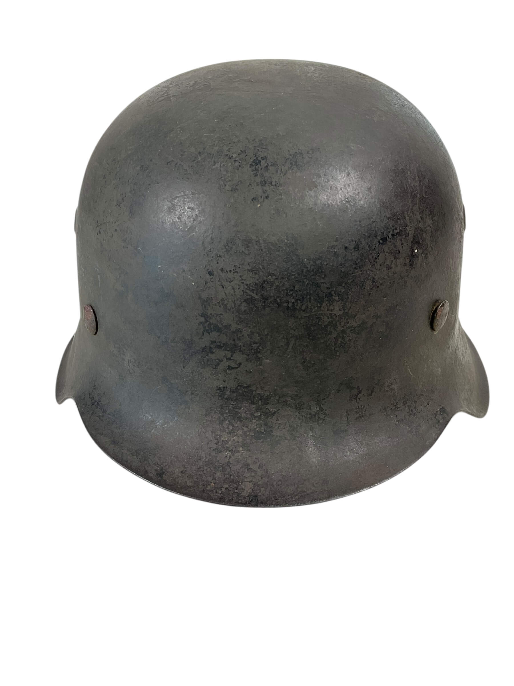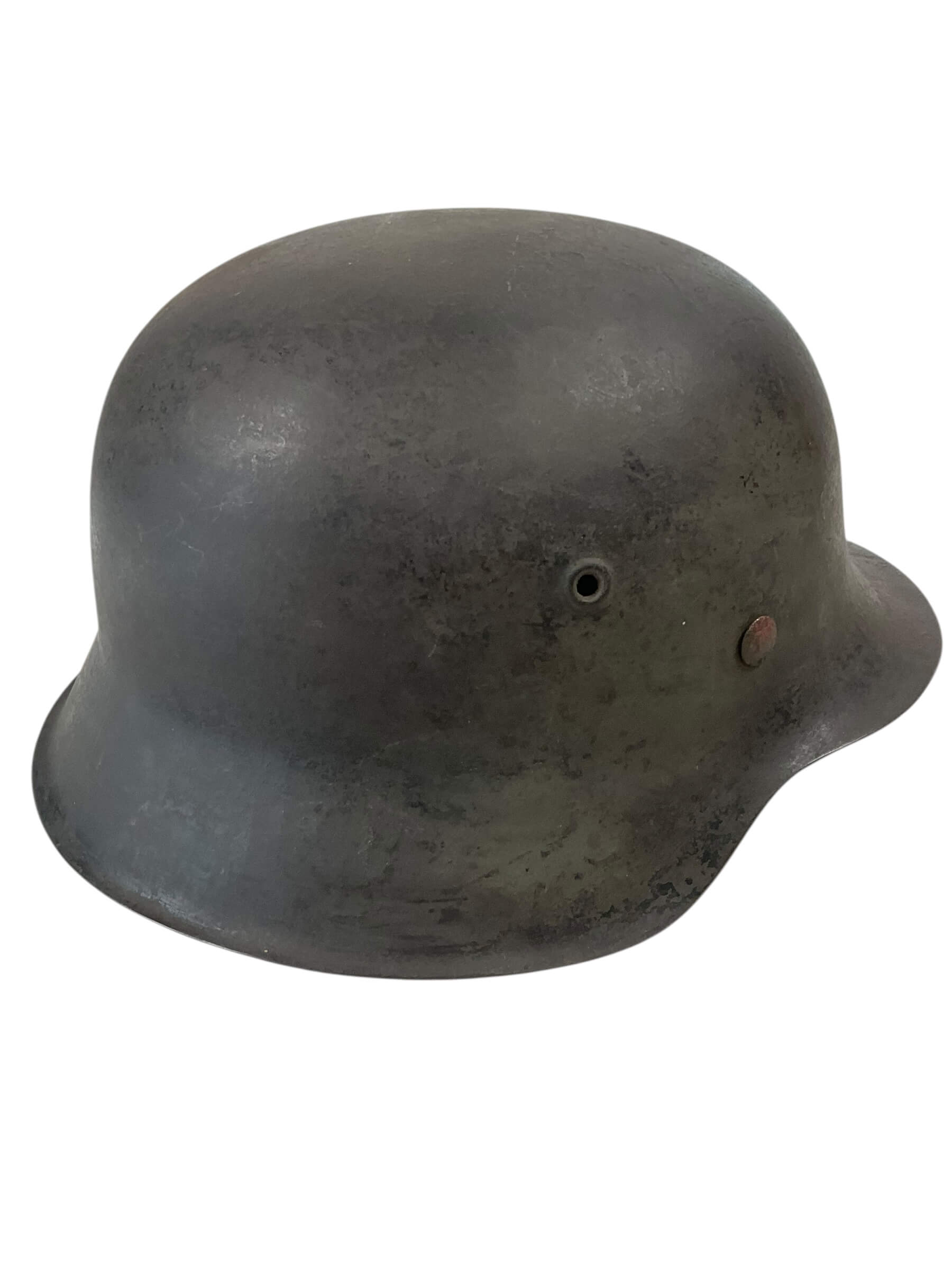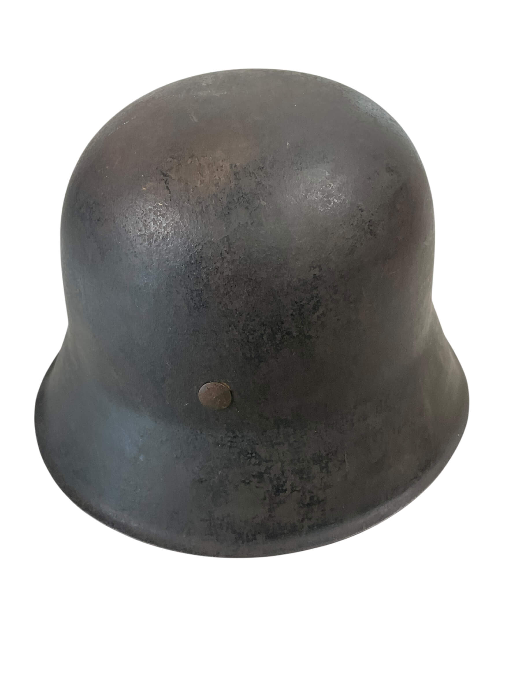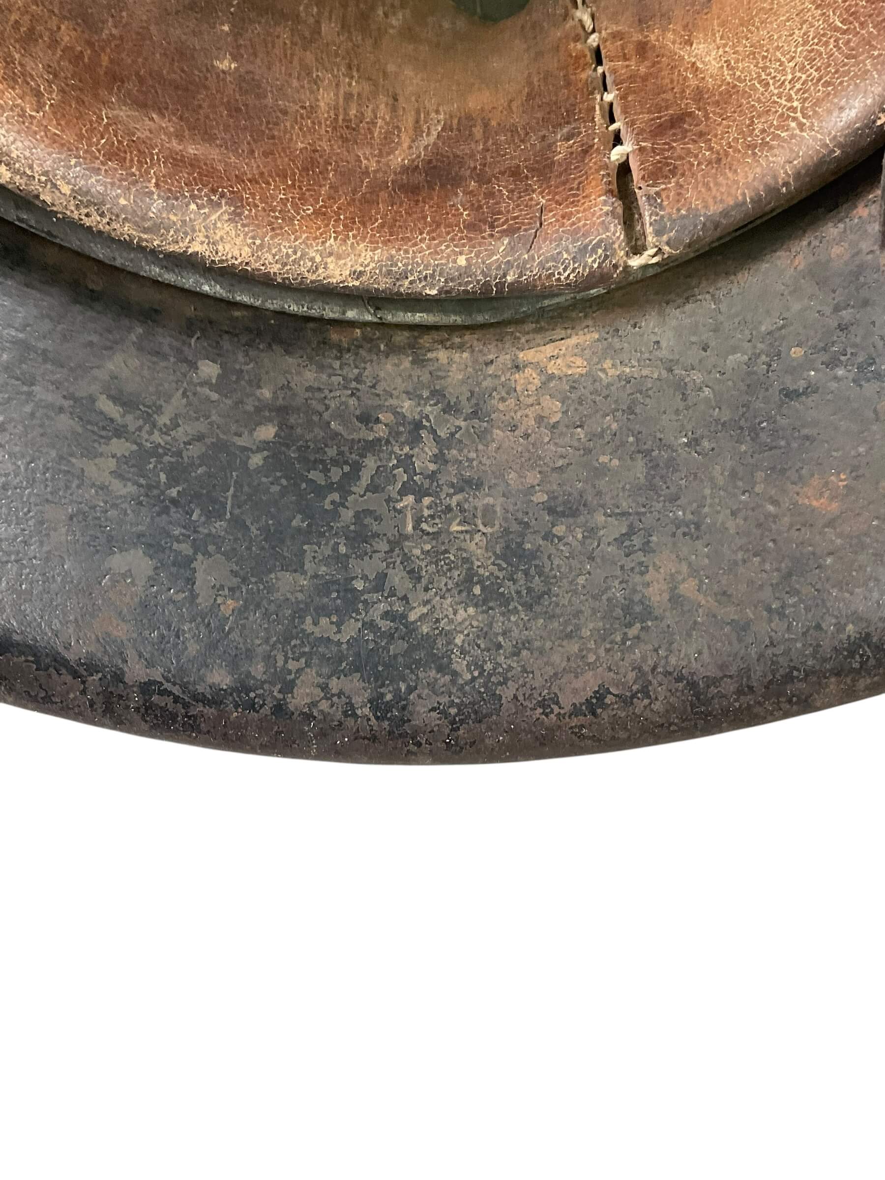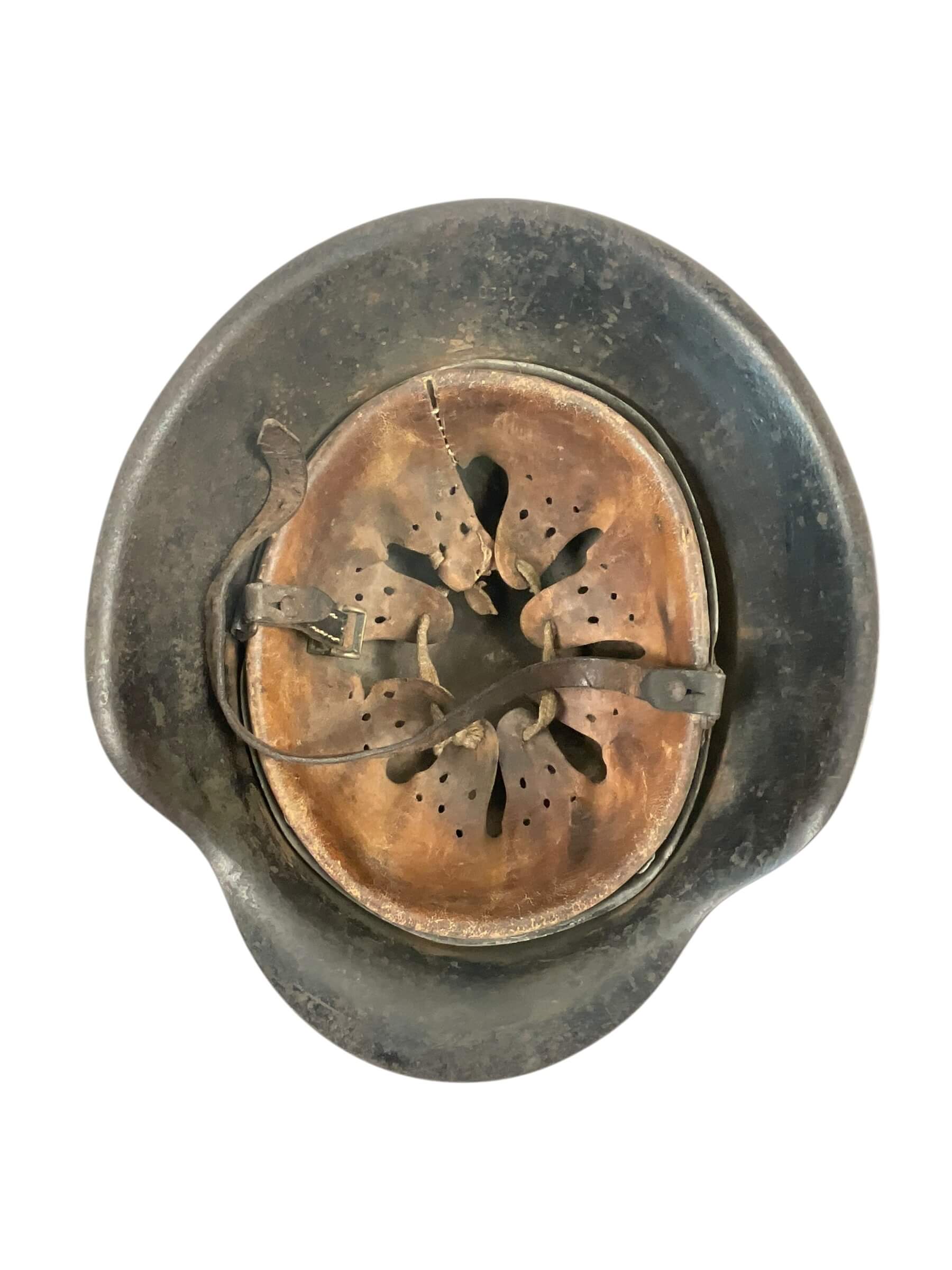 The WW2 German M42 Single Decal Kriegsmarine Steel Helmet ET64 Lot No 1520 is an original combat helmet issued to personnel of the Kriegsmarine, the naval branch of the German armed forces during the Second World War. The M42 model, introduced in 1942, features a raw edge shell and simplified manufacturing compared to earlier models. This example is marked “ET64,” indicating production by Eisenhüttenwerk Thale and a shell size of 64 cm. The lot number “1520” is stamped into the skirt for production tracking. The helmet bears a single Kriegsmarine decal, denoting naval usage, typically located on the left side. Its construction includes a steel shell, and when present, an M31 leather liner system designed for enhanced wearer comfort and protection. These helmets were standard issue for Kriegsmarine forces and are characterized by their practical design modifications, reflecting the constraints and demands of wartime production from 1942 onwards.