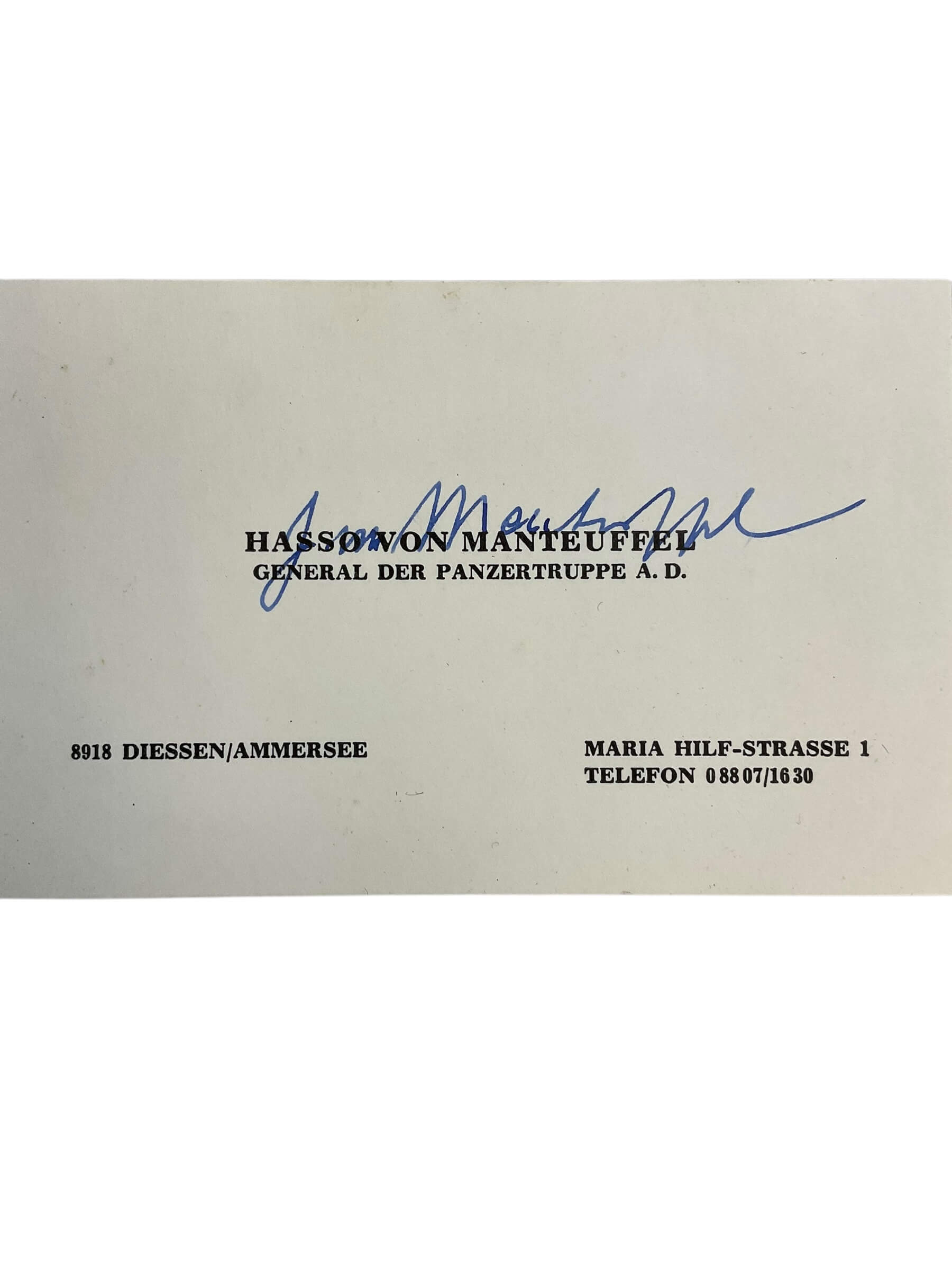 This is a unique, historical collector’s item set that includes a WWII-era photo of German General Hasso von Manteuffel along with his signed card. Manteuffel was a decorated officer in the German Army who played a pivotal role in several key battles during the war. The black and white photo captures the stern visage of the general in his military uniform, exuding a sense of power and authority. Accompanying the photo is a card, personally signed by Manteuffel, adding to the authenticity and historical value of the set. This rare collection is a must-have for history enthusiasts, particularly those interested in World War II memorabilia. It offers a glimpse into the life of one of Germany’s most significant military figures, providing a tangible link to a pivotal period in world history.