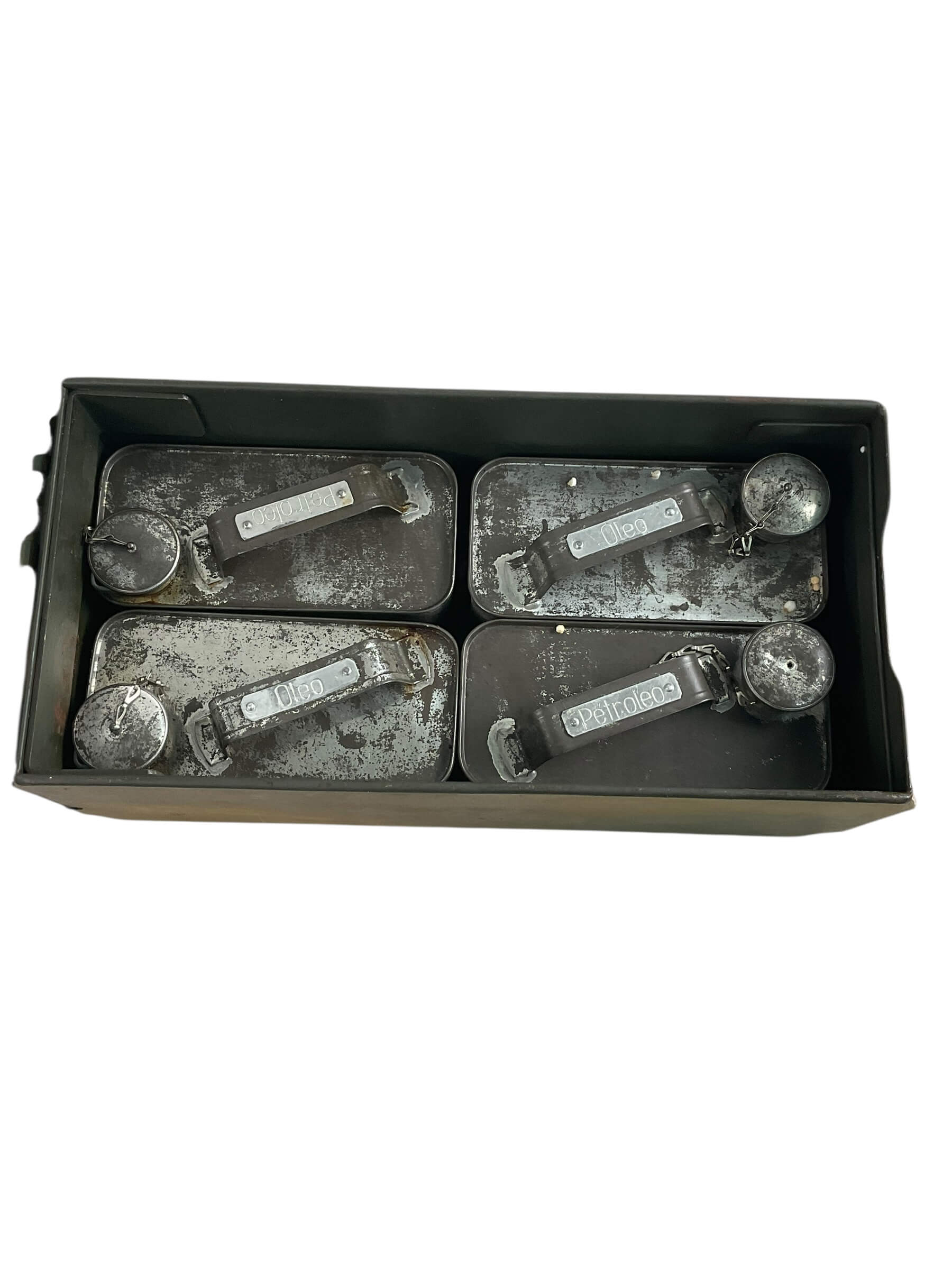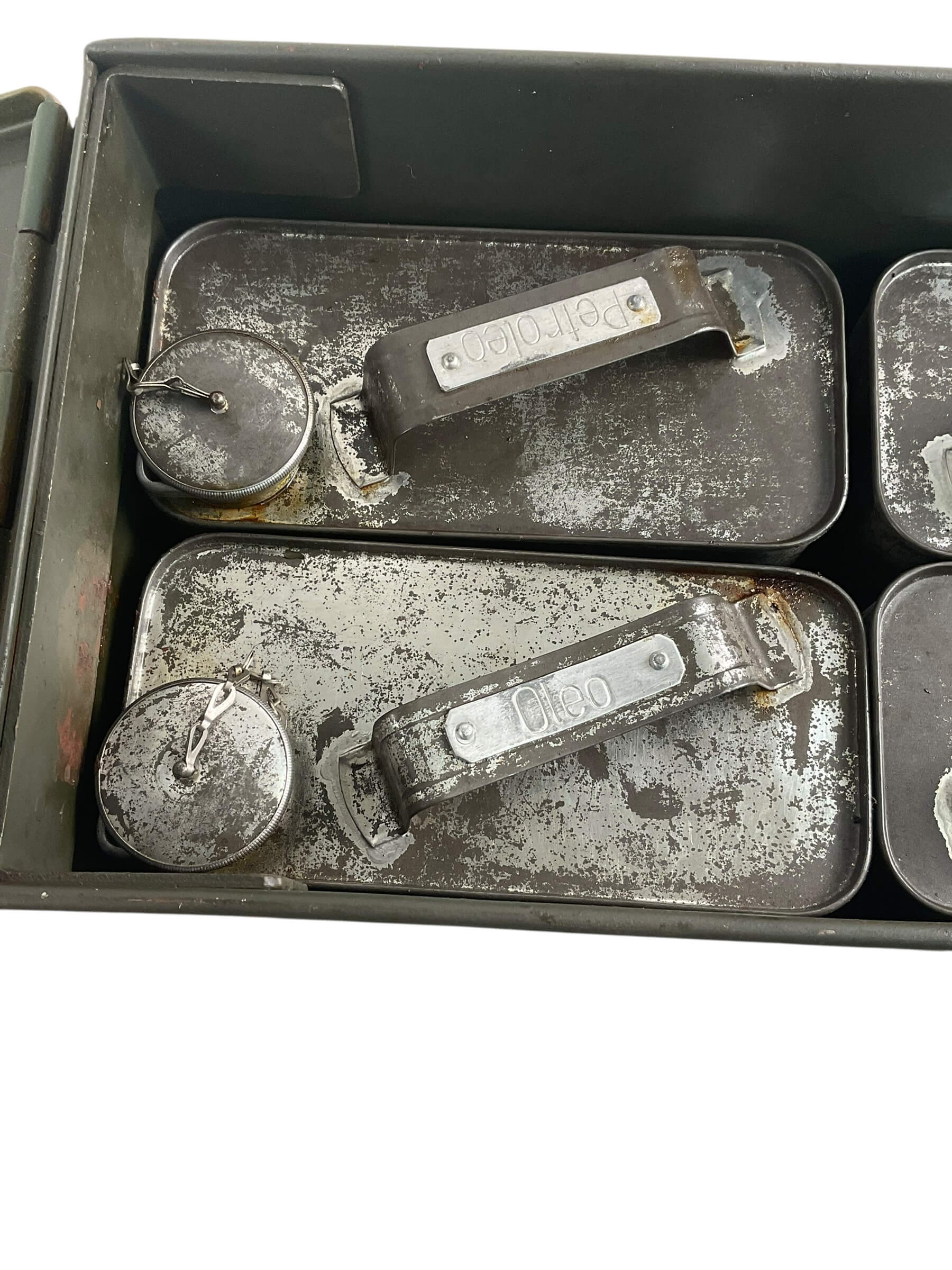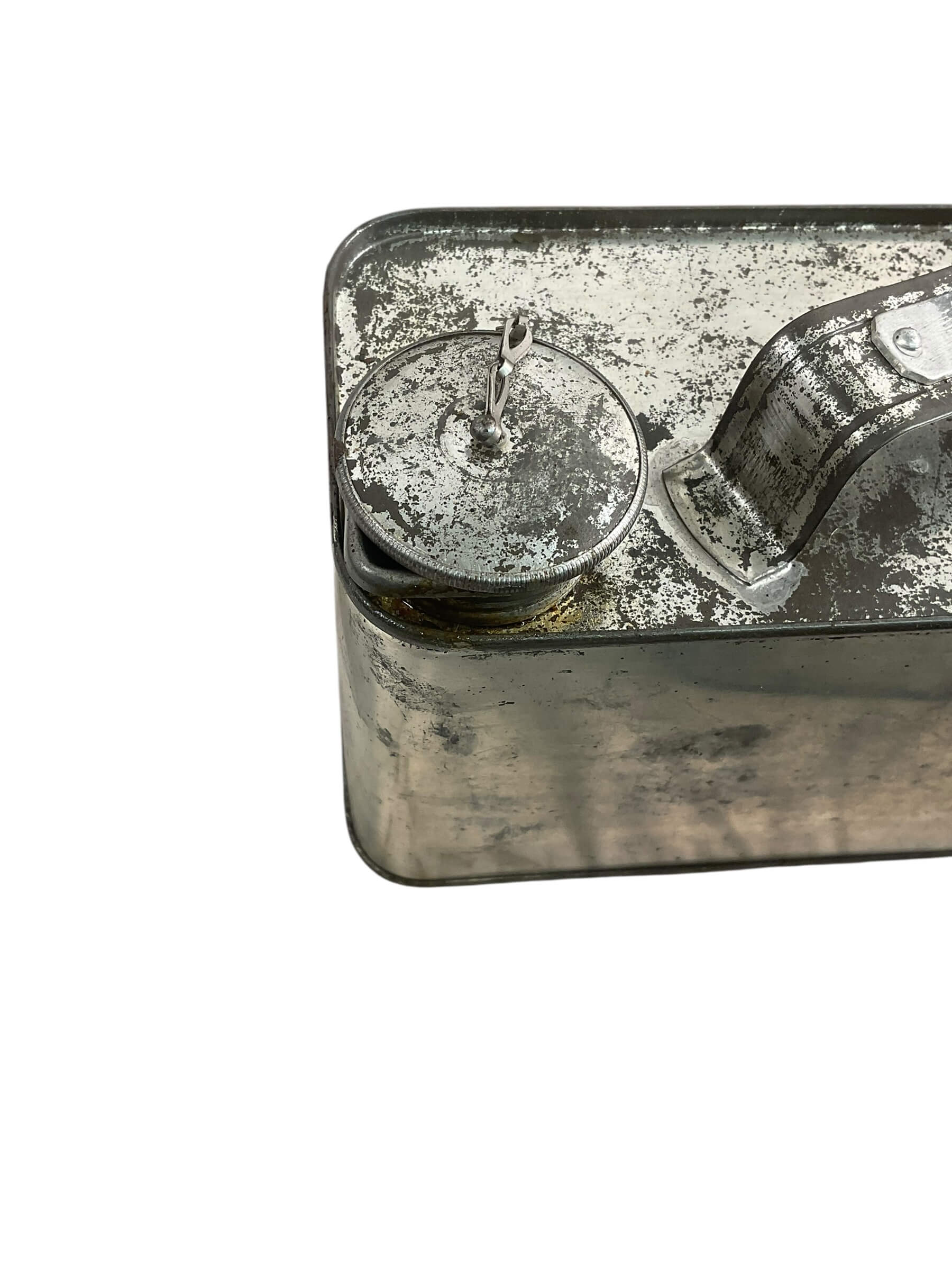 The WW2 German MG13 Camouflage Tin with Spanish Oilers is a historical artifact measuring 15″ x 7″ x 7″. Originally used during the Second World War, it is a German-made military storage box, distinct for its camouflage painting. It includes Spanish oilers, which were vital for machine gun maintenance.