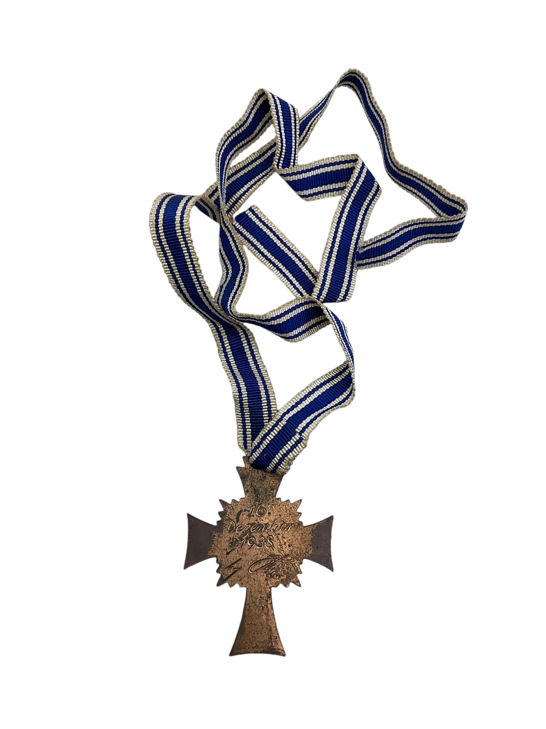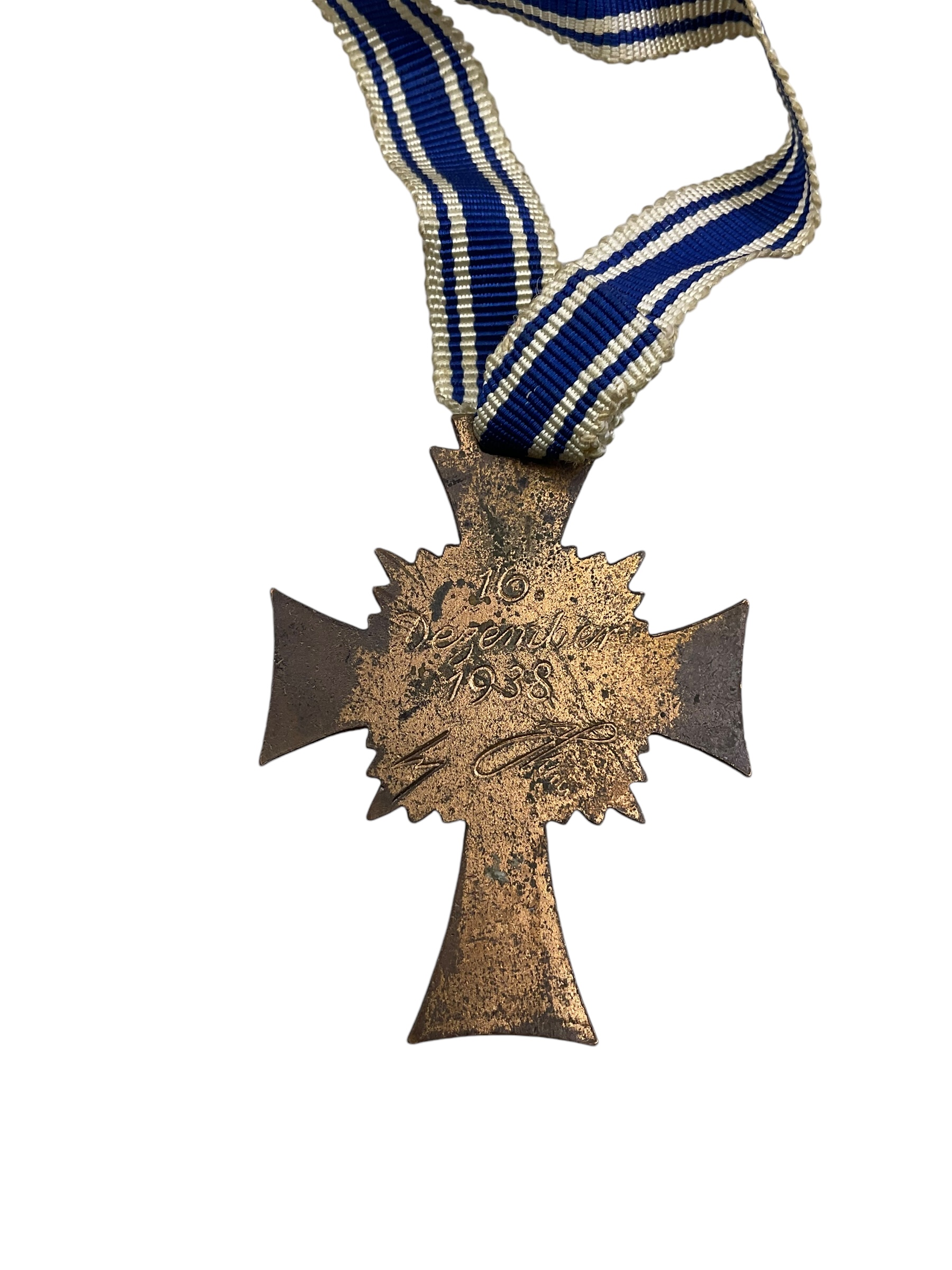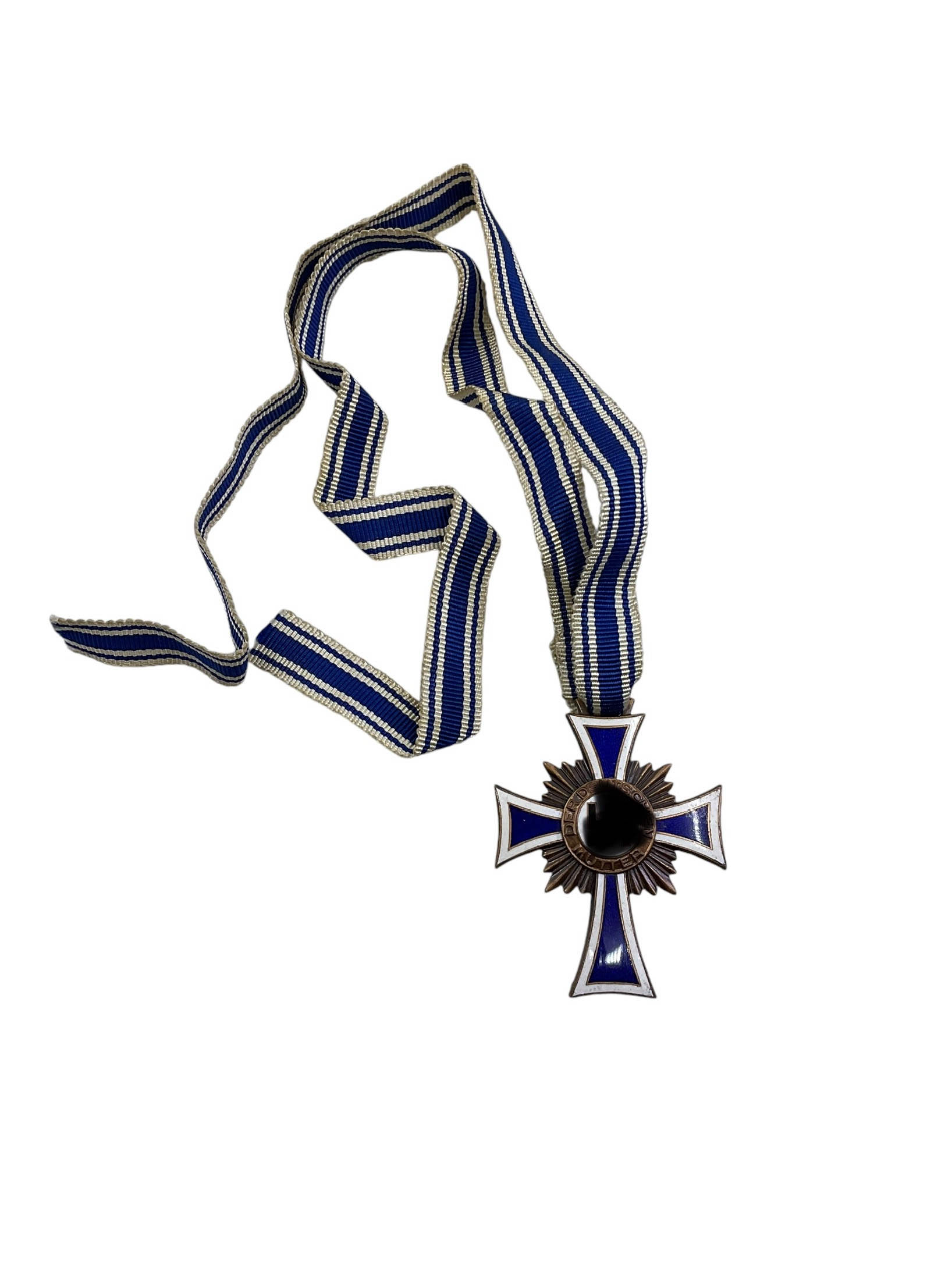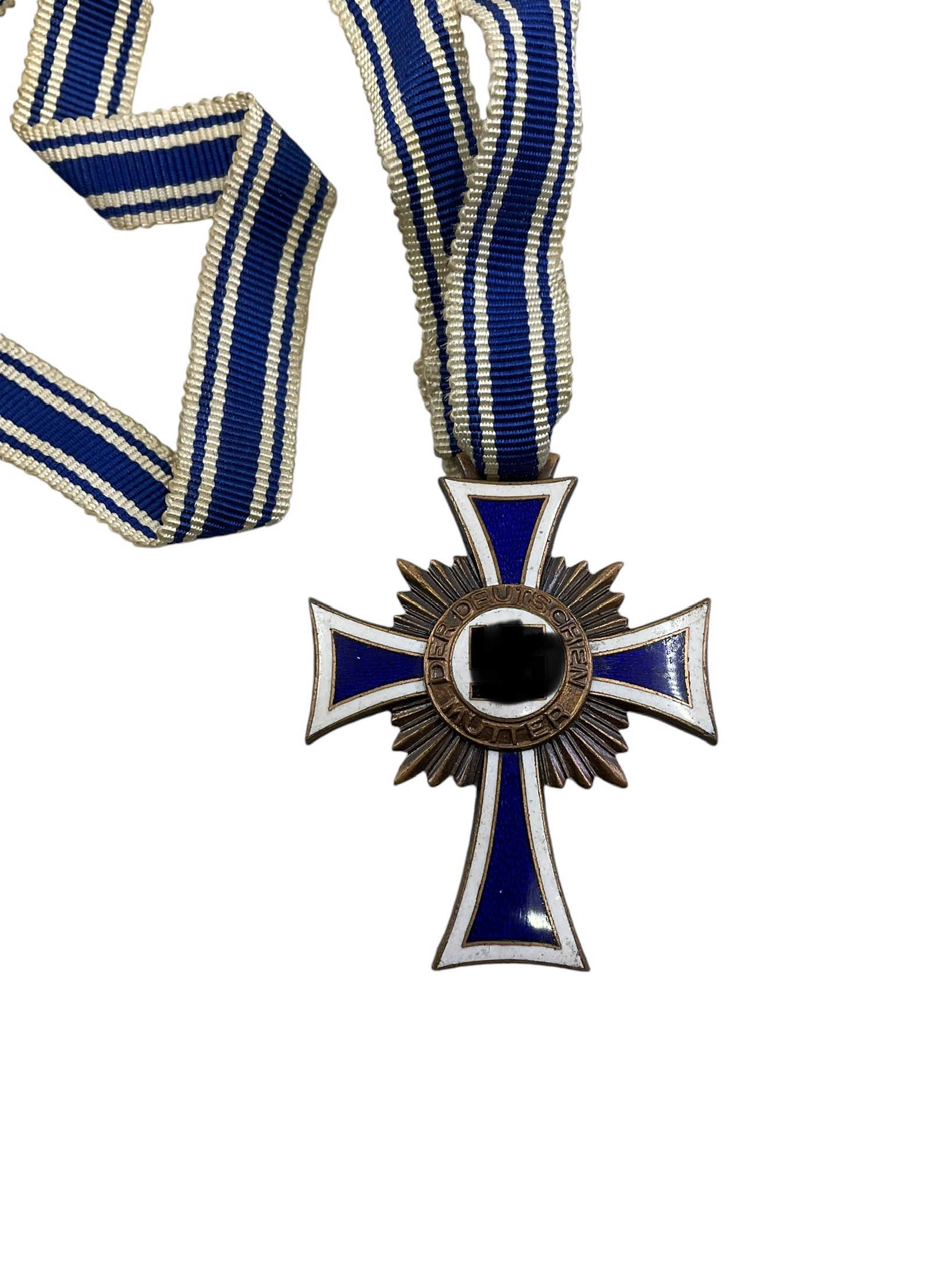 The WW2 German Mothers Cross in Bronze with Ribbon is a remarkable piece of historical memorabilia. This prestigious award was bestowed upon German women during the World War II era for their commitment to the Third Reich’s ideals of motherhood. Cast in solid bronze, it showcases intricate detailing and superior craftsmanship, reflecting the era’s artistic sensibility. The medal features a Christian cross surrounded by a laurel wreath, with a swastika symbol at the centre. It is suspended from a blue and white striped ribbon, adding to its aesthetic appeal. The reverse side often bears the inscription ‘Der Deutschen Mutter’ (The German Mother). This item serves as a poignant reminder of the role women played in society during one of history’s most tumultuous periods.
