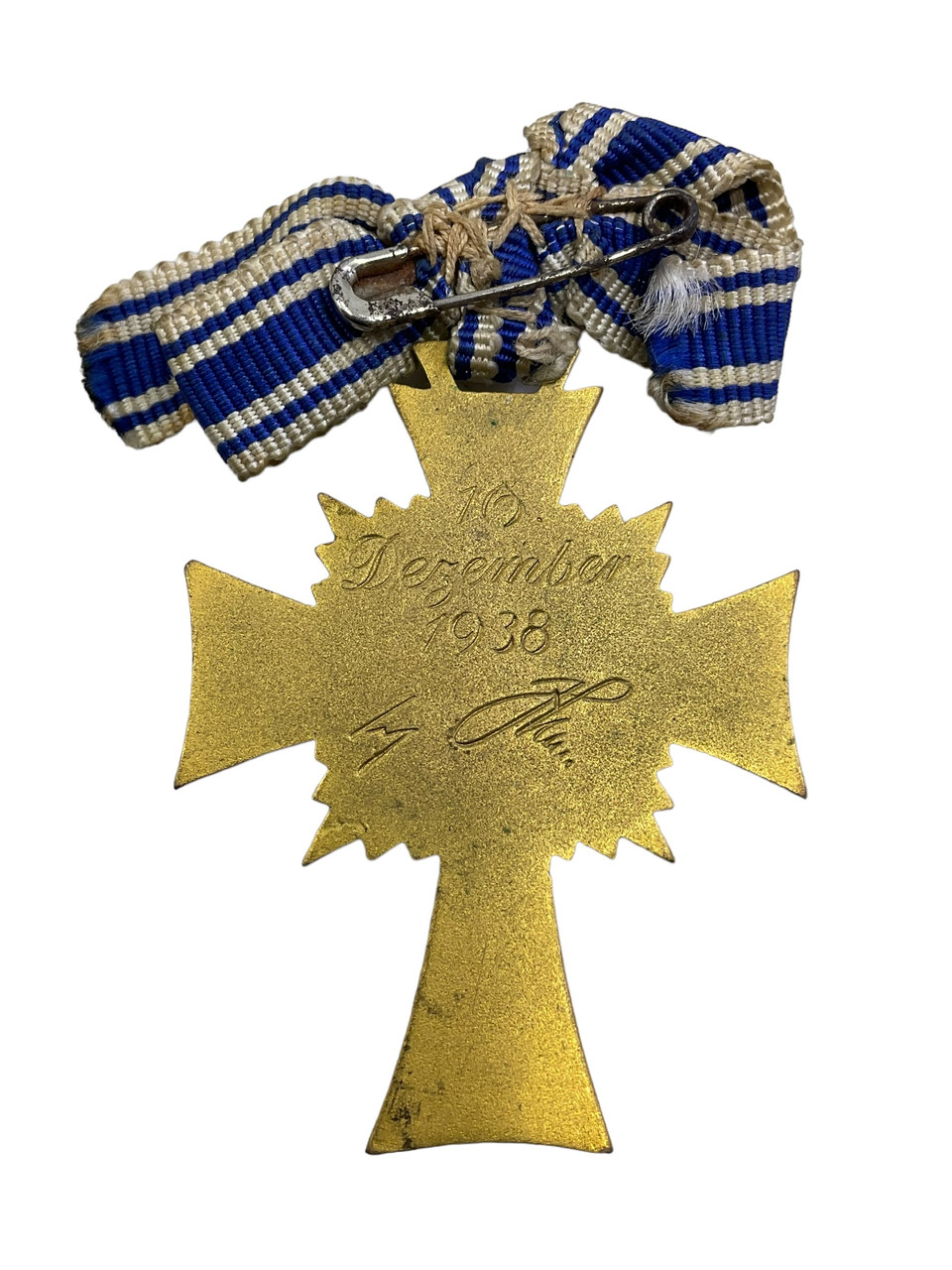The WW2 German Mothers Cross in Gold with Ribbon is a prestigious award instituted by Adolf Hitler on December 16, 1938, to honor German mothers for exceptional merit to the German nation. This esteemed decoration features a cross with a swastika emblem at its center, symbolizing the Aryan ideals upheld during that era. The gold class of the Mother’s Cross, adorned with a blue enamel background and white borders, was awarded to mothers of eight or more children, showcasing their extraordinary contribution to the growth of the Aryan race as envisioned by the Third Reich. The medal is suspended from a blue and white striped ribbon, reflecting the national colors. As a piece of WW2 memorabilia, it serves as a poignant reminder of the period’s social policies and the emphasis placed on motherhood within Nazi Germany’s ideological framework. Collectors and historians regard it as a significant artifact, reflecting the complex historical narrative of the time.