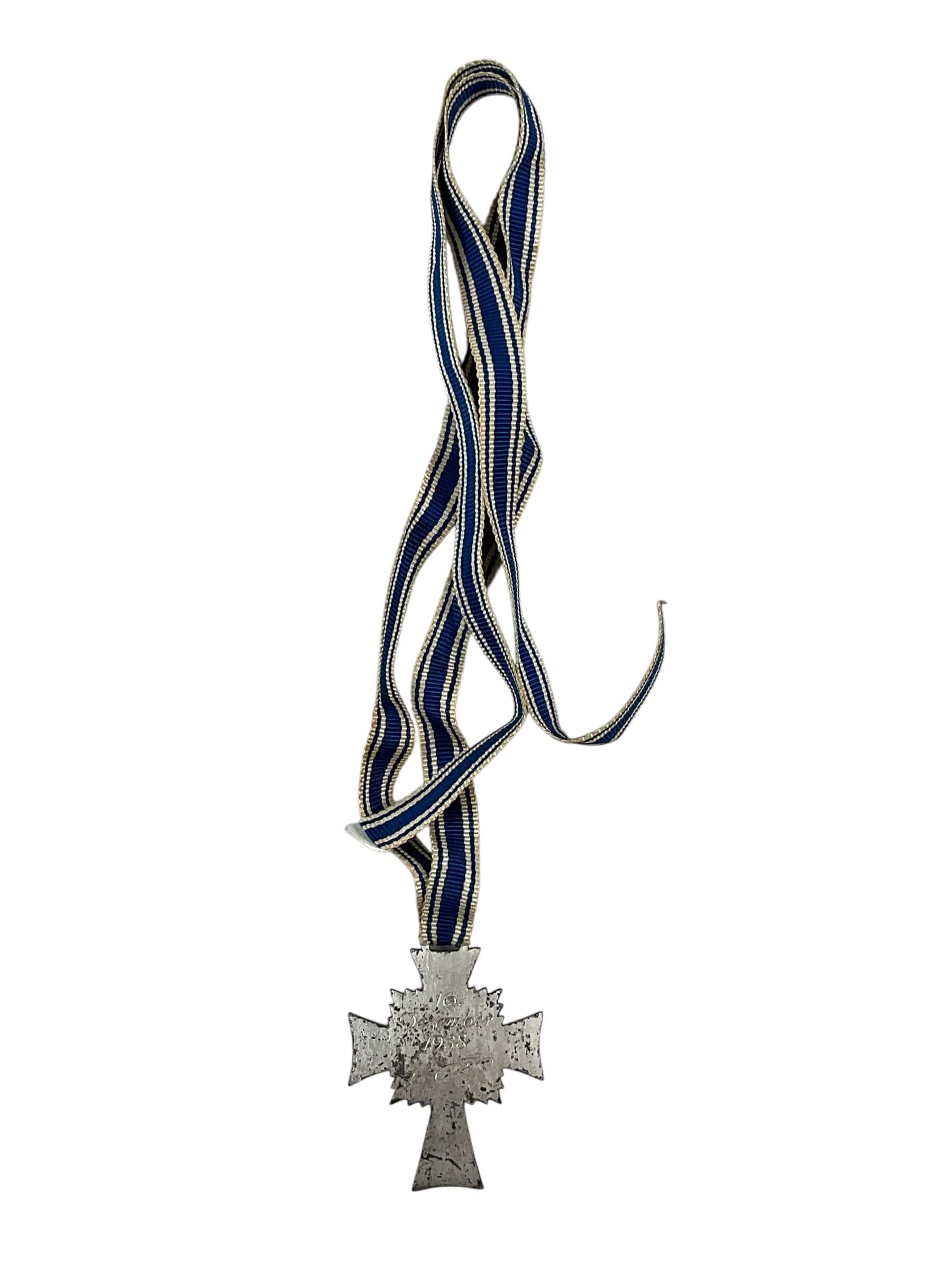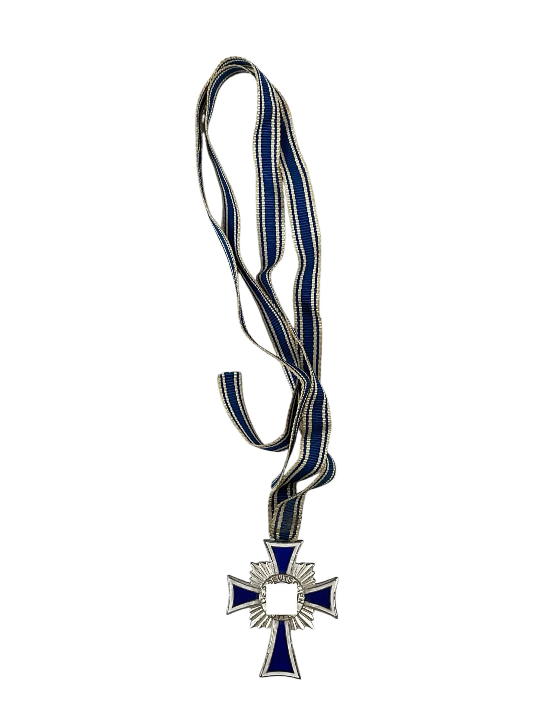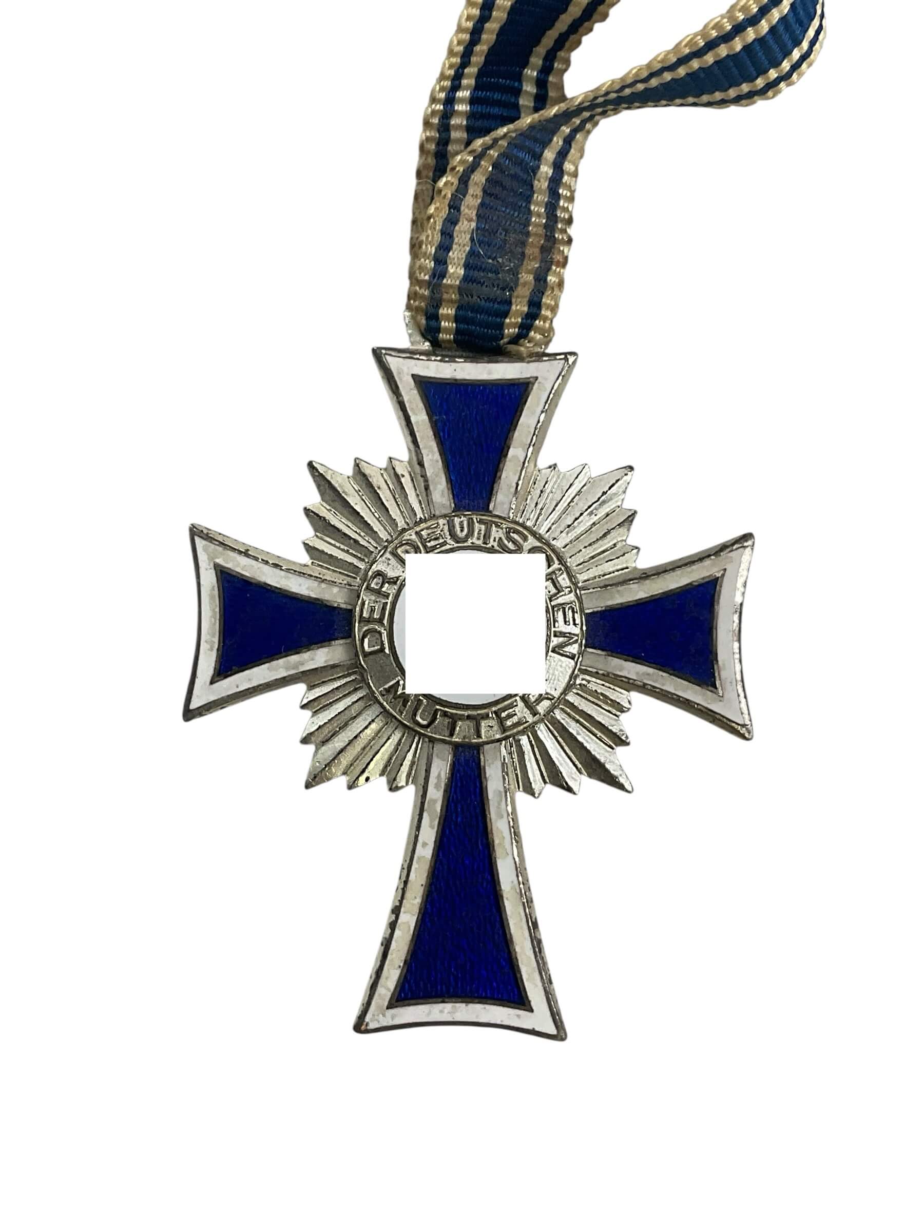 The WW2 German Mothers Cross in Silver, Full Size, is an official medal awarded during the period of the Third Reich. Instituted by Adolf Hitler on 16 December 1938, the Cross of Honour of the German Mother (Ehrenkreuz der Deutschen Mutter) was presented to mothers in recognition of substantial contributions to the German population via childbirth. The silver version represents the second class, which was typically awarded to mothers with six or seven children. The decoration consists of a blue and white enameled Maltese cross with a central medallion featuring a black swastika and the inscription “Der Deutschen Mutter” (To the German Mother). The cross is suspended from a blue and white ribbon and measures approximately 45mm in height. This award is a significant historical artifact reflecting social policies and awards systems in Nazi Germany during the Second World War era. It has relevance to both military and social history collectors.