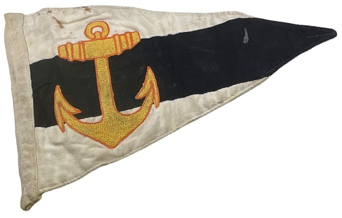 The WW2 German Navy Kriegsmarine Battalion Commander Vehicle Pennant is a significant artifact from World War II, representing the authority and prestige of a high-ranking naval officer within the German Kriegsmarine. This triangular pennant, typically mounted on the commanding officer’s vehicle, features distinctive symbols and colors that denote rank and unit affiliation. Crafted with meticulous attention to detail, the pennant often incorporates elements such as the Iron Cross, naval eagle, and swastika, reflecting the insignias used by the Nazi regime. The pennant not only served a practical role in identifying the command vehicle amidst the chaos of battle but also carried symbolic weight, embodying the power and discipline of the German Navy’s battalion commanders. Collectors and historians value these pennants for their historical significance and the insight they provide into the military regalia and hierarchical structure of the Kriegsmarine during the Second World War.