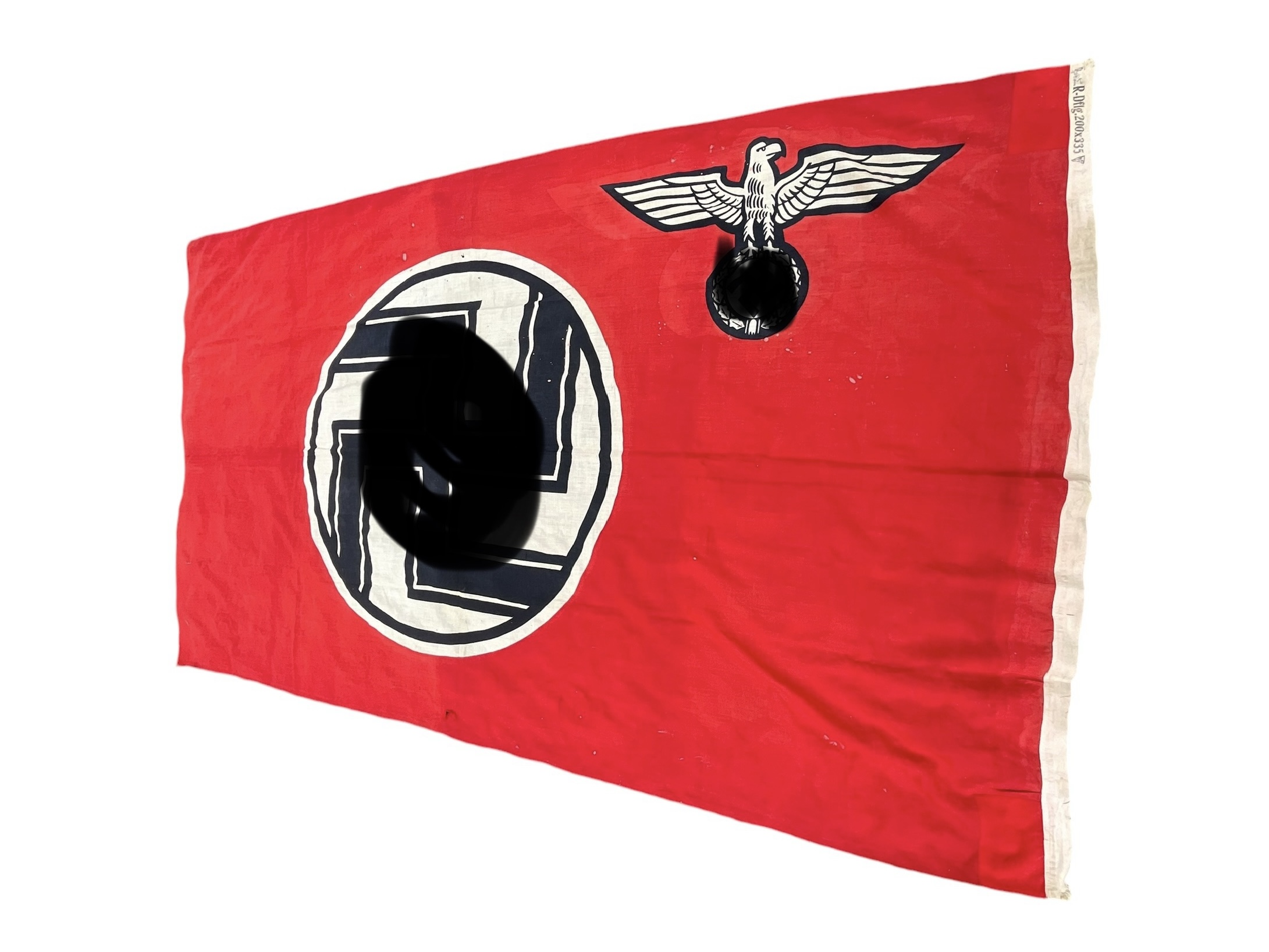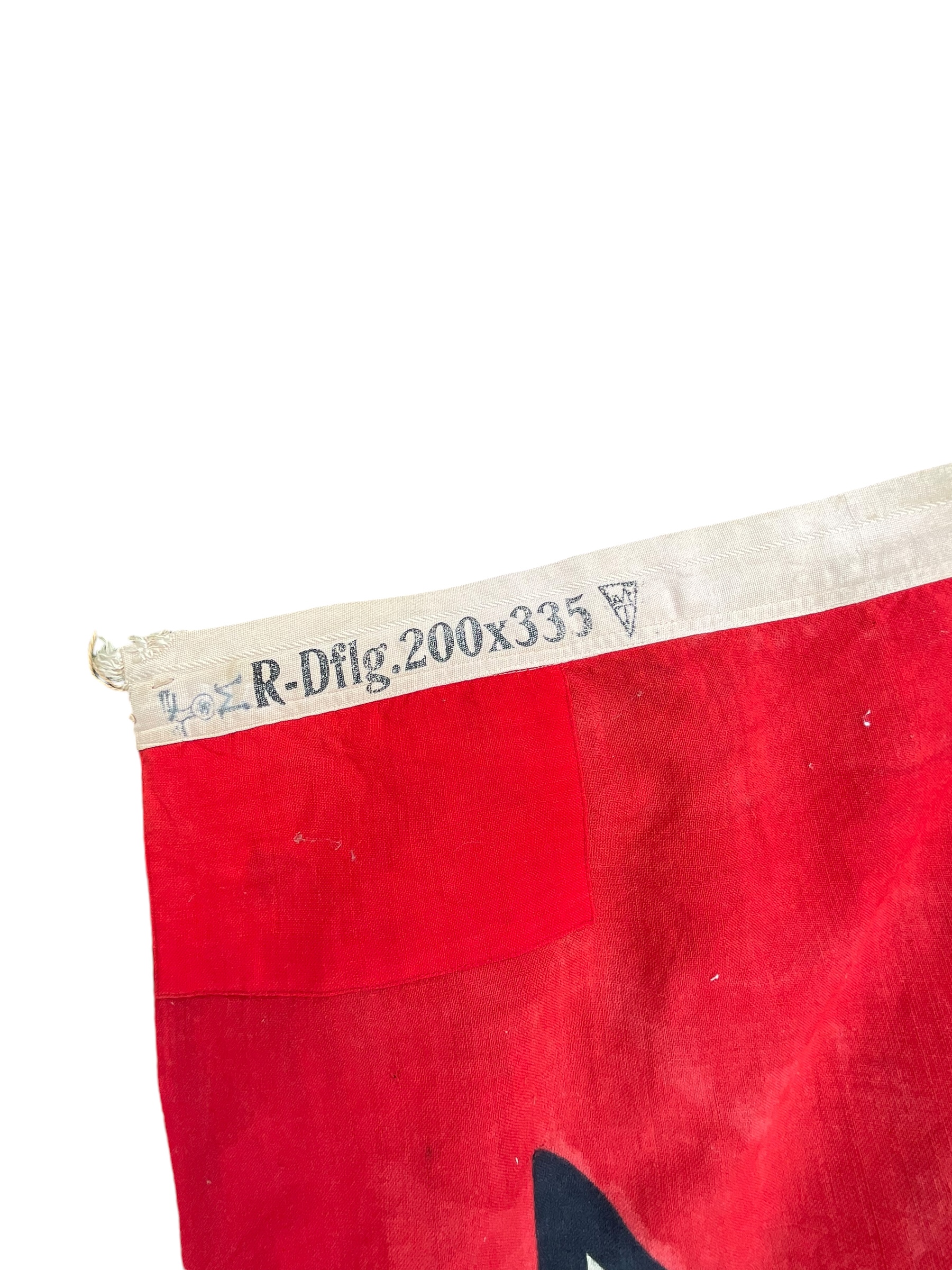 This Kriegsmarine marked State Service Flag measures 200cm x 335cm, a nice large size. The Kriegsmarine, as the navy of Nazi Germany from 1935 to 1945, was one of the primary forces in the World War II maritime conflict. This flag would have been a standard bearer on their vessels, symbolizing the state authority. It is designed with the iconic German colors and insignia of the period, reflecting the aesthetics and ideology of the time. Very bright, good condition. Small patch work in corner.