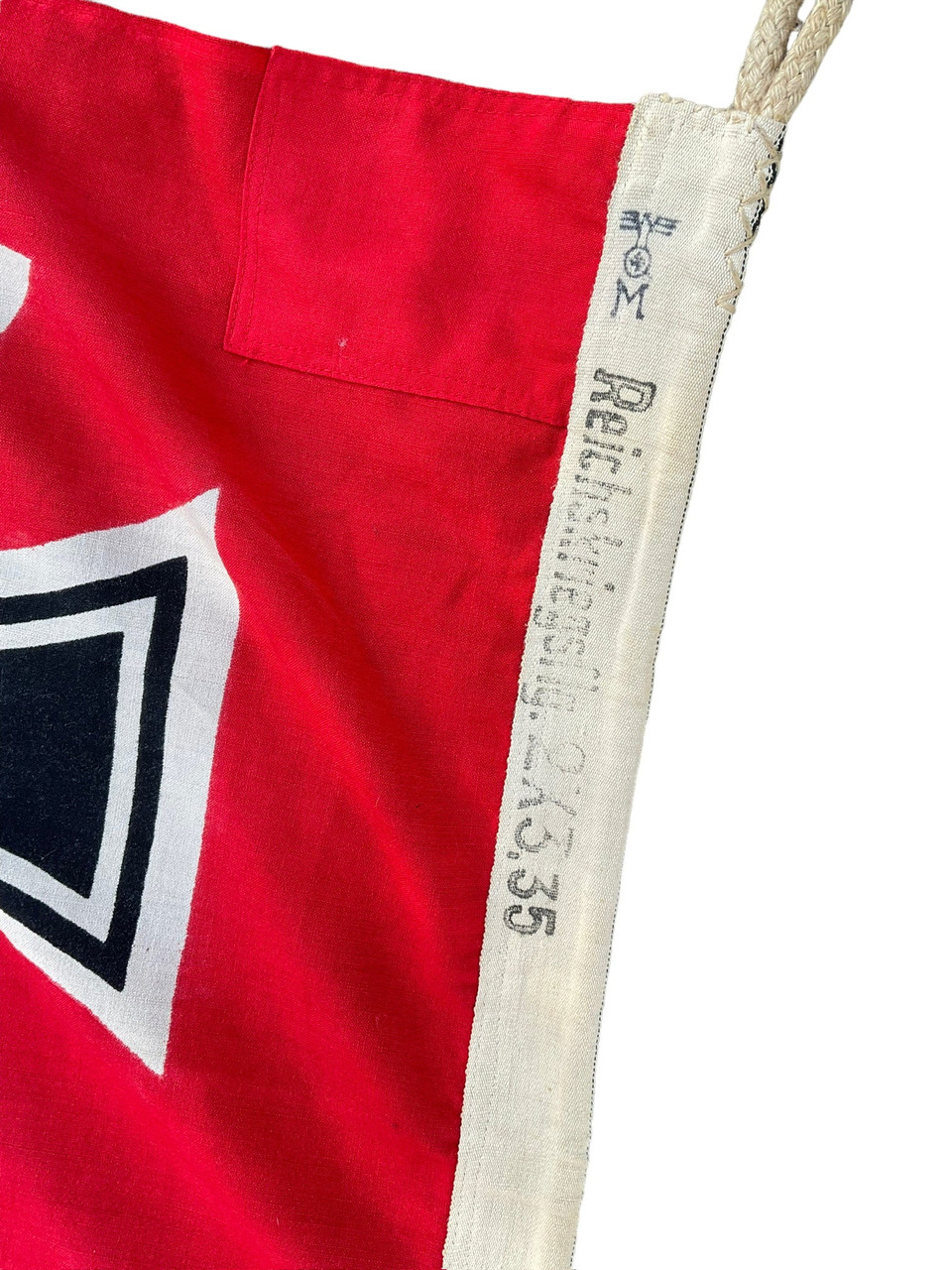 The WW2 German Navy Kriegsmarine National War Reichskriegsflagge is a historically significant artifact measuring 200 cm by 335 cm. This imposing flag represents the naval ensign used by the Kriegsmarine, the navy of Nazi Germany, during World War II. Crafted with striking attention to detail, it features the quintessential elements associated with the Reichskriegsflagge, including the Iron Cross and swastika, which symbolize the regime’s wartime ethos and military might. The sizeable dimensions of the flag reflect its use on large naval vessels, where it served both as a symbol of national pride and military sternness. Collectors and historians find this flag to be a poignant reminder of a tumultuous period in history, offering a tangible connection to the past through its preserved fabric and design. It stands as a crucial artifact for understanding naval traditions, military history, and the broader implications of World War II.