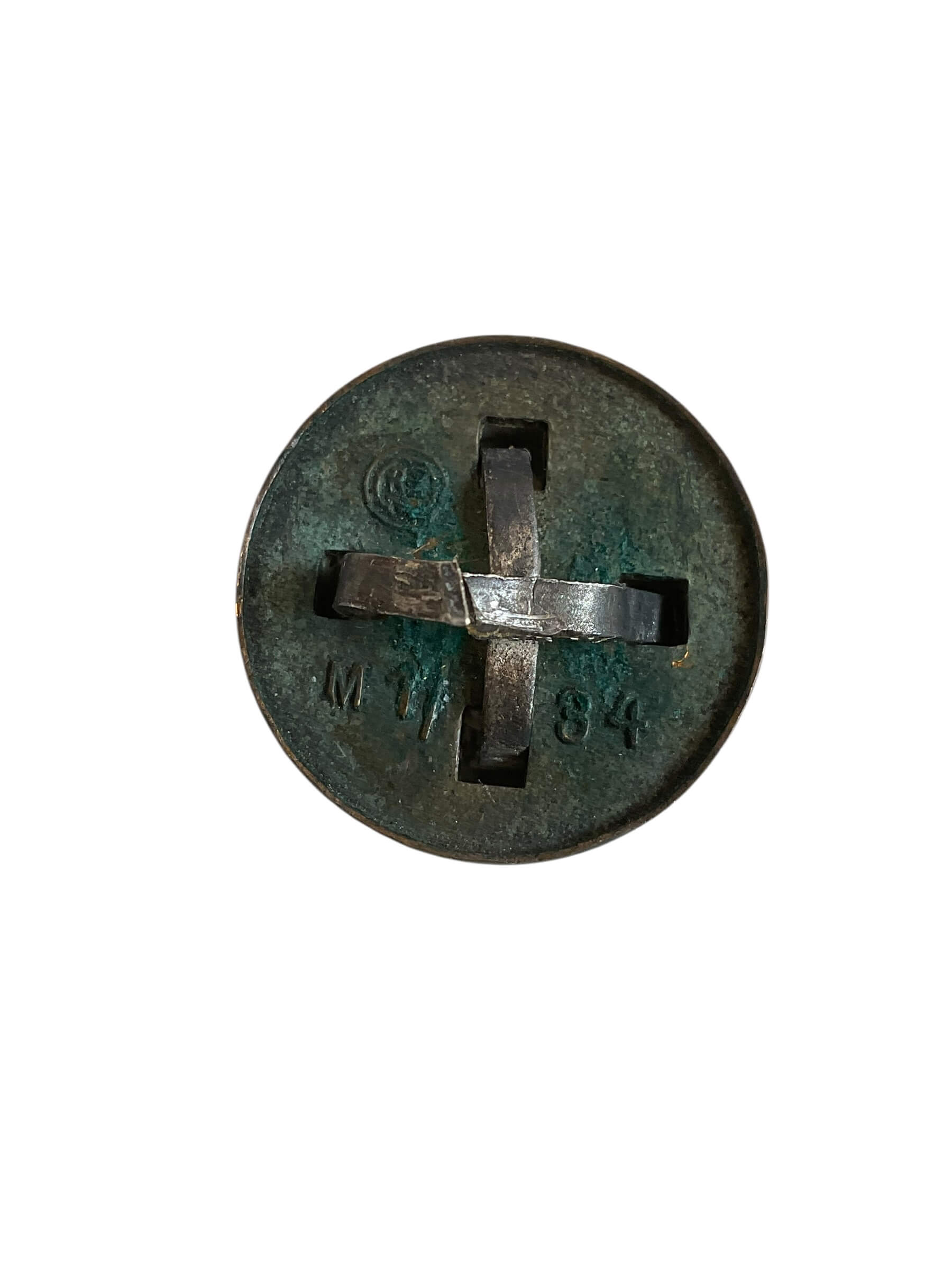The WW2 German NSDAP Political Visor Cap Cockade is an original insignia used during the period of the Third Reich. This cockade was affixed to the front of political leader visor caps worn by members of the National Socialist German Workers’ Party (NSDAP). It typically consists of a stamped metal construction, featuring a circular design with a central black swastika on a white background, encircled by a red enamel edge, and often backed by a silver or aluminum wreath. The cockade signified party affiliation and rank within the NSDAP’s political hierarchy. The reverse side usually includes prongs or pins for attachment to the visor cap band. Measuring approximately 2–3 cm in diameter, these cockades were part of the official uniform regulations. Their design and use are distinctive compared to military versions, reflecting the unique insignia system of the NSDAP political organizations during World War II.