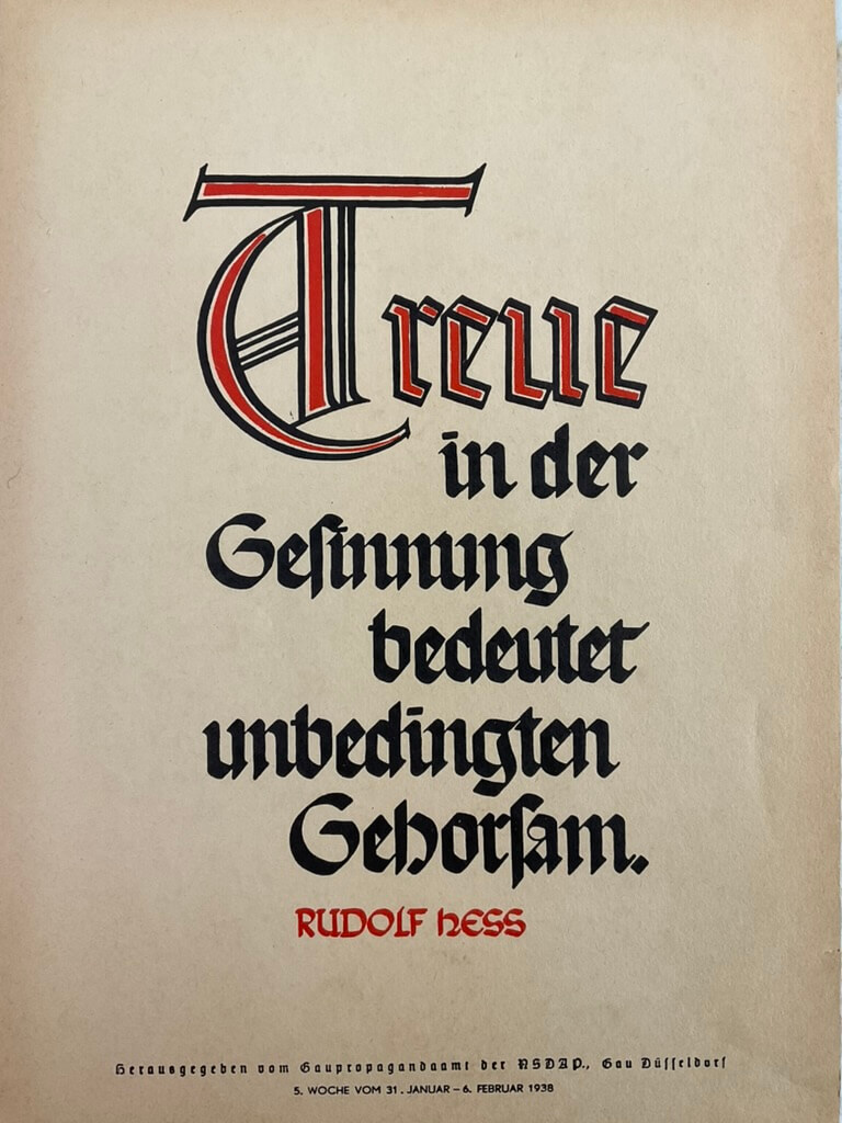 The WW2 German NSDAP Quote Poster Print measures approximately 13 1/2 inches by 9 1/2 inches. This item features a quotation associated with the National Socialist German Workers’ Party (NSDAP), the ruling political party in Germany from 1933 to 1945. Such prints were commonly produced during the Third Reich for the purposes of propaganda, ideological reinforcement, or public