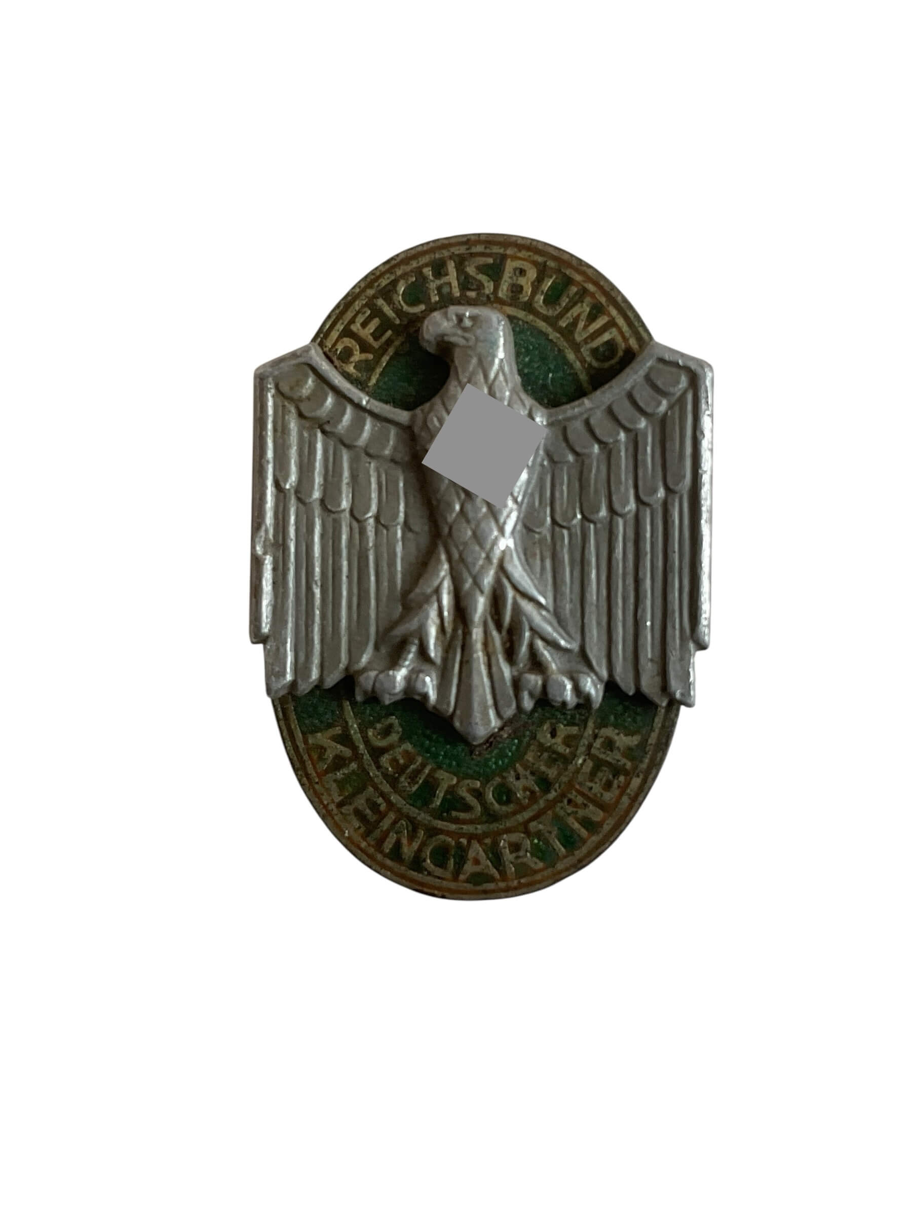 The WW2 German NSDAP Reichsbund Deutscher Kleingärtner Lapel Pin is an original period artifact associated with the Reich Association of German Allotment Gardeners, an organization aligned with the National Socialist German Workers’ Party (NSDAP) during the Third Reich era. This lapel pin would have been worn by members to indicate affiliation with the organization, which promoted small-scale urban gardening in accordance with ideological goals of the period. The pin is typically constructed from metal and features the Reichsbund’s emblem, which often includes stylized elements such as a spade and foliage, along with associated insignia and the NSDAP swastika. The reverse side usually bears a pin-back fastening for secure attachment to clothing. These pins were issued between 1933 and 1945 and serve as material evidence of the widespread integration of civic organizations into the broader framework of the Nazi Party in Germany prior to and during the Second World War.