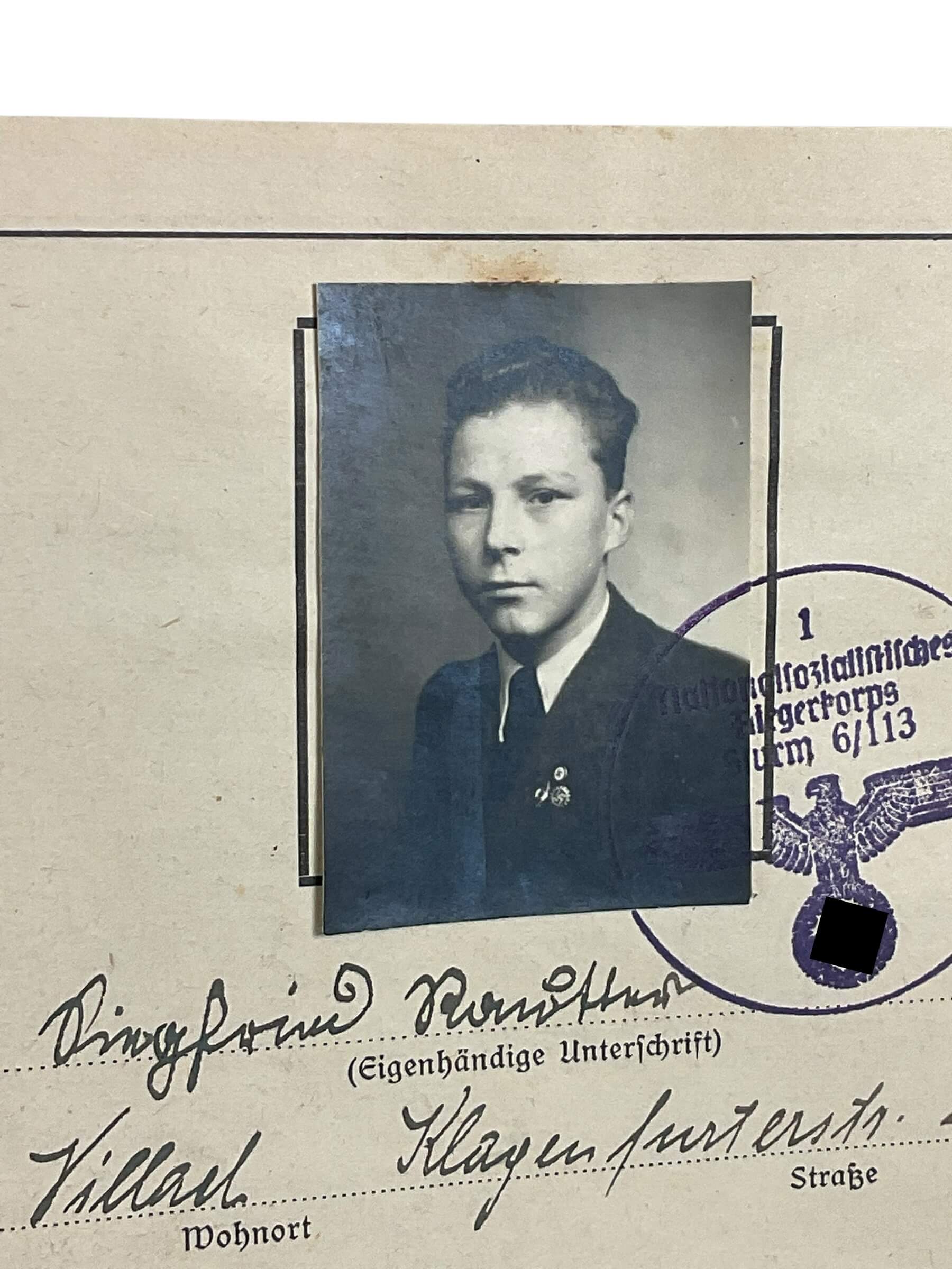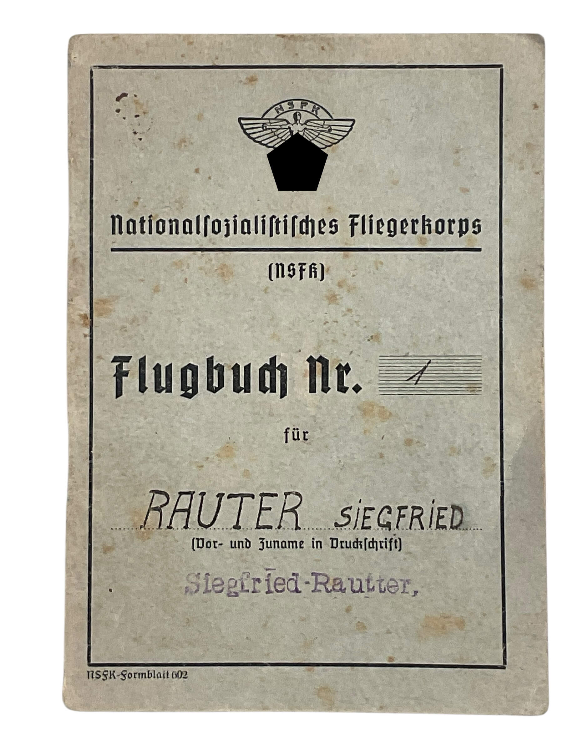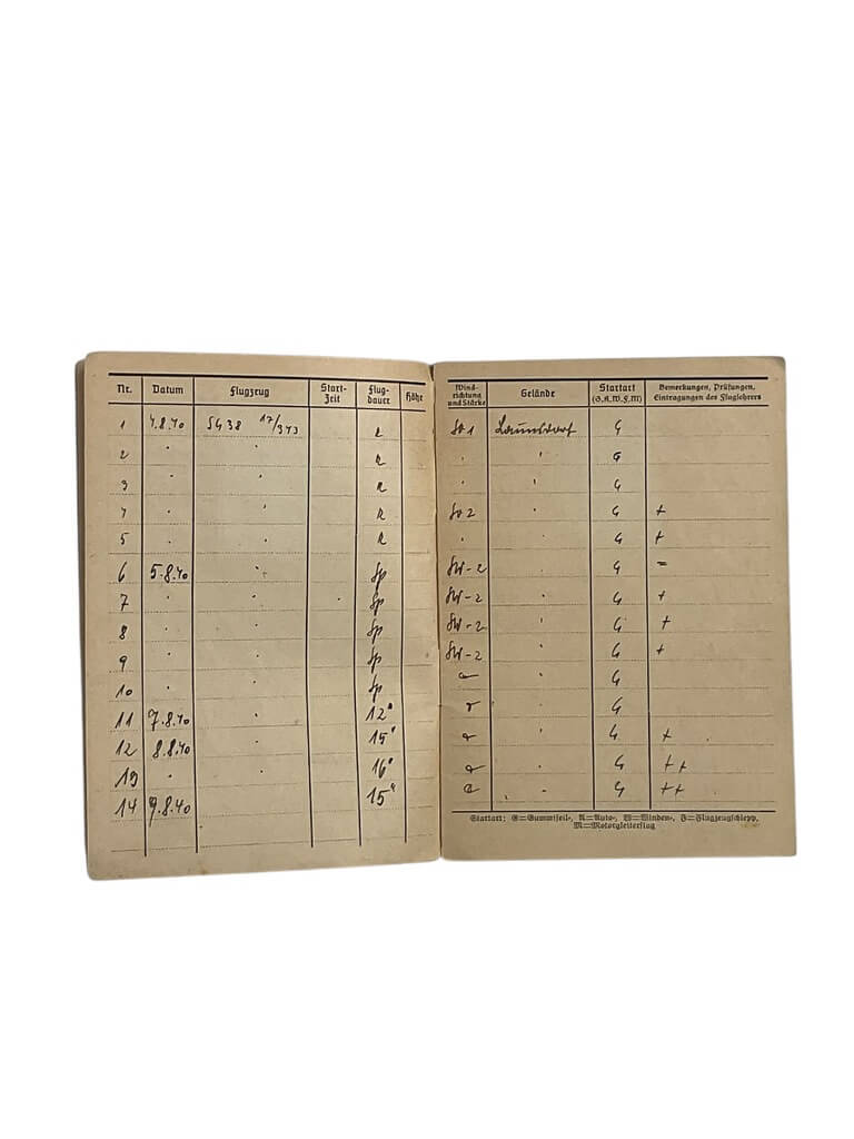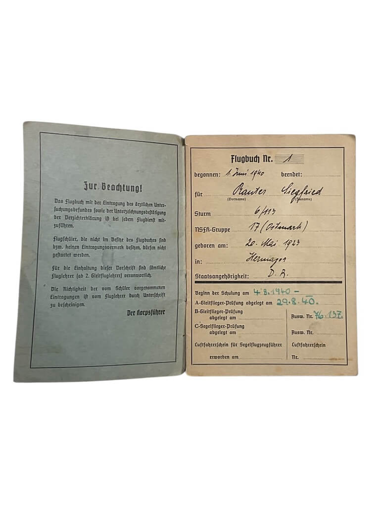 The WW2 German NSFK Flugbuch Log Book Named is an original flight logbook associated with the Nationalsozialistisches Fliegerkorps (NSFK), a paramilitary aviation organization in Nazi Germany from 1937 to 1945. This log book documents the flight activity and training of a specific individual, whose name is recorded within the entries. The Flugbuch typically contains handwritten records of flights, dates, aircraft types, and routes, providing insight into the qualifications and experiences of the NSFK member. Its standardized format was used to track a member’s progression and aviation achievements within the organization. Physical characteristics often include a softcover binding, official NSFK insignia on the cover, and printed organizational details on the interior. Items such as this log book are significant for those studying military aviation history, as they illustrate the structure and operations of pre-Luftwaffe flying organizations in Germany during the Second World War.