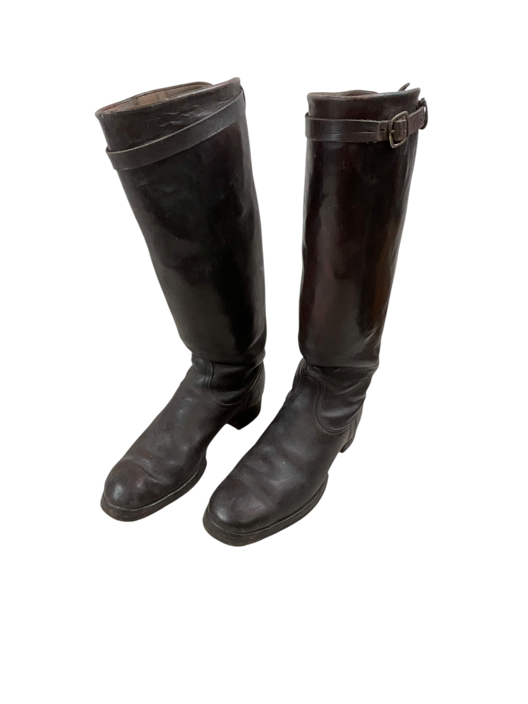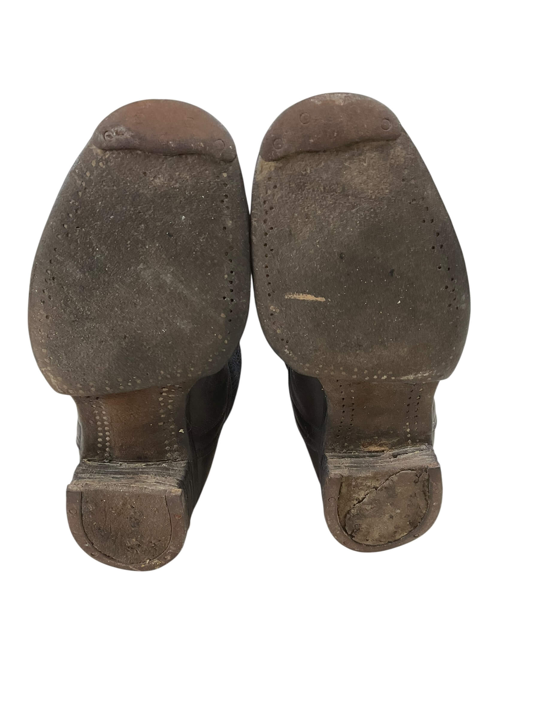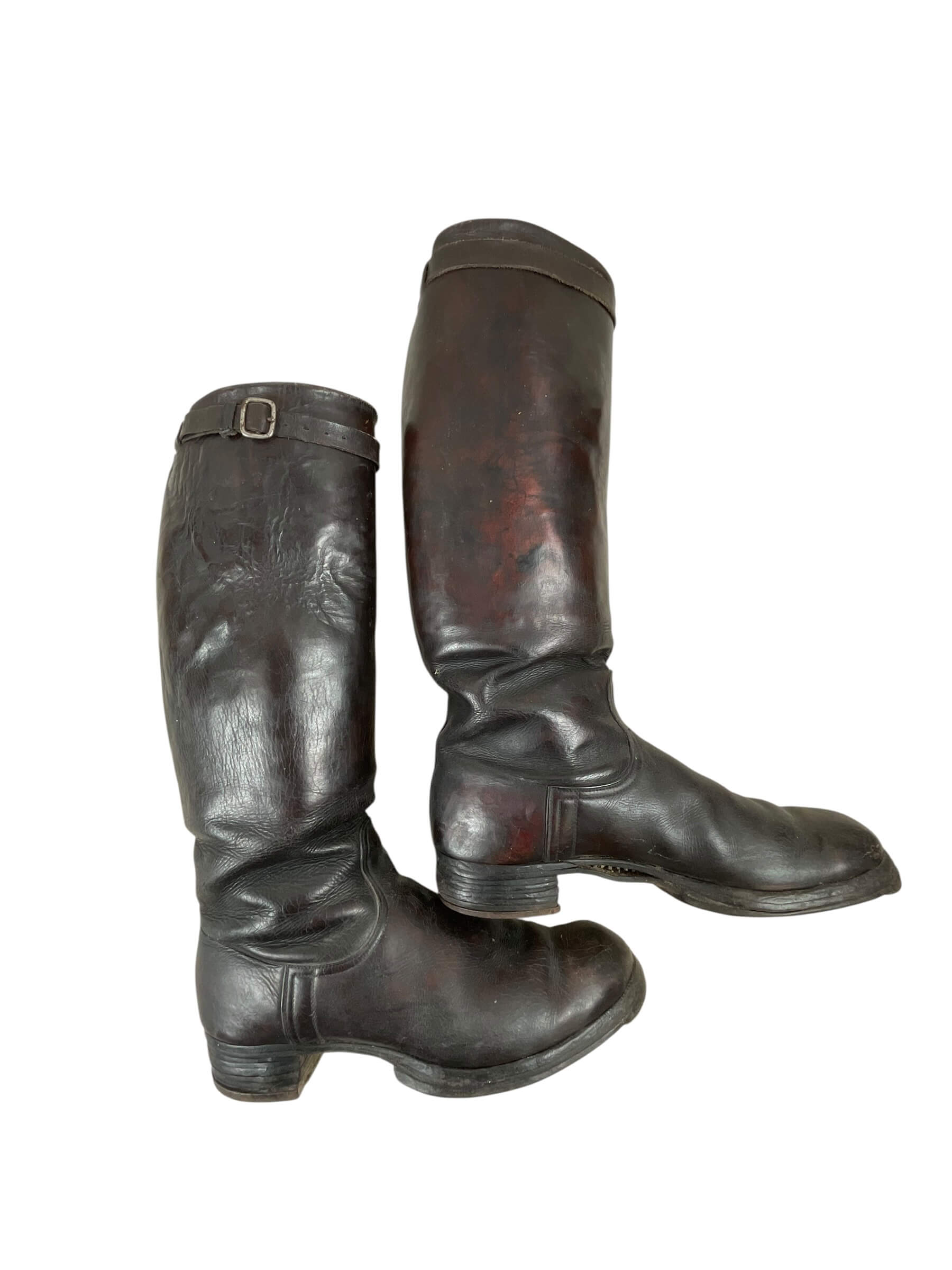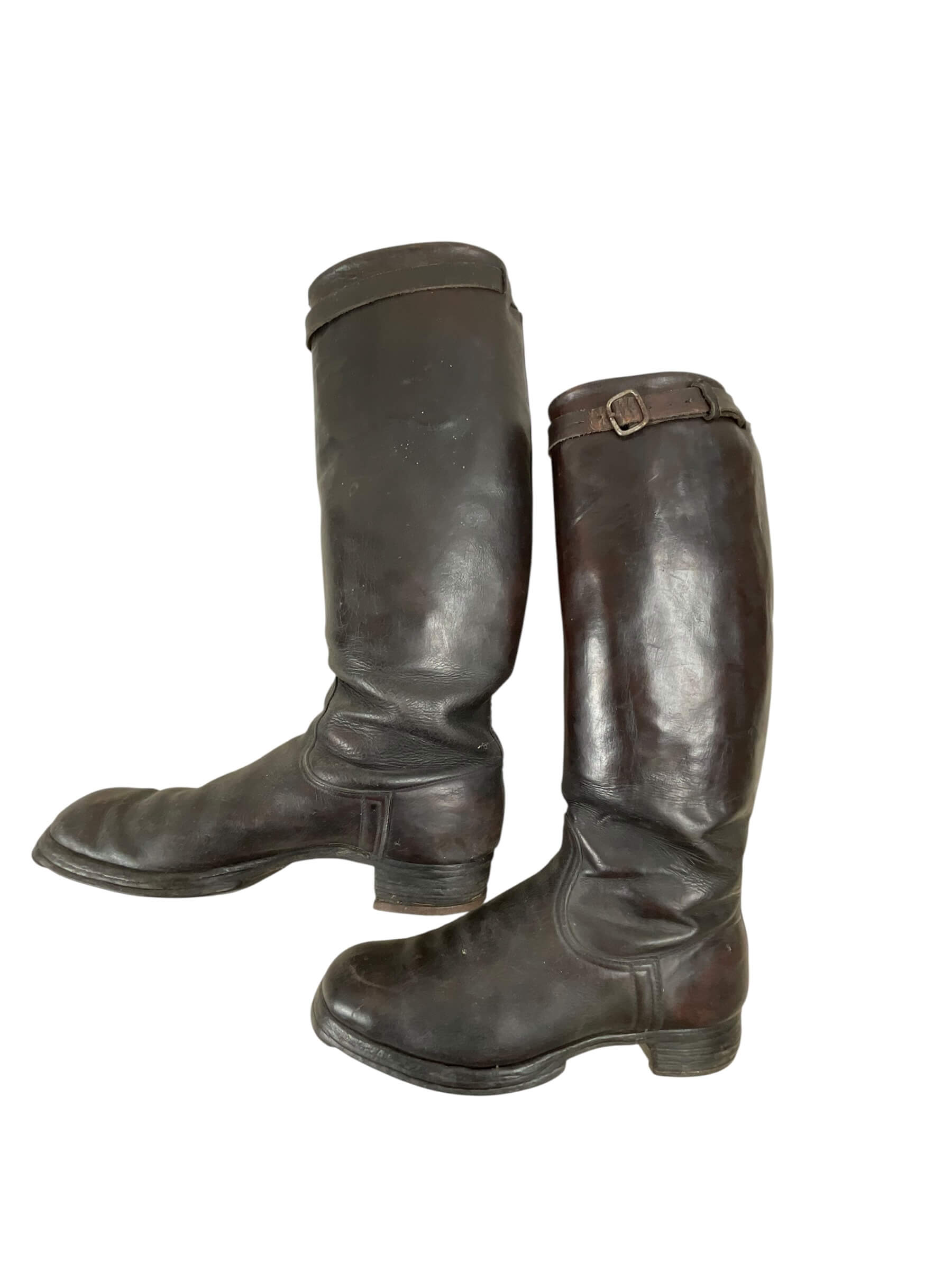 The WW2 German Officer’s Black Leather Boots are an example of standard-issue footwear used by officers of the German military during the Second World War. Constructed from high-quality black leather, these boots were designed to provide durability and protection in varied field conditions. The design typically features a tall shaft reaching below the knee, with a smooth exterior finish and a rounded toe. Soles are commonly reinforced with hobnails or leather stitching, and the boots often include pull straps or loops near the top to assist with putting them on. These boots were worn as part of the formal and everyday uniform, reflecting both functional and regulatory standards of the era. Officer boots usually displayed superior craftsmanship compared to enlisted men’s versions, often using finer materials and more precise detailing. Such items are of particular interest in the study of military uniforms and personal equipment from the European Theatre of WW2.