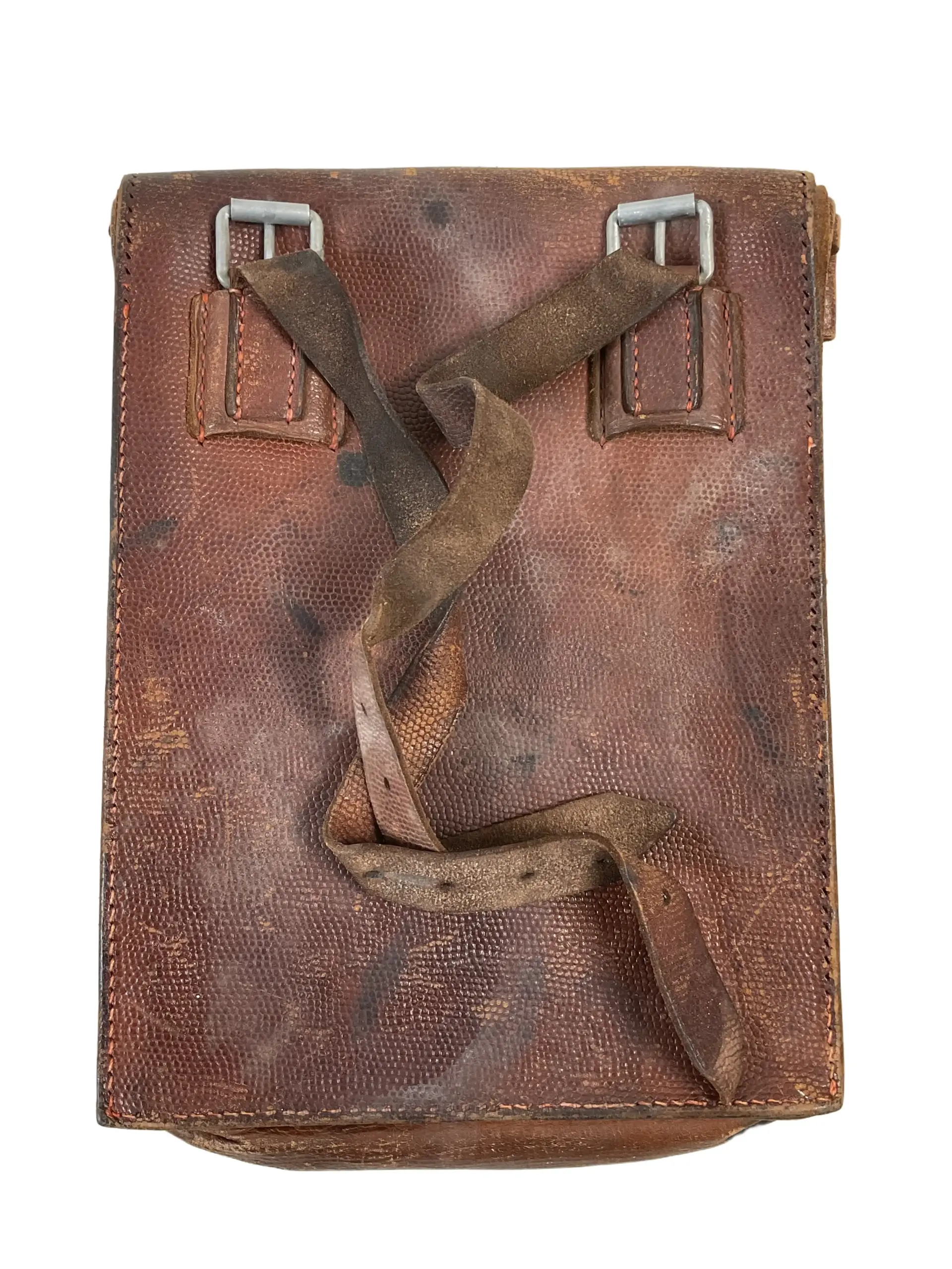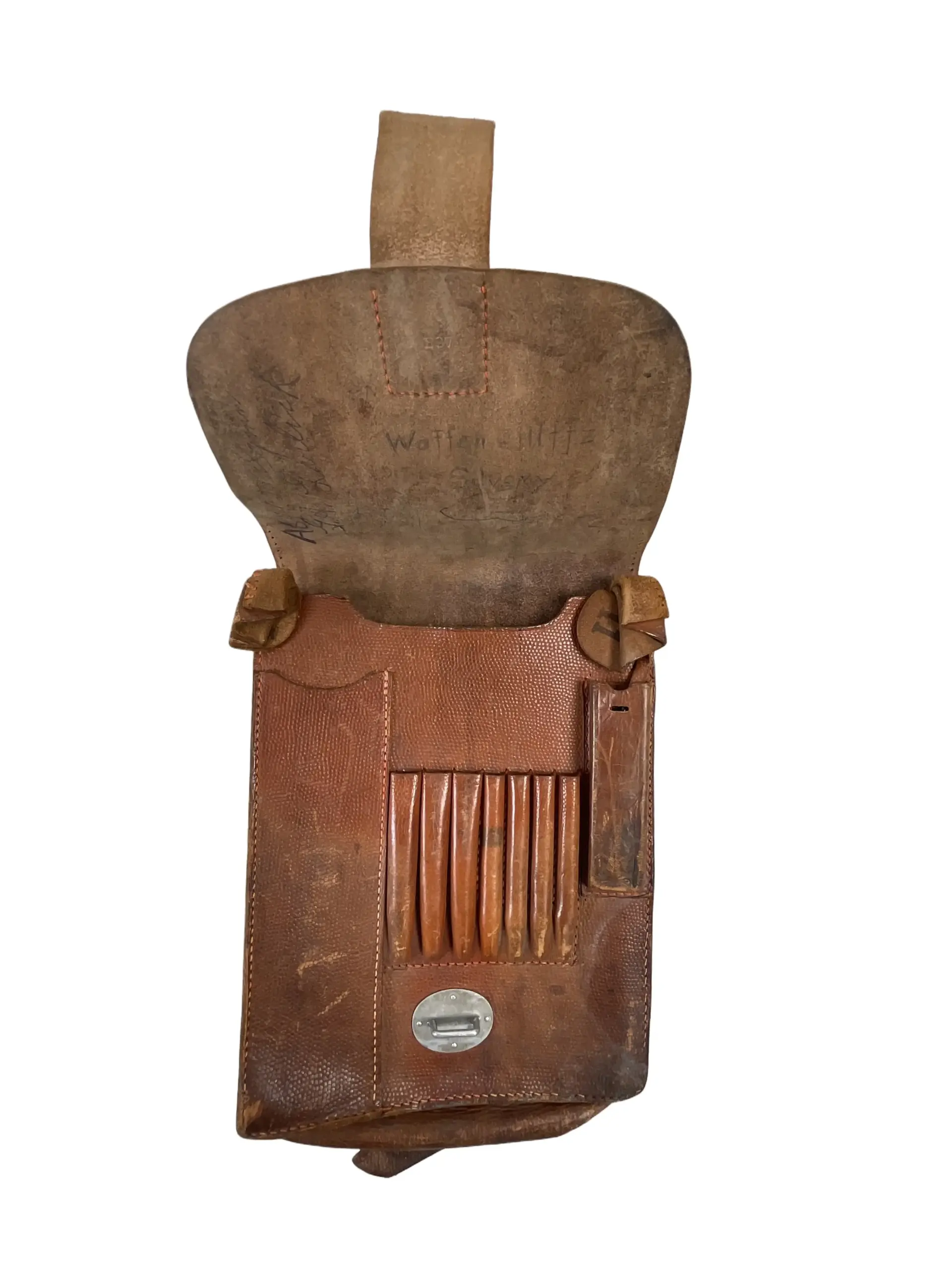 This WW2 German Officers Map Case is an original artifact dated 1943 and is identified with the name of its former owner. Issued to German Army officers during the Second World War, map cases of this type were essential for storing and organizing navigational materials, maps, pencils, and documents in the field. Constructed from brown leather, the case features reinforced stitching, flap closure, and interior compartments typical of wartime German military equipment. The 1943 date and manufacturer markings are stamped on the reverse side, providing authentication and historical context. The presence of an officer’s name further personalizes the item and aids in tracing its provenance. Overall condition reflects typical field wear, consistent with age and use. Map cases played a crucial role in command and operational planning, making them significant items of military history. This piece serves as a representative example of German Army officer’s field gear from 1943.