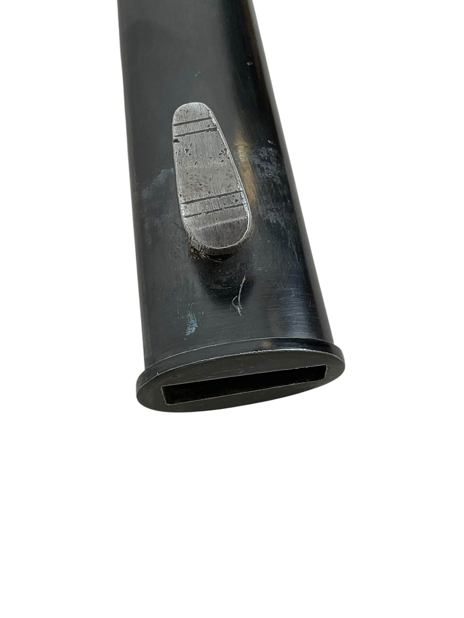 This particular item, the WW2 German Police Dress Bayonet Maker Holler with Scabbard, is a historically significant artifact. Manufactured by the renowned Holler company, this bayonet is an exquisite representation of German craftsmanship during World War II. It was primarily used by the German police as part of their formal attire, showcasing authority and power. The bayonet features a detailed design etched into the blade, while the handle is meticulously crafted for a strong grip. It comes with a scabbard, which is designed to match the bayonet and is equally rich in intricate detailing. This bayonet is not just a weapon, but a piece of history, providing an insight into the lives of those who were part of the war. It reflects the seriousness and discipline of the German police during this period, making it a significant collectible for those interested in military history.