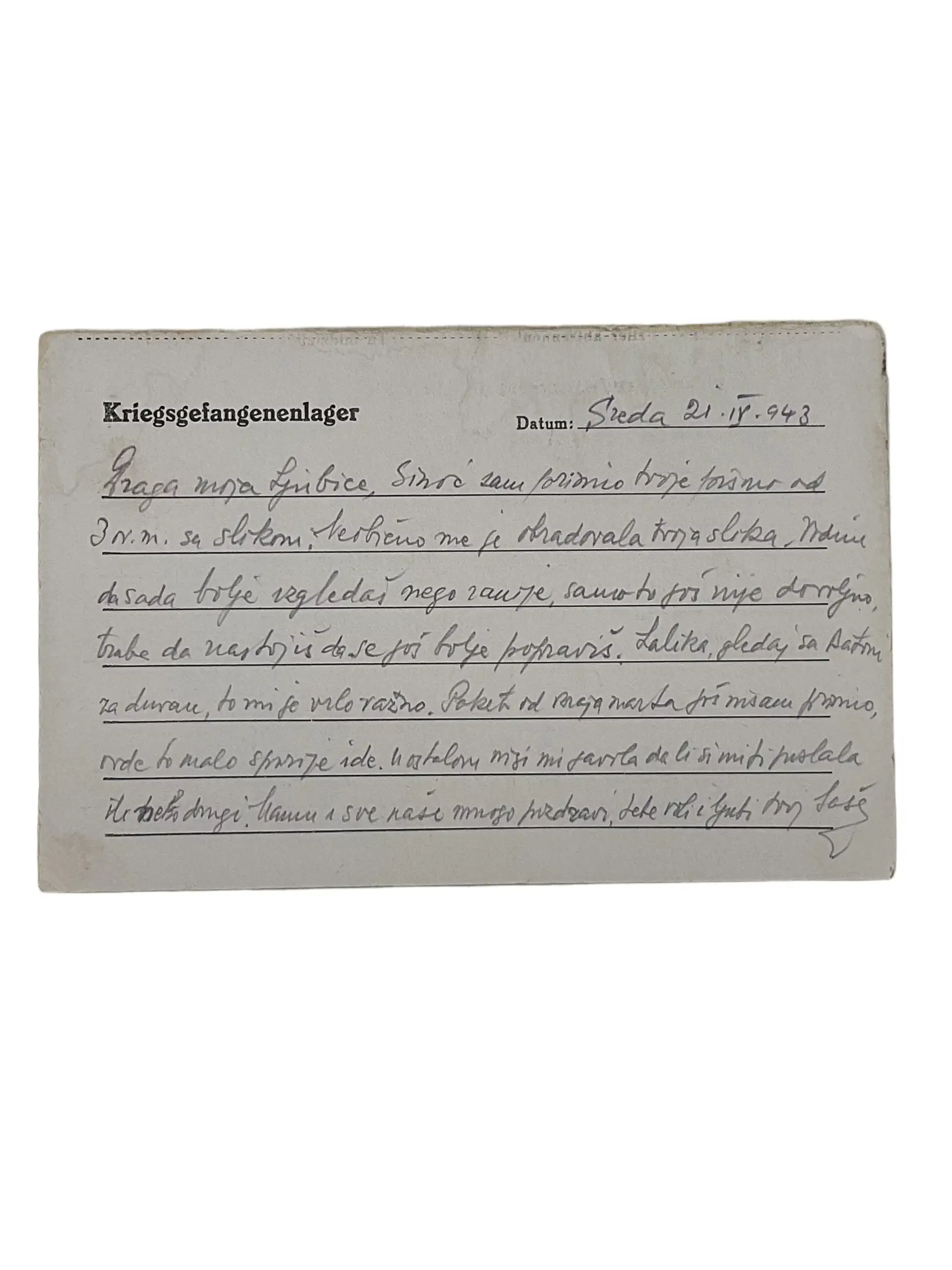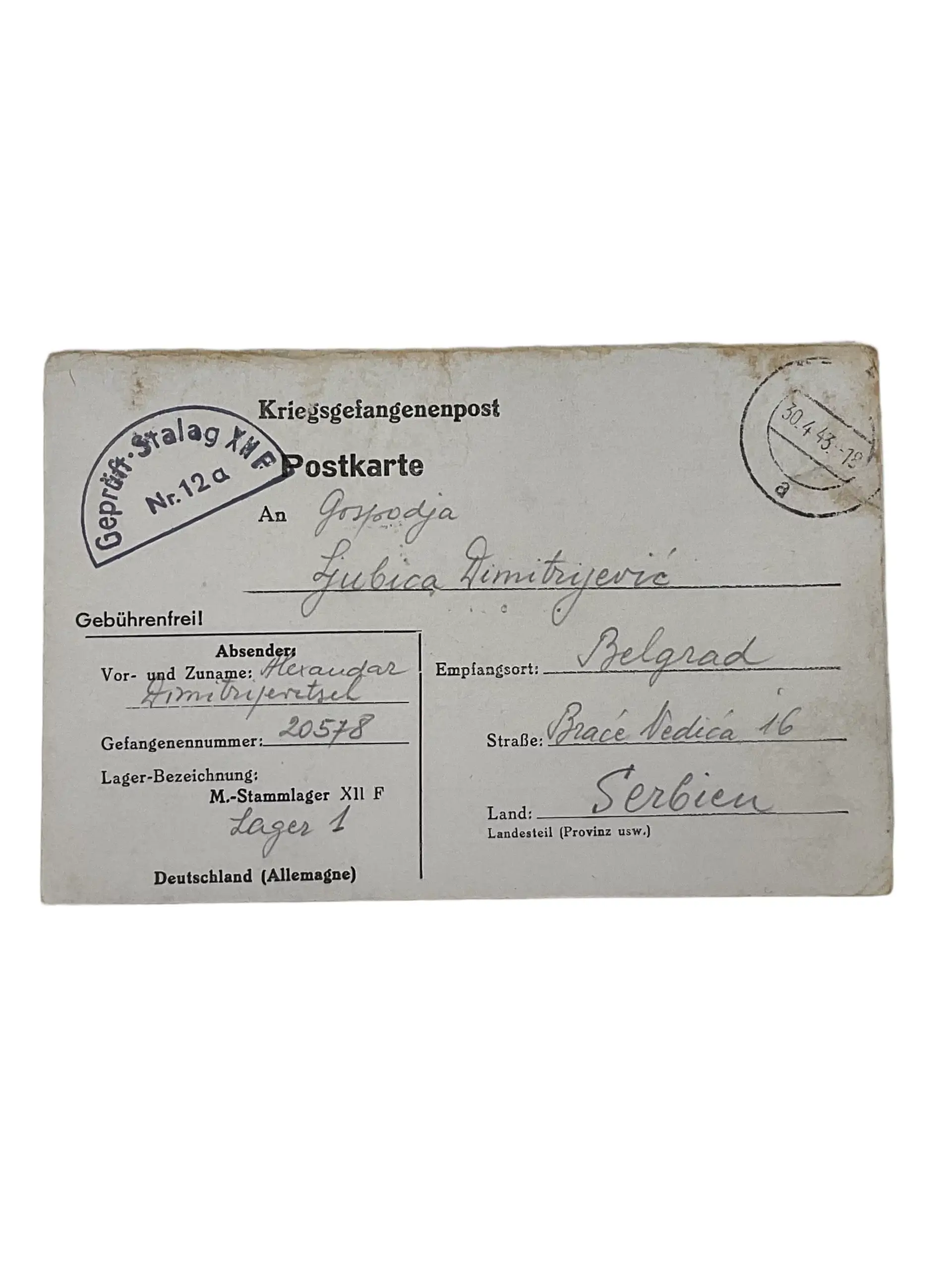 WW2 German POW Serbian Postcard Dated 1943 This original World War II German prisoner of war (POW) postcard, dated 1943, originates from a detention facility in Serbia. It was sent by a German serviceman held as a POW during the conflict, reflecting both the administrative procedures and personal communication of the era. The postcard features period-correct Serbian postal markings and censor