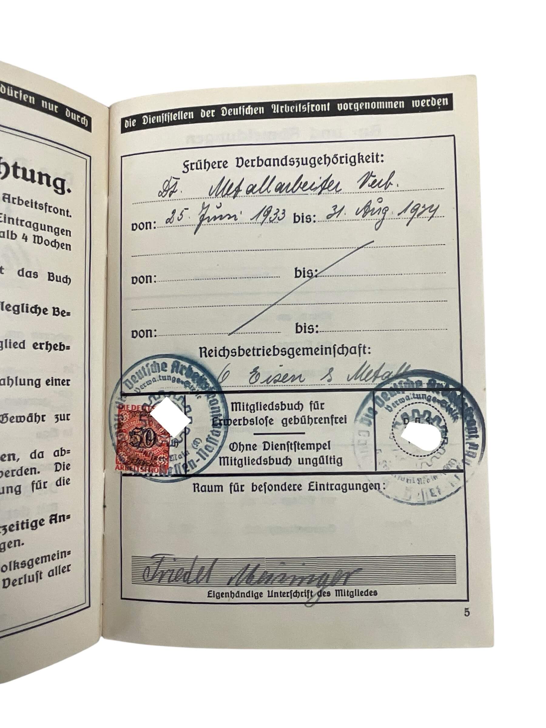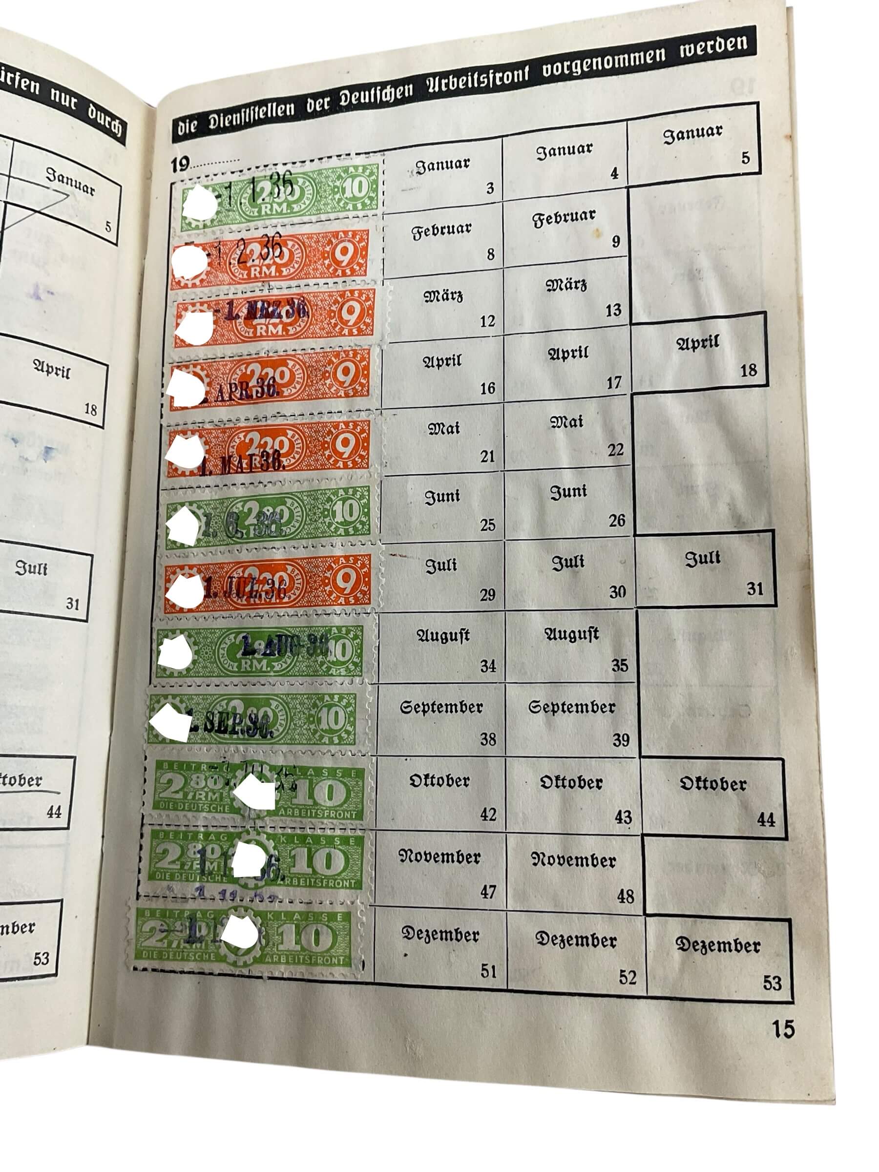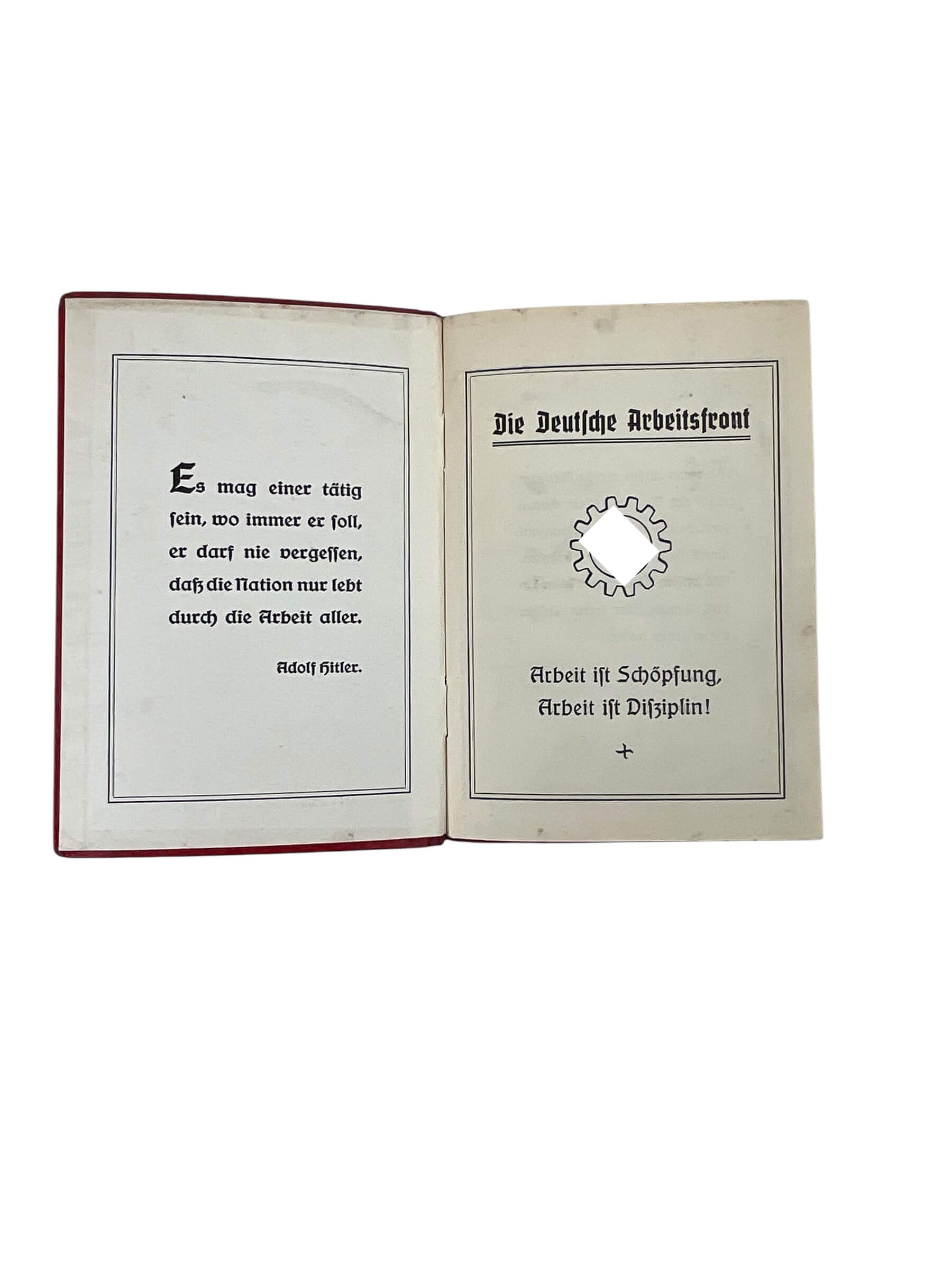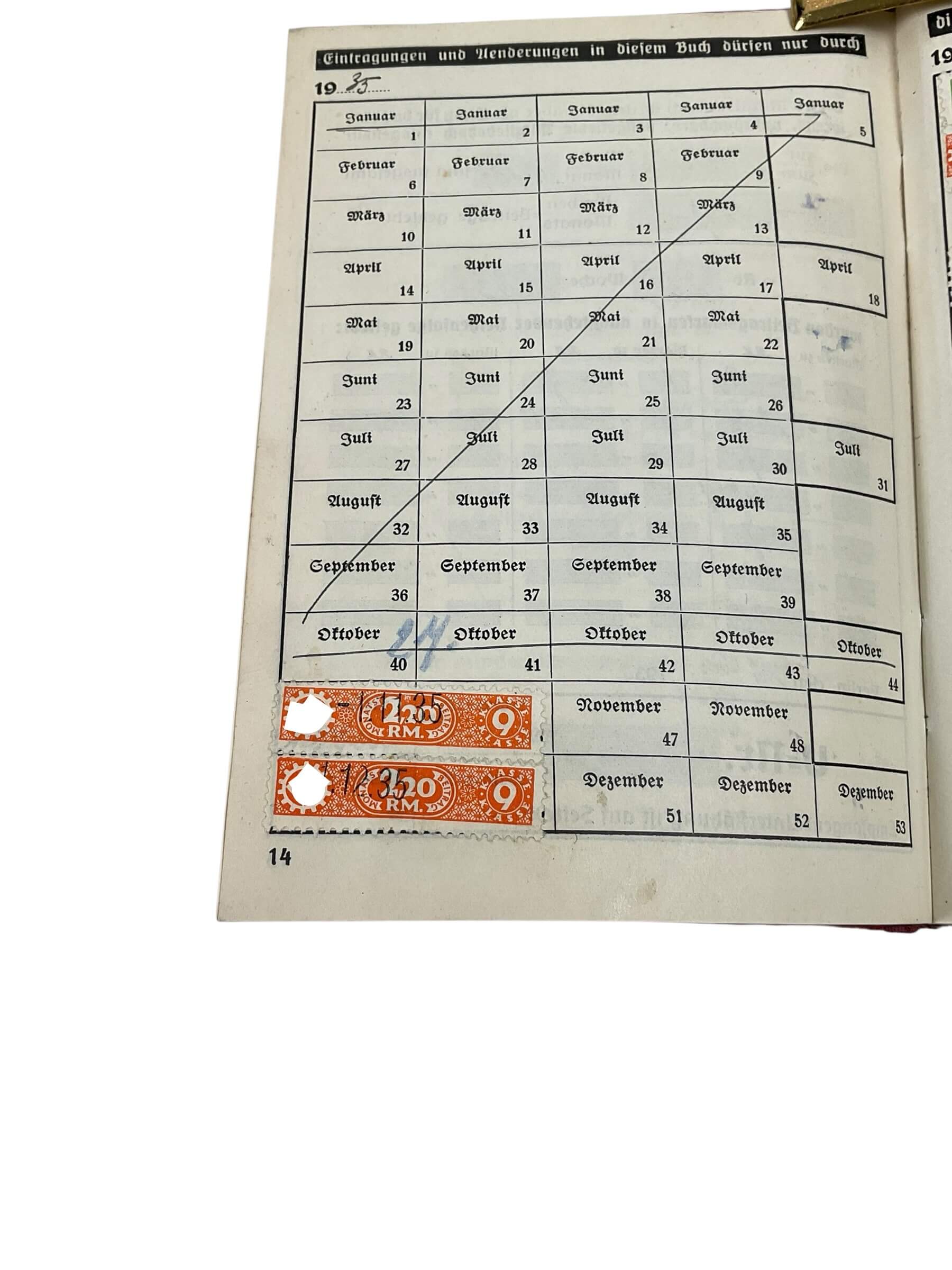 The WW2 German RAD Workers Book is an original identification and record booklet issued to members of the Reichsarbeitsdienst (RAD), or Reich Labour Service, during the period of the Third Reich. The RAD was a major labor organization in Nazi Germany, established to provide mandatory public works service and as a form of pre-military training. The book typically contains the individual’s personal information, service records, assignments, and official stamps or notations documenting their period of employment within the RAD. It often features printed and handwritten entries, and may include the RAD insignia on the cover. These booklets were required for administrative purposes, serving both as proof of service and for the dissemination of official directives. The item provides historical insight into the organization and operation of the Reich Labour Service as well as into the documentation practices of wartime Germany. This booklet is of interest for study of World War II era bureaucratic processes and labor organizations.
