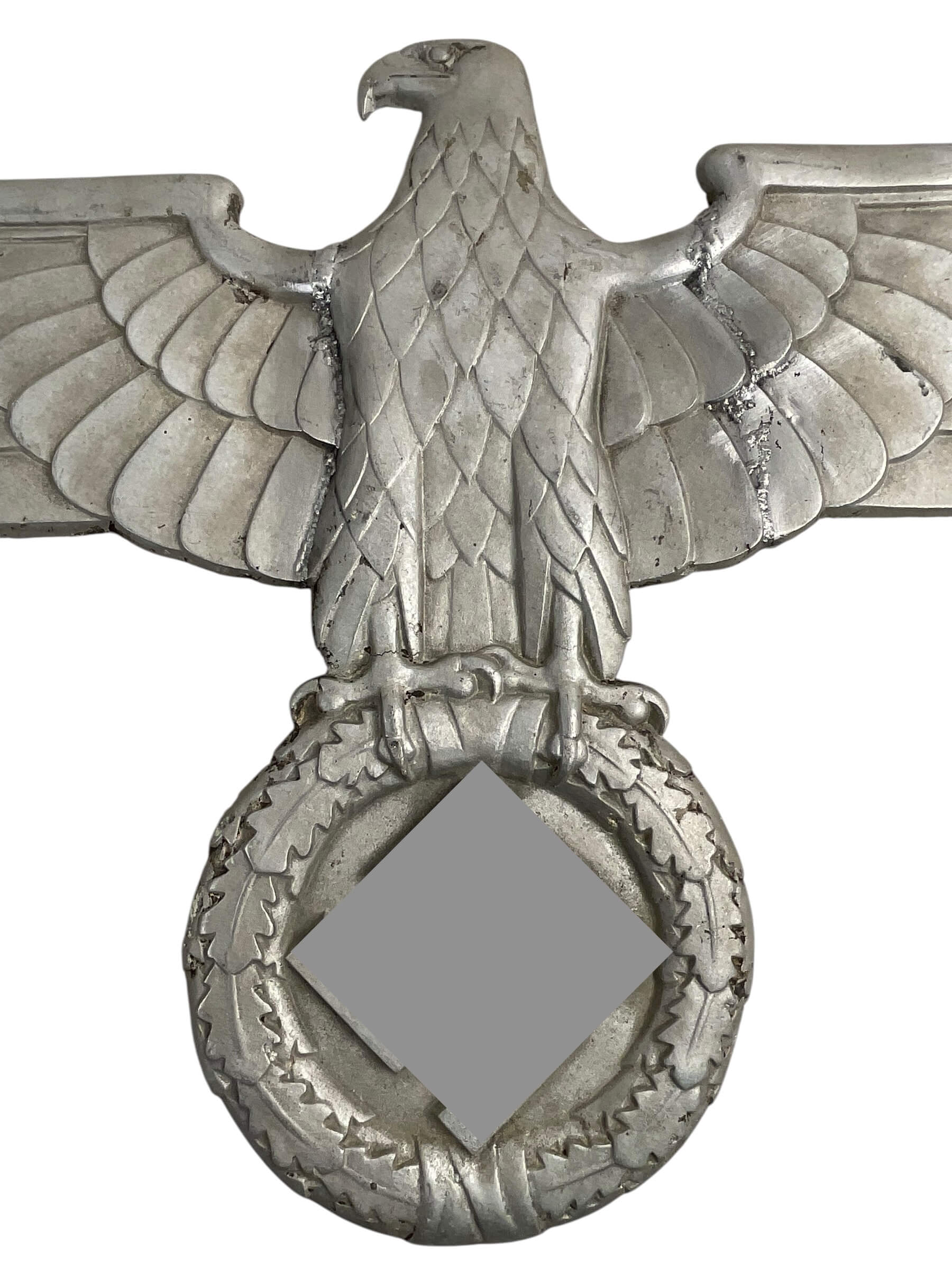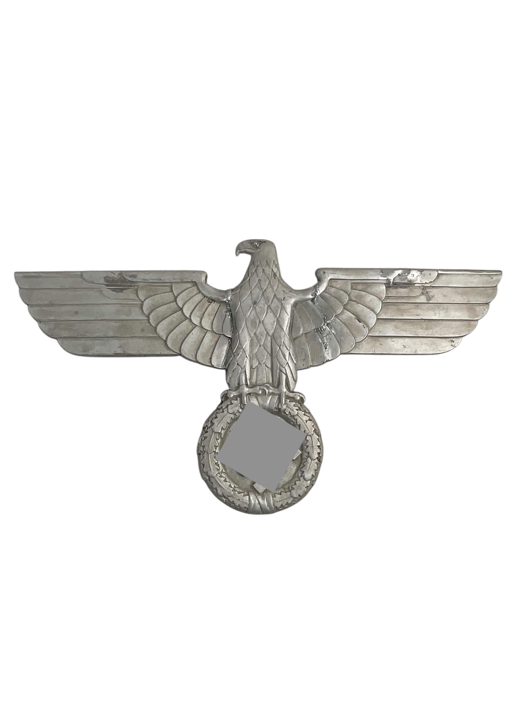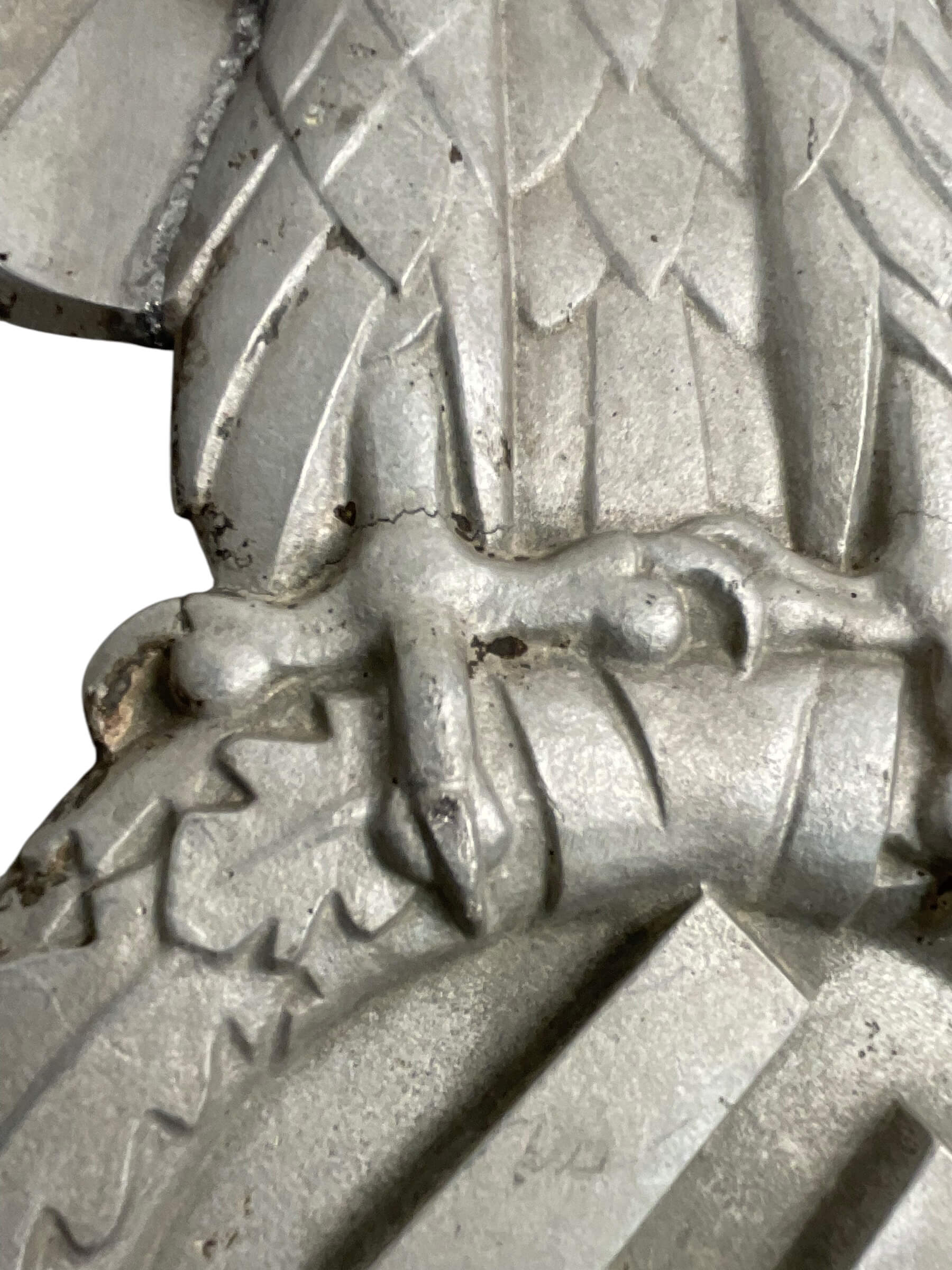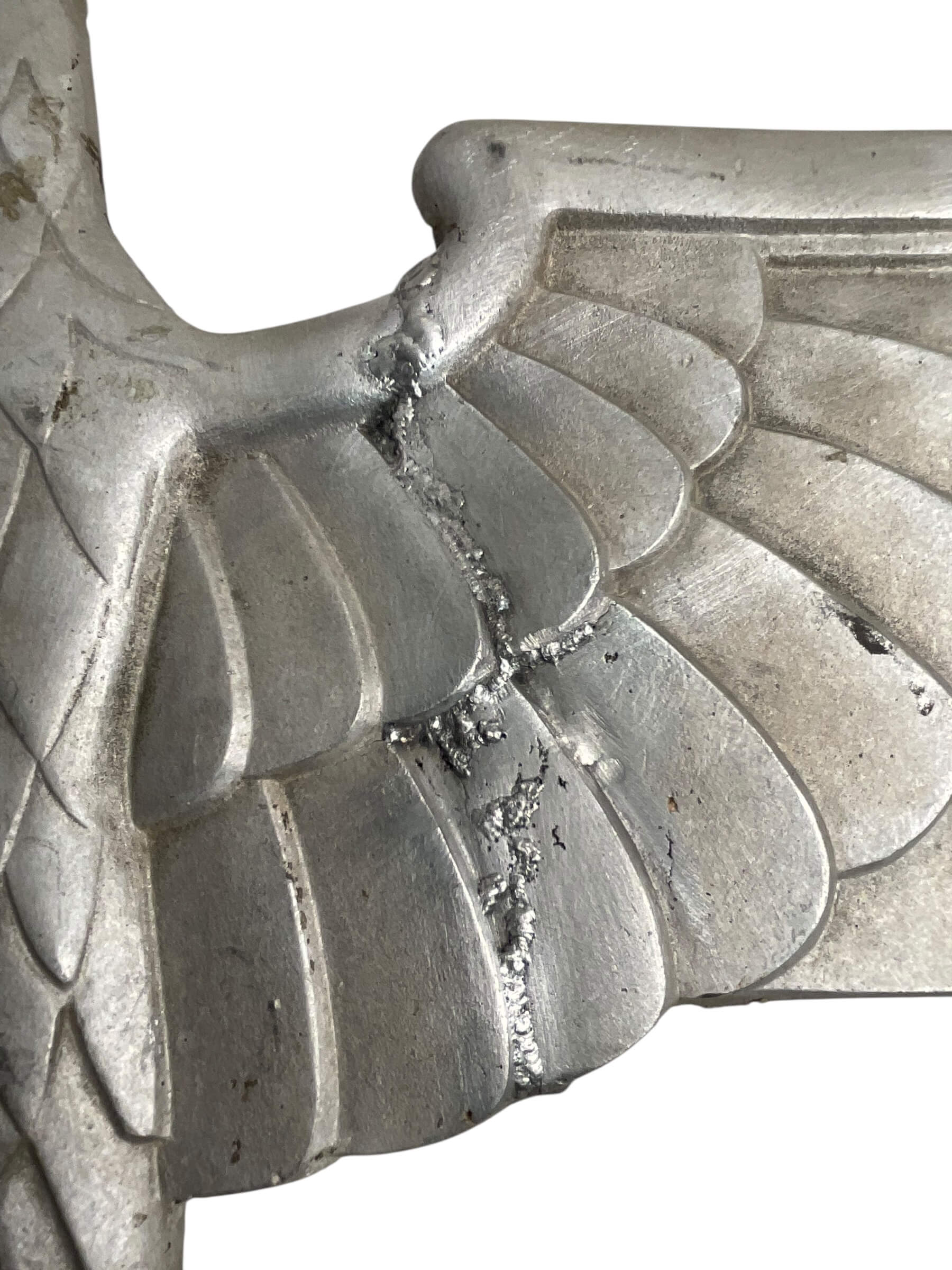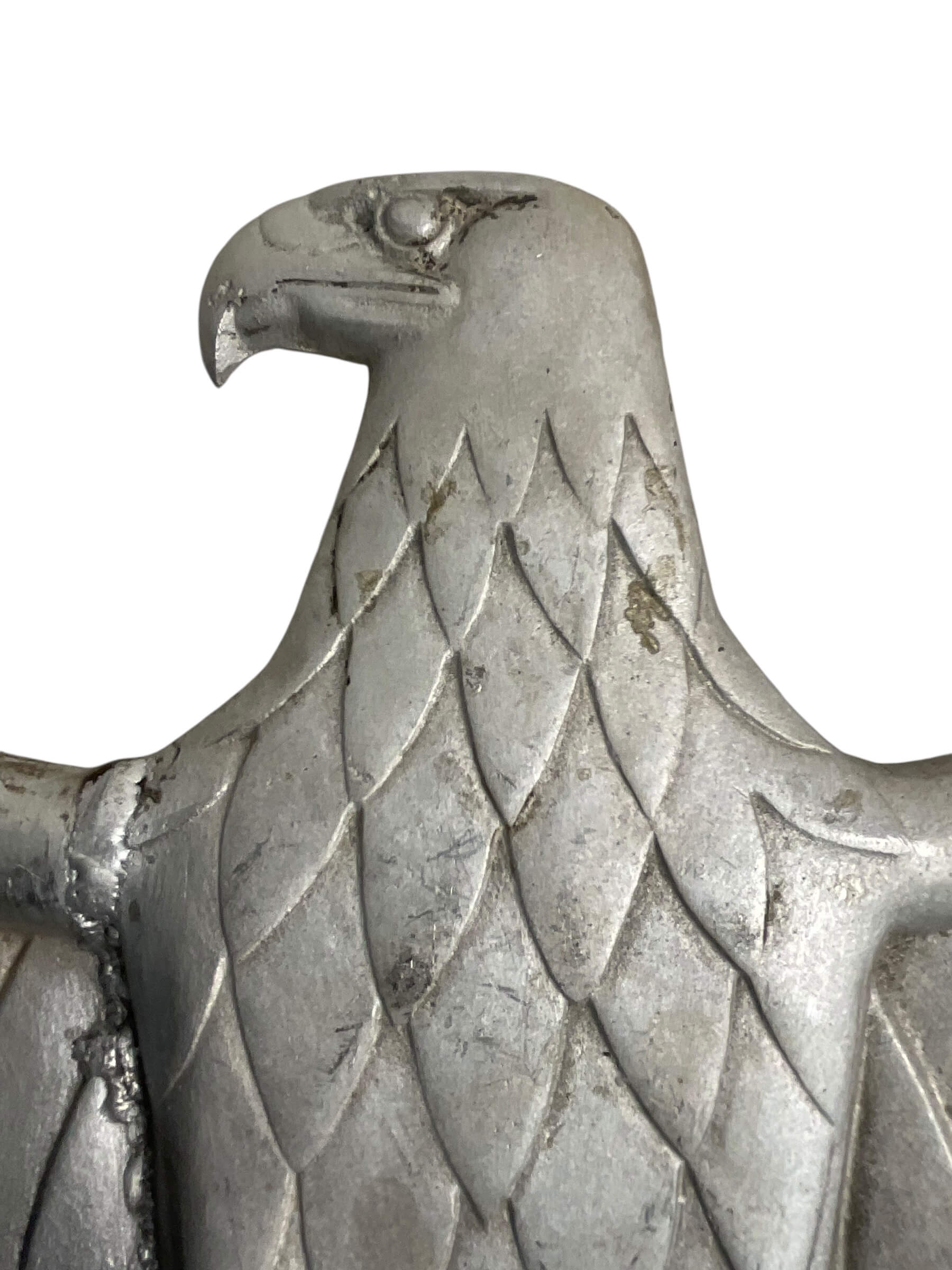 This item is a World War II German Railway Eagle constructed from aluminum. Such eagles were originally mounted on locomotives and railway stations in Germany during the Third Reich period, serving as prominent national emblems. This example retains its characteristic form, with outstretched wings and a centrally positioned swastika within a wreath, consistent with the standard design used by the Deutsche Reichsbahn between 1937 and 1945. The overall dimensions correspond to the typical sizes employed on railway rolling stock and have mounting holes consistent with original installation methods. Notably, this piece has undergone repairs, which are visible on close inspection and are reflected in the overall condition of the aluminum surface. These repairs do not affect any essential identifying features or iconography. This artifact offers a representation of the insignia used by German railway authorities during the Second World War and illustrates the stylized symbolism frequently associated with official Nazi-era objects.
