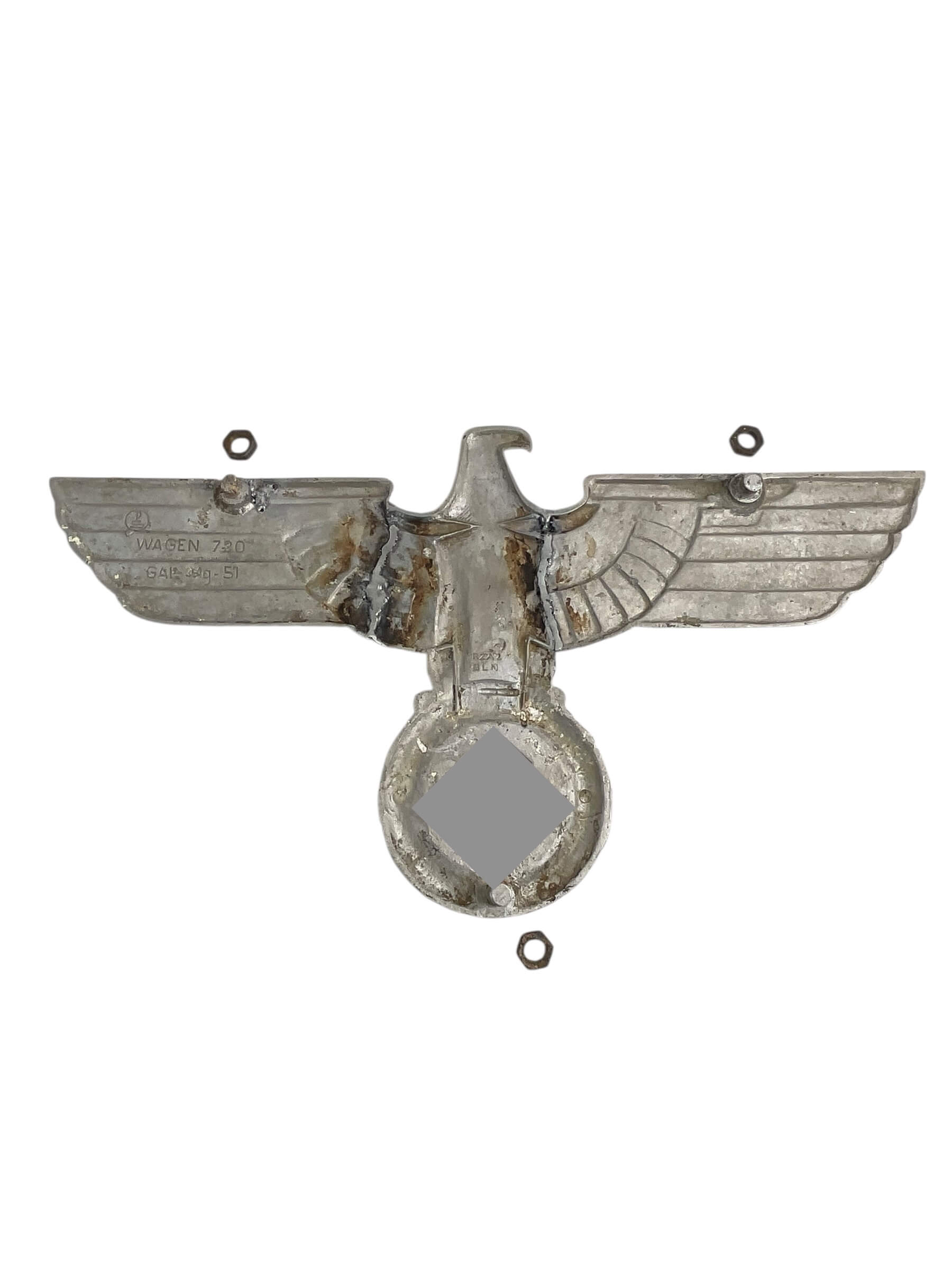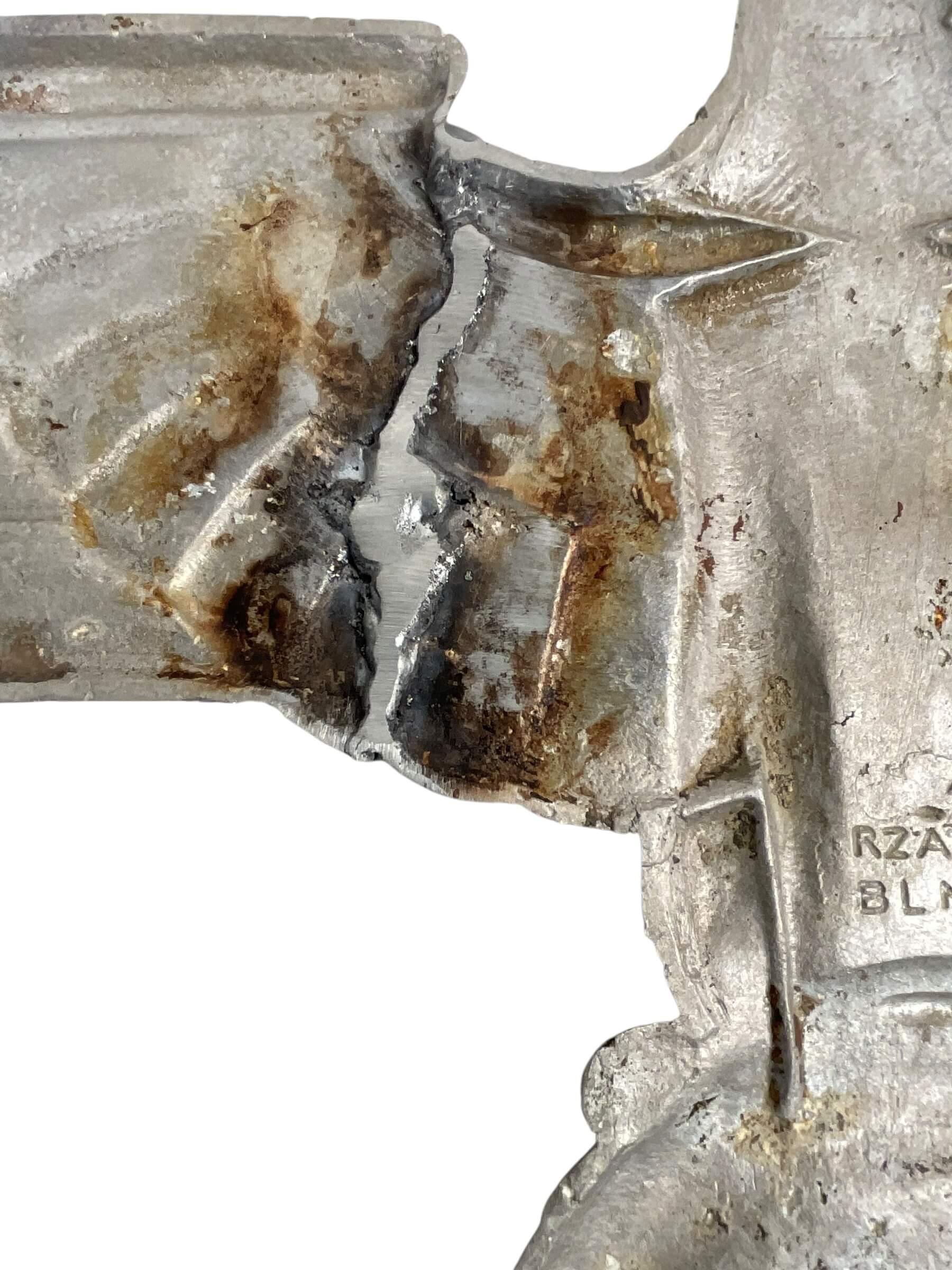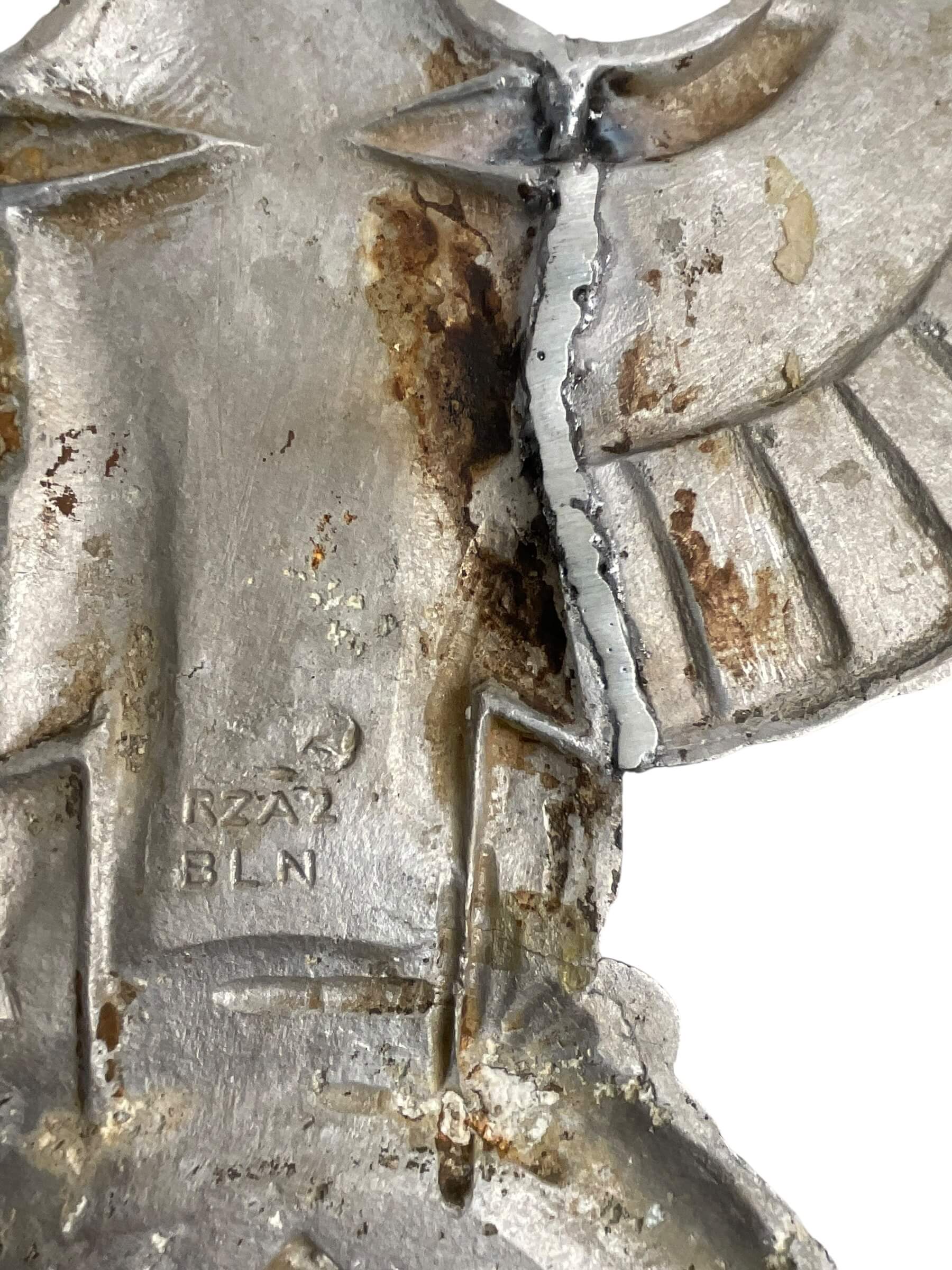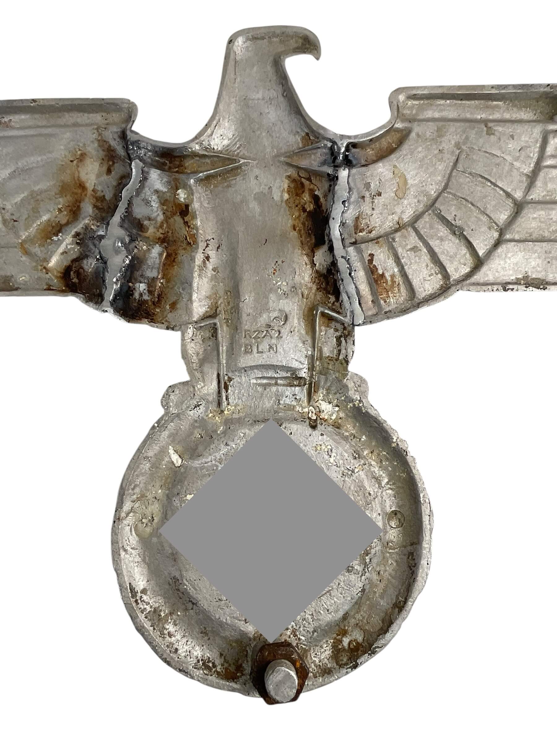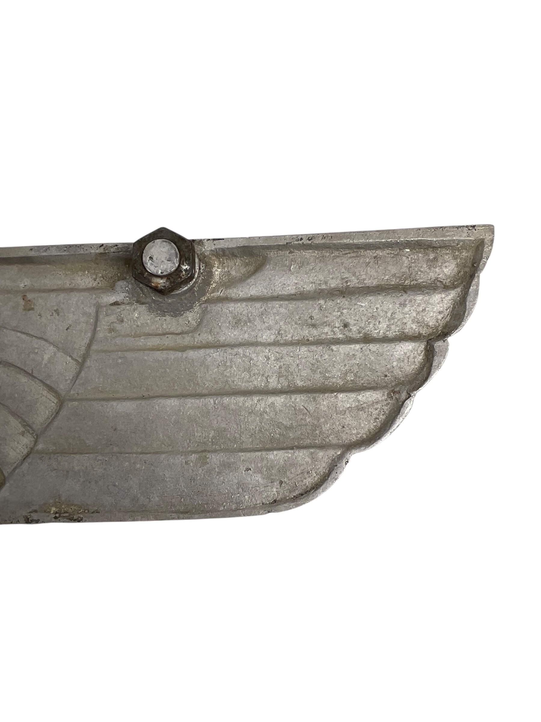 This item is a World War II German Railway Eagle constructed from aluminum. Such eagles were originally mounted on locomotives and railway stations in Germany during the Third Reich period, serving as prominent national emblems. This example retains its characteristic form, with outstretched wings and a centrally positioned swastika within a wreath, consistent with the standard design used by the Deutsche Reichsbahn between 1937 and 1945. The overall dimensions correspond to the typical sizes employed on railway rolling stock and have mounting holes consistent with original installation methods. Notably, this piece has undergone repairs, which are visible on close inspection and are reflected in the overall condition of the aluminum surface. These repairs do not affect any essential identifying features or iconography. This artifact offers a representation of the insignia used by German railway authorities during the Second World War and illustrates the stylized symbolism frequently associated with official Nazi-era objects.